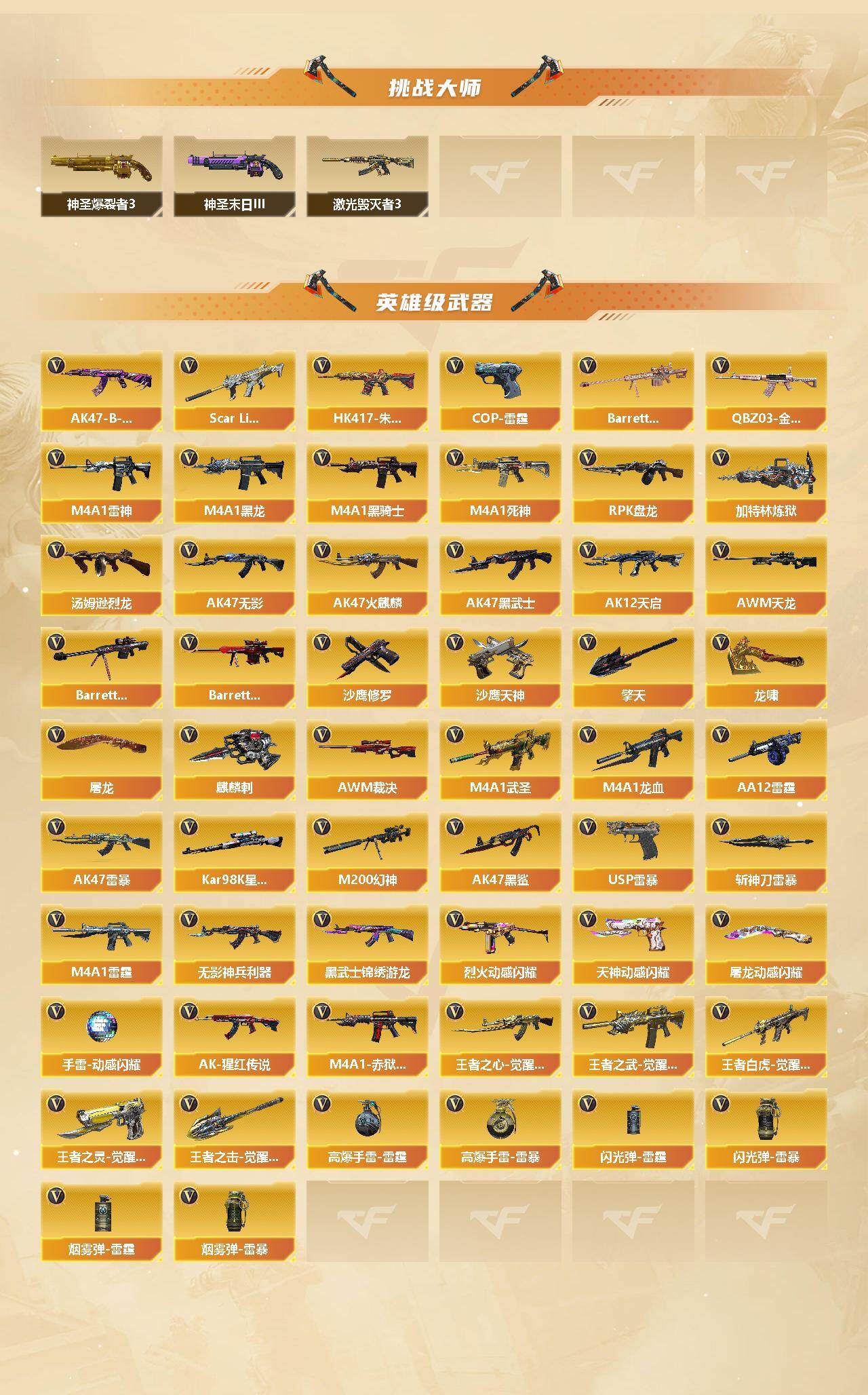 【英雄级武器】:AK47-火麒麟*2,M4A1-黑龙*2,M4A1-雷神,M4A1-黑骑士,AK47-无影,M4A1-死神,AK47-黑武士*3,AK12-天启,M4A1-武圣*3,AK47-黑鲨,M4A1-龙血*2,M4A1-雷霆,AK47-雷暴,HK417-朱雀,Scar Light-白虎,无影-神兵利器,黑武士-锦绣游龙,QBZ03-金色蔷薇,烈火-动感闪耀,王者之心-觉醒版,