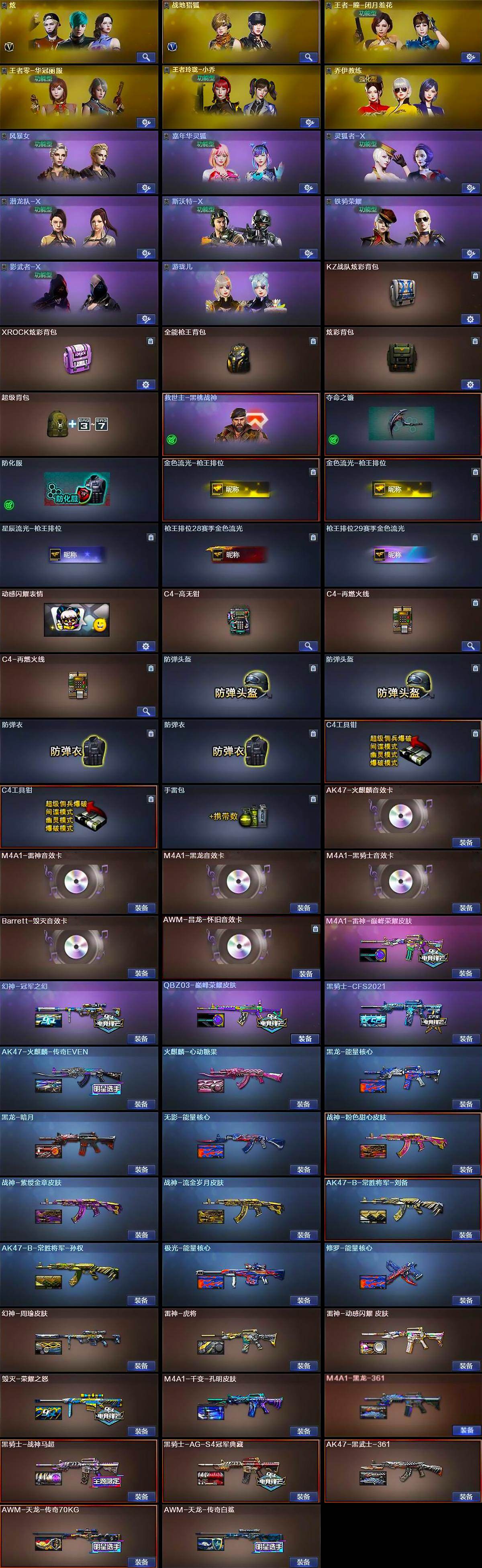 【皮肤】:幻神-周瑜皮肤,幻神-冠军之幻,QBZ03-巅峰荣耀皮肤,雷神-虎将,雷神-动感闪耀 皮肤,M4A1-雷神-巅峰荣耀皮肤,AK47-火麒麟-传奇EVEN,火麒麟-心动糖果,毁灭-荣耀之怒,M4A1-千变-孔明皮肤,黑龙-能量核心,黑龙-暗月,M4A1-黑龙-361,黑骑士-战神马超,黑骑士-CFS2021,黑骑士-AG-S4冠军典藏,无影-能量核心,AK47-黑武士-361,战神-粉色甜心皮肤,战神-紫绶金章皮肤,战神-流金岁月皮肤,AK47-B-常胜将军-刘备,AK47-B-常胜将军-孙权,AWM-天龙-传奇70KG,AWM-天龙-传奇白鲨,极光-能量核心,修罗-能量核心