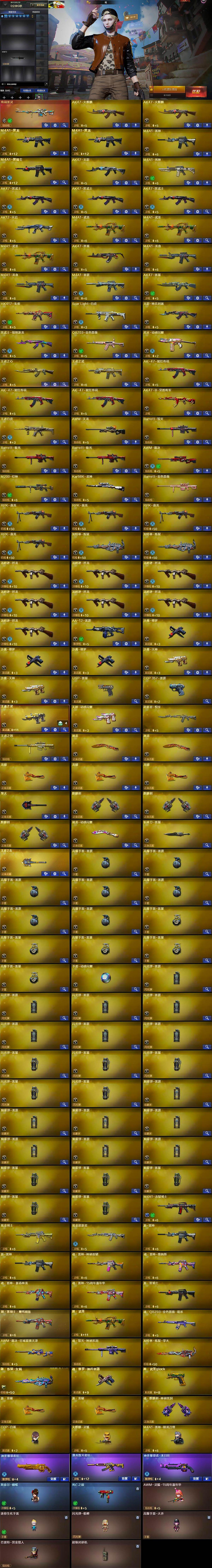 【热门武器】:传说圣灵,QBZ03-金色蔷薇,Scar Light-白虎,HK417-朱雀,M200-幻神,死亡之眼,Kar98K-星神,M4A1-黑骑士,汤姆逊-烈龙*7,RPK-盘龙*4,加特林-炼狱*2,斯泰尔-蝴蝶,COP-白鲨,USP-雷暴,沙鹰-修罗*3
