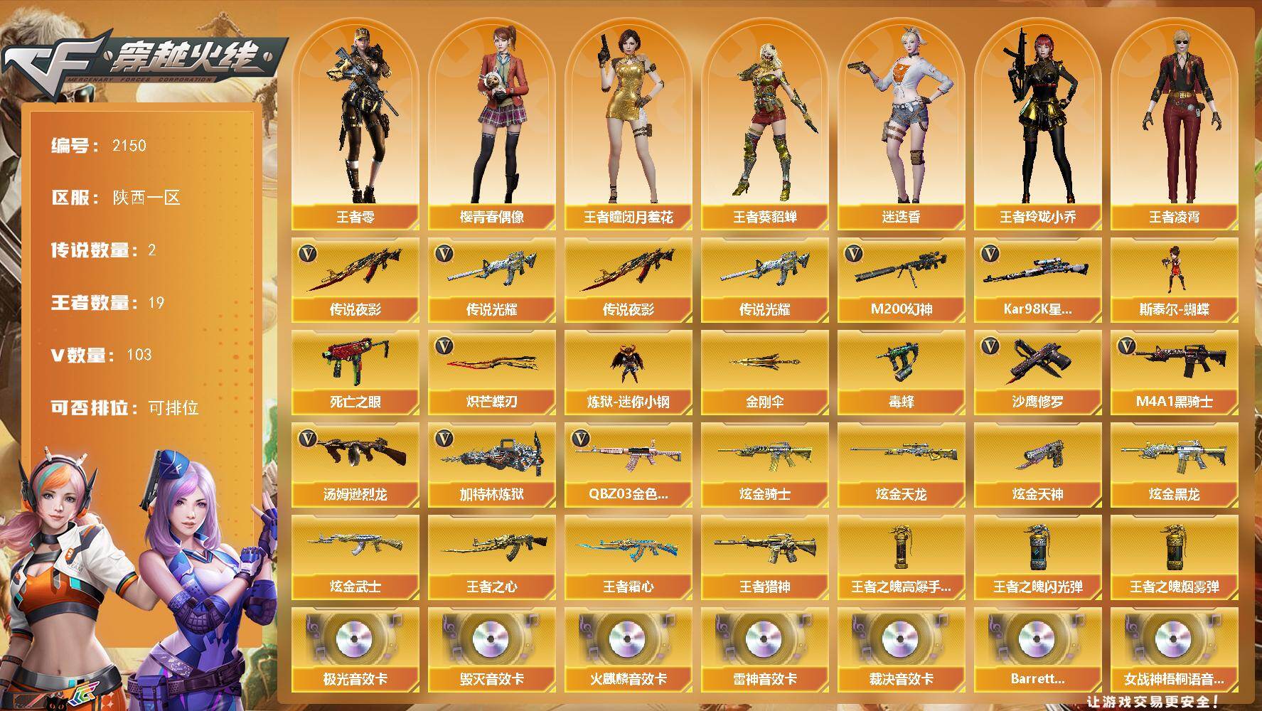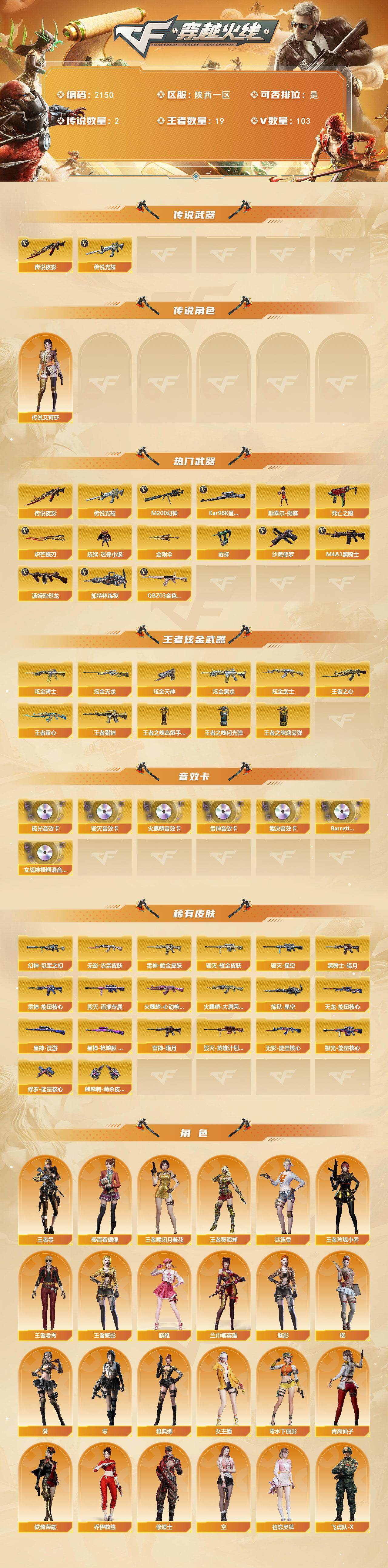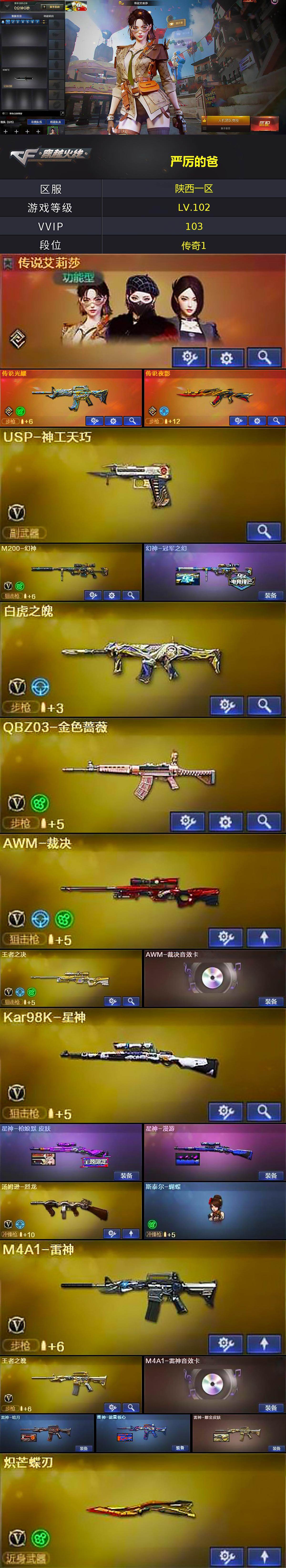 [16901650]陕西一区-120V-19王者武器数-5炫金武器数 【传说武器】:传说光耀,传说夜影 【传说角色】:传说艾莉莎 【热门武器】:传说光耀,传说夜影,QBZ03-金色蔷薇,M200-幻神,死亡之眼*2,Kar98K-星神,炼狱-迷你小钢,毒蜂*2,M4A1-黑骑士,汤姆逊-烈龙,加特林-炼狱,斯泰尔-蝴蝶,沙鹰-修罗*4,炽芒蝶刃,金刚伞 【王者炫金武器】:王者之心,王者霜心,王者猎神,炫金骑士,炫金黑龙,炫金武士,炫金天龙,炫金天神,王者之魄高爆手雷,王者之魄闪光弹,王者之魄烟雾弹 【音效卡】:AK47-火麒麟音效卡,M4A1-雷神音效卡,Barrett-毁灭音效卡,Barrett-极光音效卡,AWM-裁决音效卡,Barrett-碧霄极光音效卡,女战神梧桐语音包 【皮肤】:幻神-冠军之幻,星神-枪娘默 皮肤,星神-漫游,雷神-暗月,雷神-能量核心,雷神-耀金皮肤,火麒麟-大唐荣光,火麒麟-心动糖果,毁灭耀金皮肤,毁灭-星空,毁灭-直播专属,毁灭-英雄计划 皮肤,黑骑士-暗月,无影-能量核心,无影-霓裳皮肤,天龙-能量核心,极光-能量核心,炼狱-星空,修罗-能量核心,麒麟刺-萌杀皮肤 【角色】:零,葵,樱,魅影,迷迭香,兰-巾帼英雄,晴雅,王者-瞳-闭月羞花,王者-葵-貂蝉,王者-零,王者凌霄,王者-魅影,王者玲珑-小乔,乔伊教练,修道士,空,初恋灵狐,飞虎队-X,风暴女,嘉年华灵狐,娟娟,卡塔琳娜,猎狐者-追月,零-水下丽影,灵狐-花神,龙儿,萌儿,女主播,潘多拉-X,潘多拉-甜心教官,青霞仙子,蛇姬,斯沃特-X,铁骑荣耀,兔囡囡,樱-青春偶像,影武者-X,雅典娜 【人偶武器】:炼狱-迷你小钢,斯泰尔-蝴蝶,AWM-灵狐-15周年嘉年华,COP-旗袍 【暴走生化】:毒蜂*2,KAC-狂怒咆哮,死亡之眼*2,超级对讲机 【挑战大师】:神圣爆裂者III,激光毁灭者III,阐释者III 【英雄级武器】:AK47-火麒麟*5,M4A1-黑龙*2,M4A1-雷神,M4A1-黑骑士,AK47-无影*3,M4A1-死神,AK47-黑武士*2,AK12-天启,AN94-超新星*2,AK47-黑鲨,M4A1-龙血*2,QBZ03-天罚,M4A1-神工天巧,无影-神兵利器,黑武士-锦绣游龙,M4A1-玫瑰精灵,QBZ03-金色蔷薇,王者之心-觉醒版,王者之武-觉醒版,王者之魄-觉醒版,王