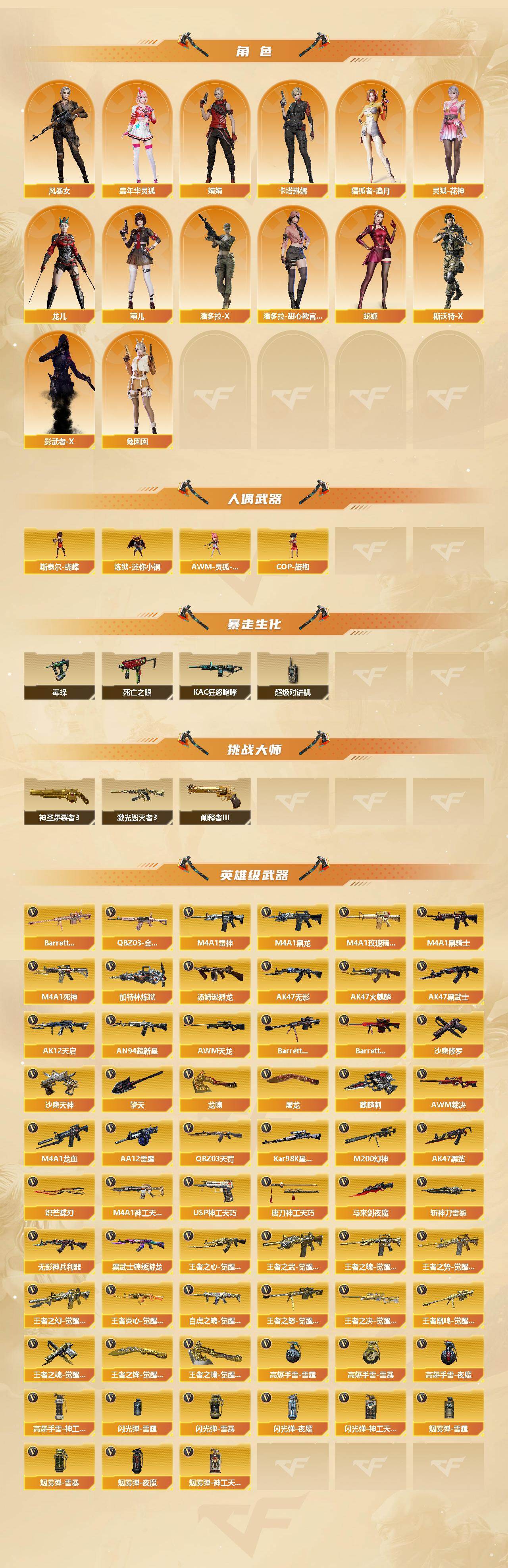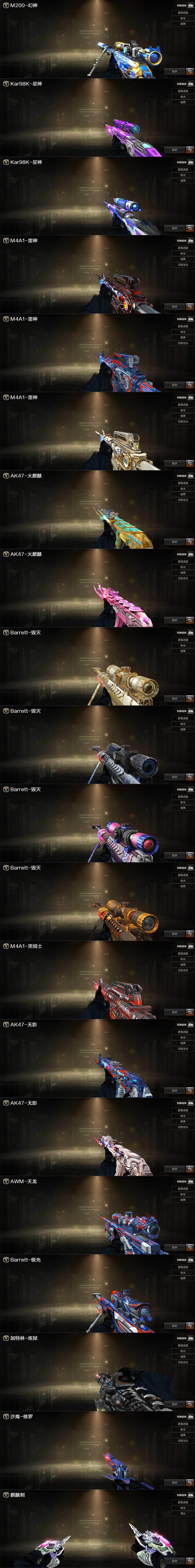【英雄级武器】:AK47-火麒麟*5,M4A1-黑龙*2,M4A1-雷神,M4A1-黑骑士,AK47-无影*3,M4A1-死神,AK47-黑武士*2,AK12-天启,AN94-超新星*2,AK47-黑鲨,M4A1-龙血*2,QBZ03-天罚,M4A1-神工天巧,无影-神兵利器,黑武士-锦绣游龙,M4A1-玫瑰精灵,QBZ03-金色蔷薇,王者之心-觉醒版,王者之武-觉醒版,王者之魄-觉醒版,王