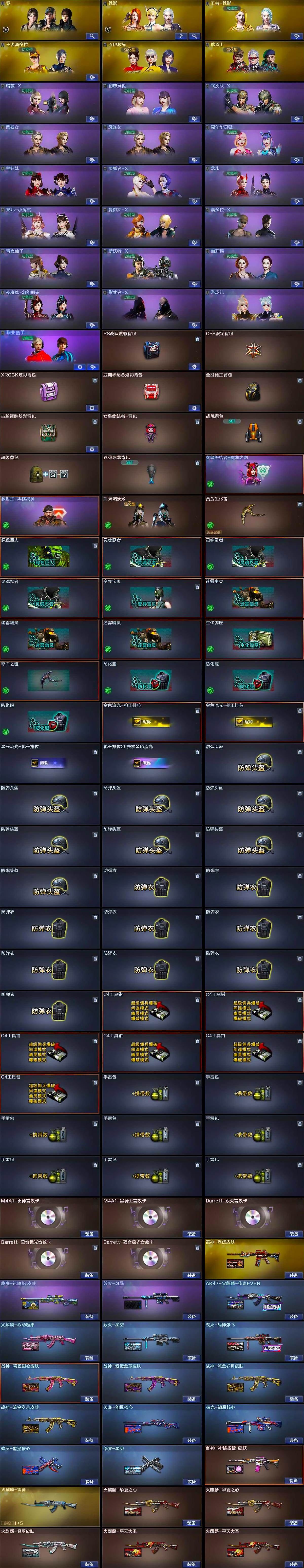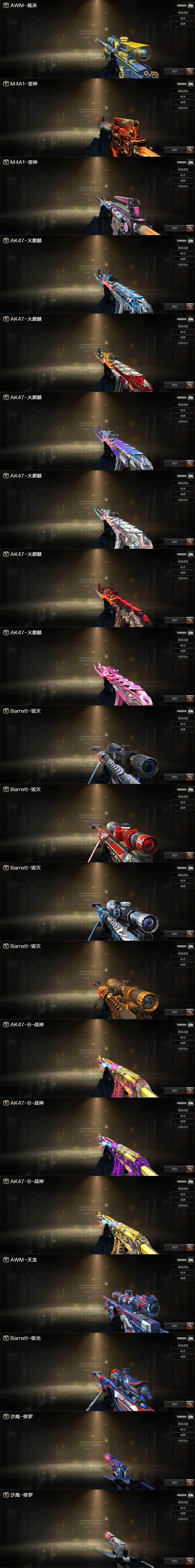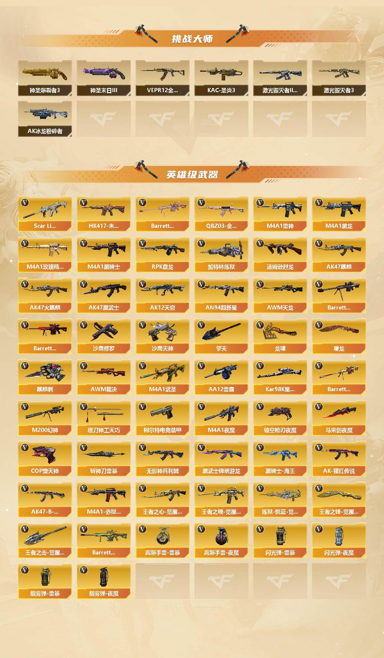 【英雄级武器】:AK47-火麒麟*2,AK47-麒麟,M4A1-黑龙*2,M4A1-雷神*2,M4A1-黑骑士,AK47-黑武士,AK12-天启,AN94-超新星,M4A1-武圣,HK417-朱雀,Scar Light-白虎,M4A1-夜魔,无影-神兵利器,黑武士-锦绣游龙,M4A1-玫瑰精灵,QBZ03-金色蔷薇,王者之心-觉醒版,王者之魄-觉醒版,AK-47-猩红传说*5,AK47-B-战神,黑骑士-海王,AWM-天龙*2,Barrett-毁灭