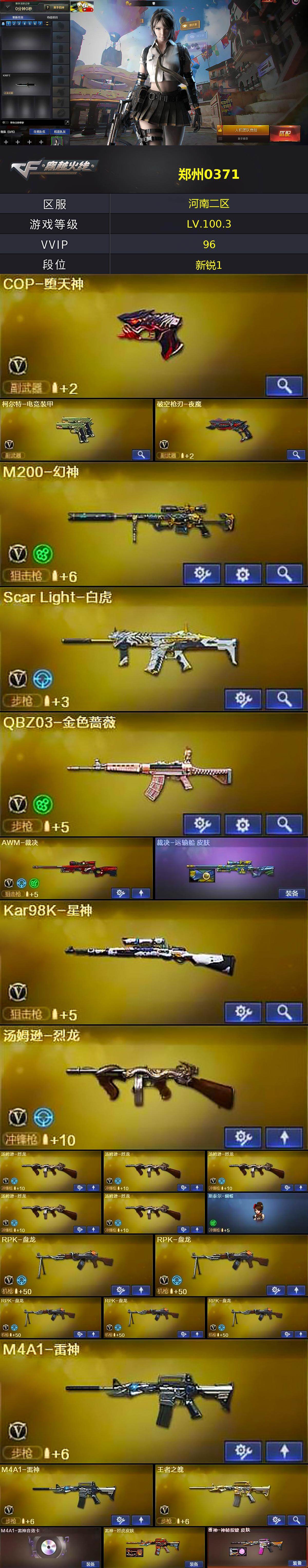 【热门武器】:QBZ03-金色蔷薇,Scar Light-白虎,HK417-朱雀,M200-幻神,死亡之眼,Kar98K-星神,炼狱-迷你小钢,M4A1-黑骑士,汤姆逊-烈龙*6,RPK-盘龙*5,加特林-炼狱,斯泰尔-蝴蝶,COP-堕天神,沙鹰-修罗*2