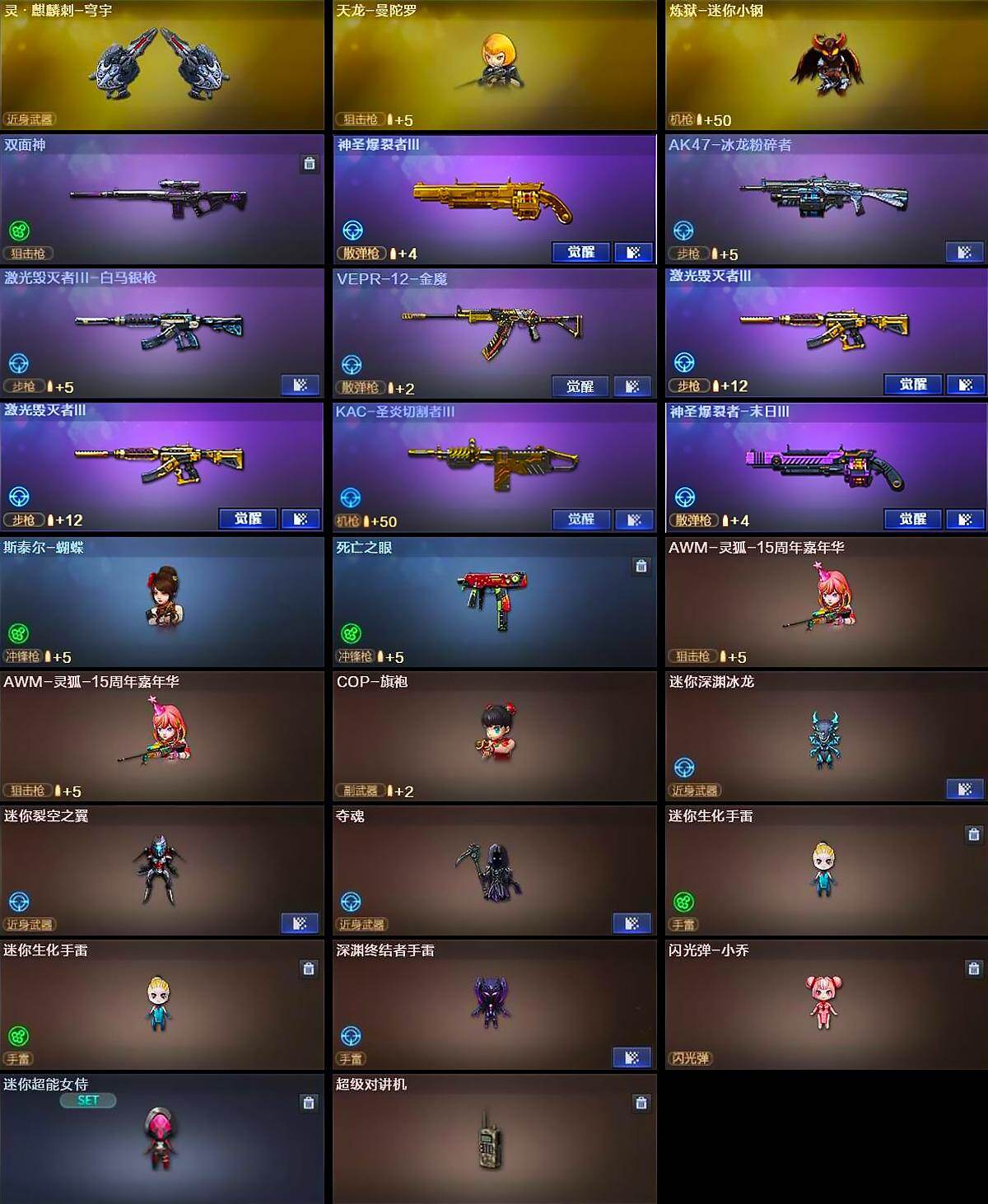 【人偶武器】:天龙-曼陀罗,炼狱-迷你小钢,斯泰尔-蝴蝶,AWM-灵狐-15周年嘉年华*2,COP-旗袍,迷你深渊冰龙,迷你裂空之翼,夺魂,迷你生化手雷*2,深渊终结者手雷,闪光弹-小乔,迷你超能女侍