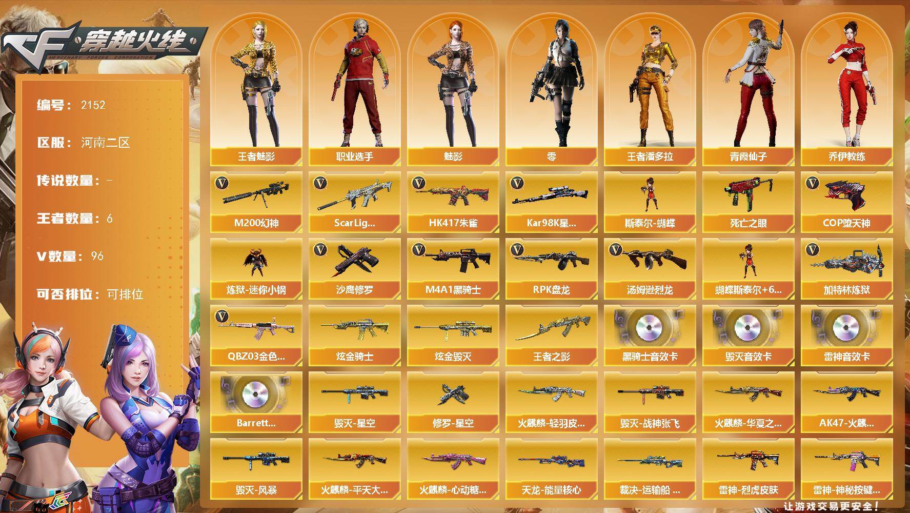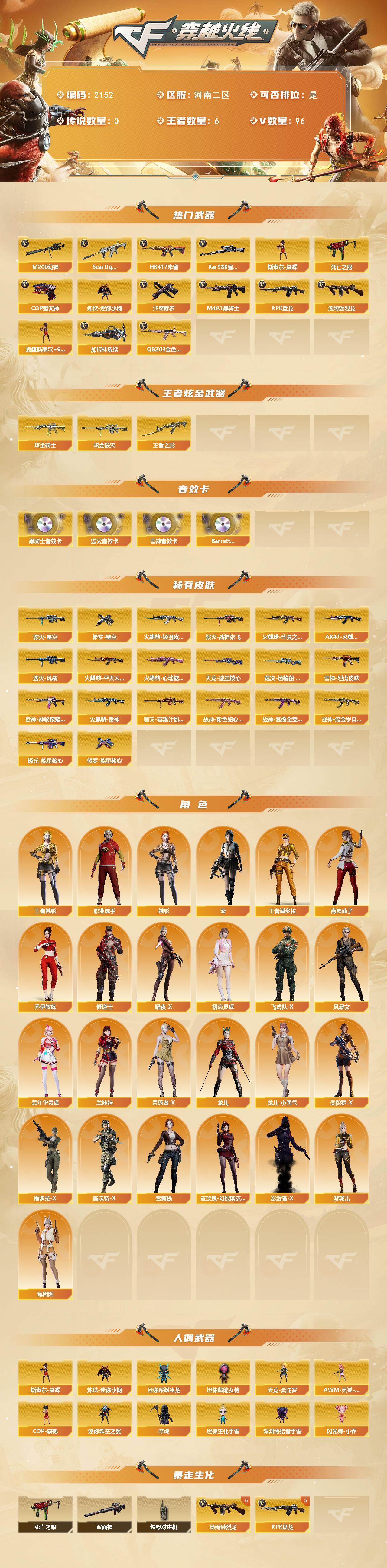 [16901839]河南二区-102V-6王者武器数-2炫金武器数 【热门武器】:QBZ03-金色蔷薇,Scar Light-白虎,HK417-朱雀,M200-幻神,死亡之眼,Kar98K-星神,炼狱-迷你小钢,M4A1-黑骑士,汤姆逊-烈龙*6,RPK-盘龙*5,加特林-炼狱,斯泰尔-蝴蝶,COP-堕天神,沙鹰-修罗*2 【王者炫金武器】:王者之影,炫金骑士,炫金毁灭 【音效卡】:M4A1-雷神音效卡,M4A1-黑骑士音效卡,Barrett-毁灭音效卡,Barrett-碧霄极光音效卡*2 【皮肤】:裁决-运输船 皮肤,雷神-烈虎皮肤,雷神-神秘按键 皮肤,火麒麟-雷神,火麒麟-华夏之心*2,AK47-火麒麟-传奇EVEN,火麒麟-轻羽皮肤,火麒麟-平天大圣*2,火麒麟-心动糖果,毁灭-星空,毁灭-战神张飞,毁灭-风暴,毁灭-英雄计划 皮肤,战神-粉色甜心皮肤,战神-紫绶金章皮肤,战神-流金岁月皮肤*2,天龙-能量核心,极光-能量核心,修罗-能量核心,修罗-星空 【角色】:零,魅影,王者-魅影,王者潘多拉,乔伊教练,修道士,暗夜-X,初恋灵狐,飞虎队-X,风暴女*2,嘉年华灵狐,兰妹妹,灵狐者-X,龙儿,龙儿-小淘气,曼陀罗-X,潘多拉-X,青霞仙子,斯沃特-X,兔囡囡,雪莉杨,夜玫瑰-幻能朋克,影武者-X,游珑儿,职业选手 【人偶武器】:天龙-曼陀罗,炼狱-迷你小钢,斯泰尔-蝴蝶,AWM-灵狐-15周年嘉年华*2,COP-旗袍,迷你深渊冰龙,迷你裂空之翼,夺魂,迷你生化手雷*2,深渊终结者手雷,闪光弹-小乔,迷你超能女侍 【暴走生化】:双面神,死亡之眼,超级对讲机 【挑战大师】:神圣爆裂者III,AK47-冰龙粉碎者,激光毁灭者III-白马银枪,VEPR-12-金魔,激光毁灭者III*2,KAC-圣炎切割者III,神圣爆裂者-末日III 【英雄级武器】:AK47-火麒麟*2,AK47-麒麟,M4A1-黑龙*2,M4A1-雷神*2,M4A1-黑骑士,AK47-黑武士,AK12-天启,AN94-超新星,M4A1-武圣,HK417-朱雀,Scar Light-白虎,M4A1-夜魔,无影-神兵利器,黑武士-锦绣游龙,M4A1-玫瑰精灵,QBZ03-金色蔷薇,王者之心-觉醒版,王者之魄-觉醒版,AK-47-猩红传说*5,AK47-B-战神,黑骑士-海王,AWM-天龙*2,Barrett-毁灭