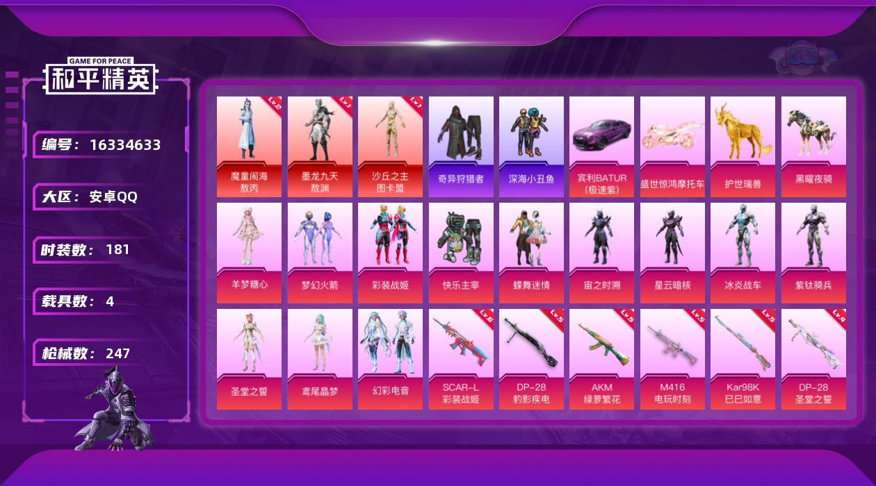[16334633]安卓 手Q-4神装-13粉装-14特效枪-4载具-12粉色飞行器-89847热力值-8王牌印记-181套装-247枪皮