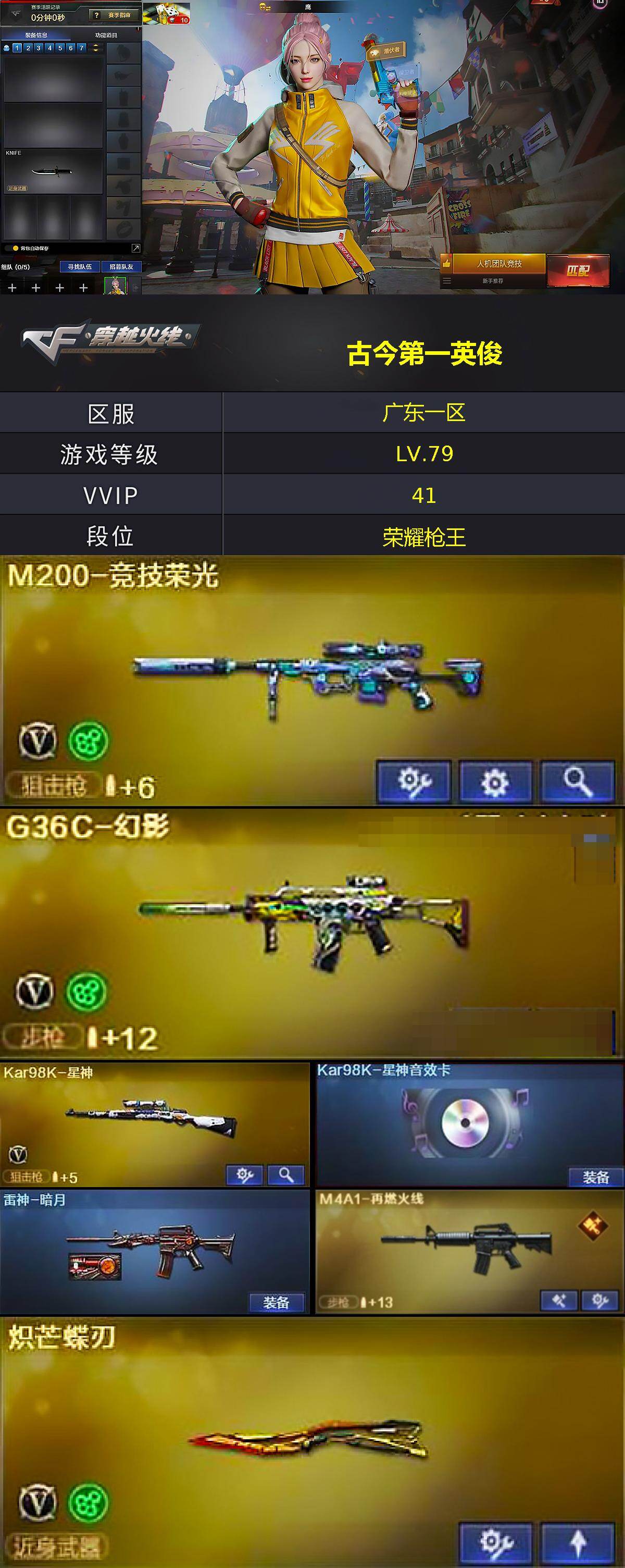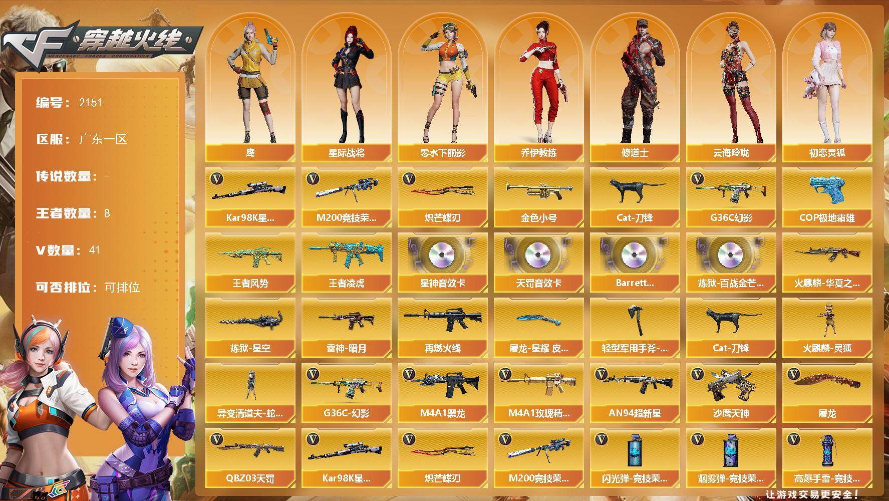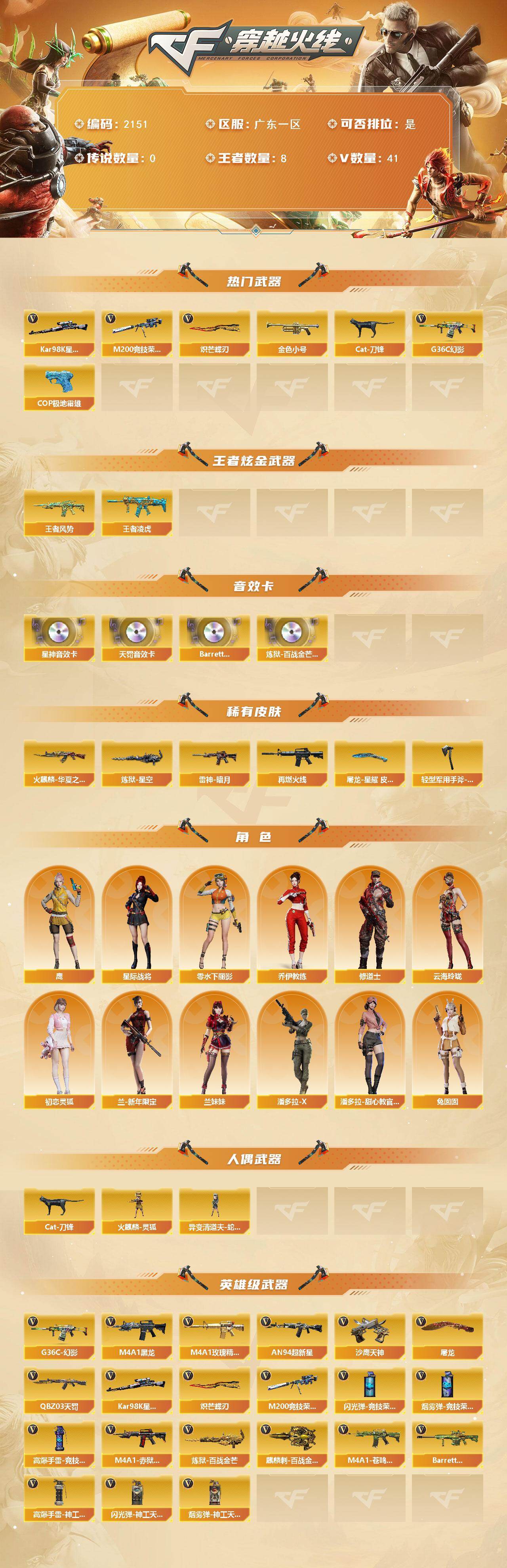 [16907899]广东一区-42V-8王者武器数-0炫金武器数 【热门武器】:G36C-幻影,M200-竞技荣光,Kar98K-星神,金色小号,Cat-刀锋,炽芒蝶刃,COP 357-极地霜雄 【王者炫金武器】:王者风势,王者凌虎 【音效卡】:Kar98K-星神音效卡,QBZ03-天罚音效卡,Barrett-碧霄极光音效卡*4,炼狱-百战金芒-庆典舞曲音效卡 【皮肤】:雷神-暗月,M4A1-再燃火线,火麒麟-华夏之心,炼狱-星空,屠龙-星耀 皮肤,轻型军用手斧-再燃火线 【角色】:鹰,星际战将,乔伊教练,修道士,云海玲珑,初恋灵狐,兰-新年限定,兰妹妹,零-水下丽影,潘多拉-X,潘多拉-甜心教官,兔囡囡 【人偶武器】:火麒麟-灵狐,异变清道夫-蛇影双骄,Cat-刀锋 【英雄级武器】:M4A1-黑龙,AN94-超新星,QBZ03-天罚,G36C-幻影,M4A1-玫瑰精灵,Kar98K-星神,M200-竞技荣光,炼狱-百战金芒,沙鹰-天神*2,屠龙,炽芒蝶刃,麒麟刺-百战金芒,高爆手雷-竞技荣光*2,高爆手雷-神工天巧*3,闪光弹-竞技荣光*2,闪光弹-神工天巧*3,烟雾弹-竞技荣光*2,烟雾弹-神工天巧*2,M4A1-赤狱骑士,M4A1-苍鸣雷神,Barrett-碧霄极光 【道具】:云山科技背包,亚洲杯纪念炫彩背包,炫彩背包,百战金芒炫彩背包,裂空之翼背包-金色,黄金曼提柯尔的背包,女皇终结者-魔龙之吻,救世主-黑桃战神,黄金生化钩,绿色巨人,灵魂忍者*2,变异宝贝,妖姬,迷雾幽灵*2,夺命之镰,防化服*3,语音特效-盛典烟火,萌萌小葵表情,C4-黑曜,C4-沙漠,防弹头盔*3,防弹衣*3,C4工具钳*3,手雷包*3 【特殊枪械】: