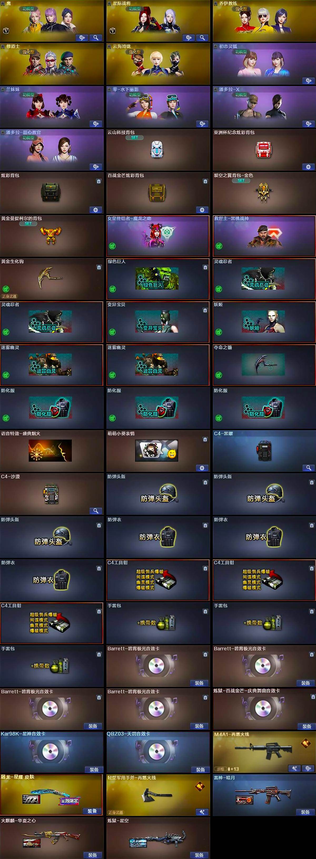 【道具】:云山科技背包,亚洲杯纪念炫彩背包,炫彩背包,百战金芒炫彩背包,裂空之翼背包-金色,黄金曼提柯尔的背包,女皇终结者-魔龙之吻,救世主-黑桃战神,黄金生化钩,绿色巨人,灵魂忍者*2,变异宝贝,妖姬,迷雾幽灵*2,夺命之镰,防化服*3,语音特效-盛典烟火,萌萌小葵表情,C4-黑曜,C4-沙漠,防弹头盔*3,防弹衣*3,C4工具钳*3,手雷包*3