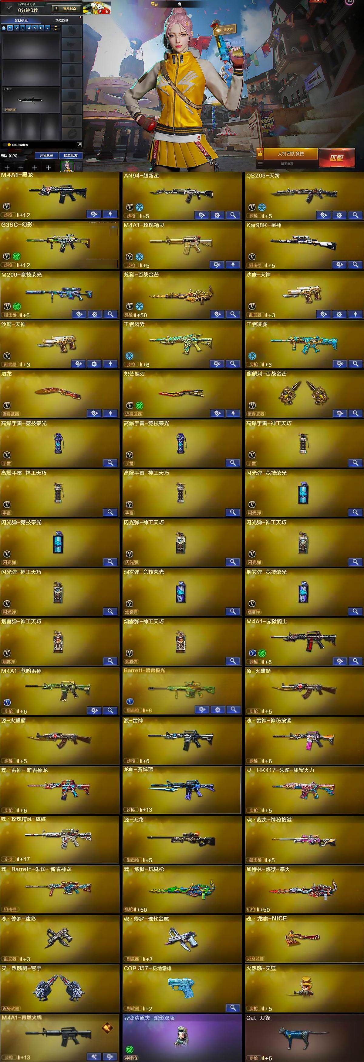 【英雄级武器】:M4A1-黑龙,AN94-超新星,QBZ03-天罚,G36C-幻影,M4A1-玫瑰精灵,Kar98K-星神,M200-竞技荣光,炼狱-百战金芒,沙鹰-天神*2,屠龙,炽芒蝶刃,麒麟刺-百战金芒,高爆手雷-竞技荣光*2,高爆手雷-神工天巧*3,闪光弹-竞技荣光*2,闪光弹-神工天巧*3,烟雾弹-竞技荣光*2,烟雾弹-神工天巧*2,M4A1-赤狱骑士,M4A1-苍鸣雷神,Barrett-碧霄极光