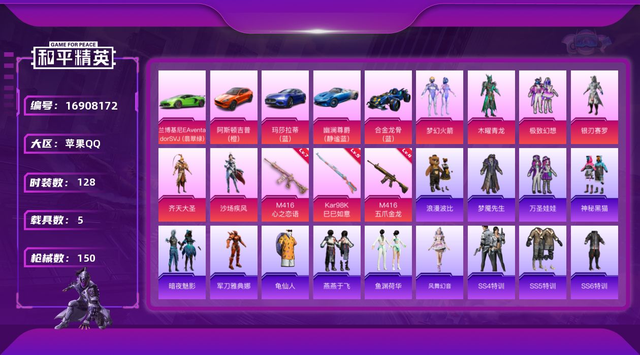 [16908172]【特价出售/店主推荐】苹果 手Q-6粉装-3特效枪-5载具-1粉色飞行器-55777热力值-6王牌印记-128套装-150枪皮 【热门品类】:粉装-梦幻火箭,角色-军刀雅典娜,套装-龟仙人,套装-浪漫波比 【粉色套装】:粉装-木曜青龙,粉装-梦幻火箭,粉装-极致幻想,粉装-银刃赛罗,粉装-齐天大圣,粉装-沙场疾风 【粉色枪皮等级】:M416-五爪金龙(四级),M416-心之恋语(七级),Kar98K-巳巳如意(五级) 【粉色载具】:兰博基尼Aventador SVJ(翡翠绿),阿斯顿马丁DBX(橙),玛莎拉蒂Ghibli(蓝),幽澜尊爵(静谧蓝),合金龙骨(蓝) 【粉色枪皮】:M416-五爪金龙,M416-心之恋语,Kar98K-巳巳如意 【粉色飞行器】:梦幻火箭飞行器 【粉色降落伞】:凝视深渊降落伞,梦幻火箭降落伞,华贵君王降落伞,古堡领主降落伞,四圣焕新降落伞,银刃赛罗降落伞,暗夜玫瑰降落伞,林间仙鹿降落伞,洛神天依降落伞,天星战神降落伞 【稀有套装】:套装-龟仙人,套装-燕燕于飞,套装-鱼渊荷华,套装-风舞幻音 【稀有枪皮】:AKM-PEL轰鸣竞梦者,AKM-四圣焕新,AKM-彩虹符号,AKM-玉龙,AKM-萌趣颜团子,AKM-虎虎生威,AKM-霓虹街区,AKM-龙的传人,M16A4-魔法学院,SCAR-L-扶摇飞仙,SCAR-L-暗夜玫瑰,SCAR-L-玉兔迎春,SCAR-L-金风玉露,SCAR-L-龙宫之主,M416-红色方程式,M416-绯红前夜,M416-蓝色火焰,GROZA-懵萌河马,GROZA-蓝莓炮弹,GROZA-银河战甲,GROZA-黑色刀锋,QBZ-原初圣火,QBZ-彩虹符号,QBZ-洛神天依,QBZ-诡娃娃,M762-天降萌叽,M762-拳皇97,M762-深海曼妙,M762-牛气冲天,M762-瑞龙福将,M762-诡娃娃,Mk47-洛神天依,G36C-懵萌河马,G36C-暗夜玫瑰,AC-VAL-天降萌叽,蜜獾-天降萌叽,UZI-古堡领主,UZI-天降萌叽,UZI-炫彩节奏,UMP45-圣诞大吉,UMP45-春暖花开,UMP45-生命誓言,UMP45-诡娃娃,Vector-暗夜玫瑰,Vector-黑色刀锋,汤姆逊-勇闯险境,汤姆逊-天降萌叽,汤姆逊-炫彩节奏,野牛-扶摇飞仙,Kar98K-勇闯险境,Kar98K-古堡领主,Kar98K-梦