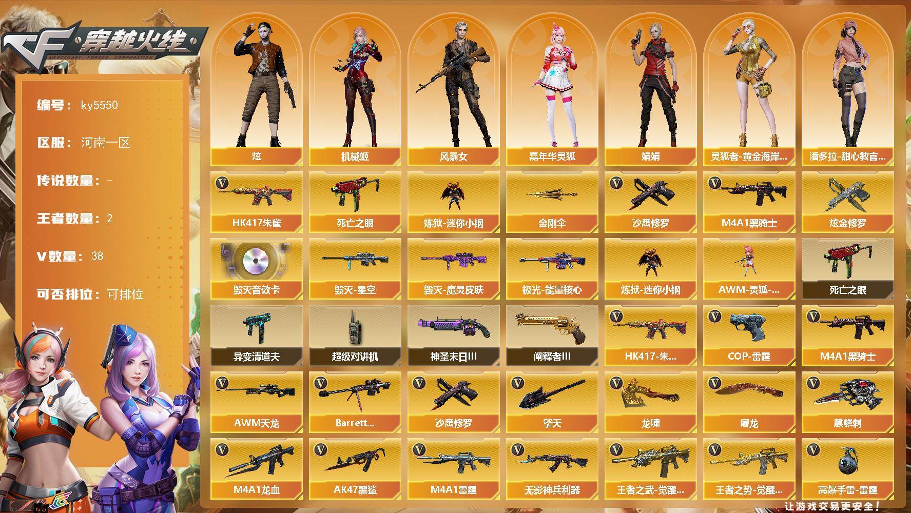- [13140598]四川一区-38V-10王者-0炫金 【热门武器】:QBZ03-金色蔷薇,Scar Light-白虎,M200-幻神,汤姆逊-烈龙,沙鹰-修罗*2 【王者炫金武器】:超新星-悦享,王者玉锋 【音效卡】:Kar98K-星神音效卡,死神-雪域霜狐-怀旧音效卡 【皮肤】:幻神-电流骇客 皮肤,裁决-羽掣 皮肤,裁决-叶芒苍灵 皮肤,雷神-荣耀之魄,雷神-R.LGD-CFPLS18冠军,炼狱-星空,修罗-星空,屠龙-荣耀之锋,屠龙-春桃 皮肤 【角色】:战地猎狐,王者-魅影,雪域霜狐,奇洋探员,修道士,云海玲珑,暗夜-X,飞虎队-X,嘉年华灵狐,娟娟,兰-新年限定,0号玩家,灵狐者-X,麻雀,曼陀罗-X,萌儿,潘多拉-X,斯沃特-X,兔囡囡,铁扇公主-暗灵,游珑儿 【人偶武器】:AWM-灵狐-15周年嘉年华,生化手雷-机甲核心*2 【暴走生化】:双面神,超级对讲机 【挑战大师】:冰龙粉碎者-白马银枪,神圣爆裂者-末日III 【英雄级武器】:M4A1-雷神*2,Scar Light-白虎,QBZ03-云龙,黑武士-锦绣游龙,超新星-热带奇洋,死神-雪域霜狐,QBZ03-金色蔷薇,AWM-裁决,M200-幻神,王者蔷薇-觉醒版,王者风神-觉醒版,汤姆逊-烈龙,烈龙-云海游龙,沙鹰-修罗*2,沙鹰-天神,COP 357-云龙,屠龙,擎天-云海游龙,龙啸-热带奇洋,斩神刀-雷暴,屠龙-云海游龙,高爆手雷-雷暴*2,高爆手雷-幻灵,高爆手雷-竞技荣光,高爆手雷-云龙*2,手雷-云海游龙,手雷-热带奇洋,高爆手雷-雷霆王者*2,闪光弹-雷暴,闪光弹-竞技荣光,闪光弹-云龙*2,烟雾弹-雷暴,烟雾弹-竞技荣光,烟雾弹-云龙*2,M4A1-赤狱骑士 【特殊枪械】:1白虎,1烈龙