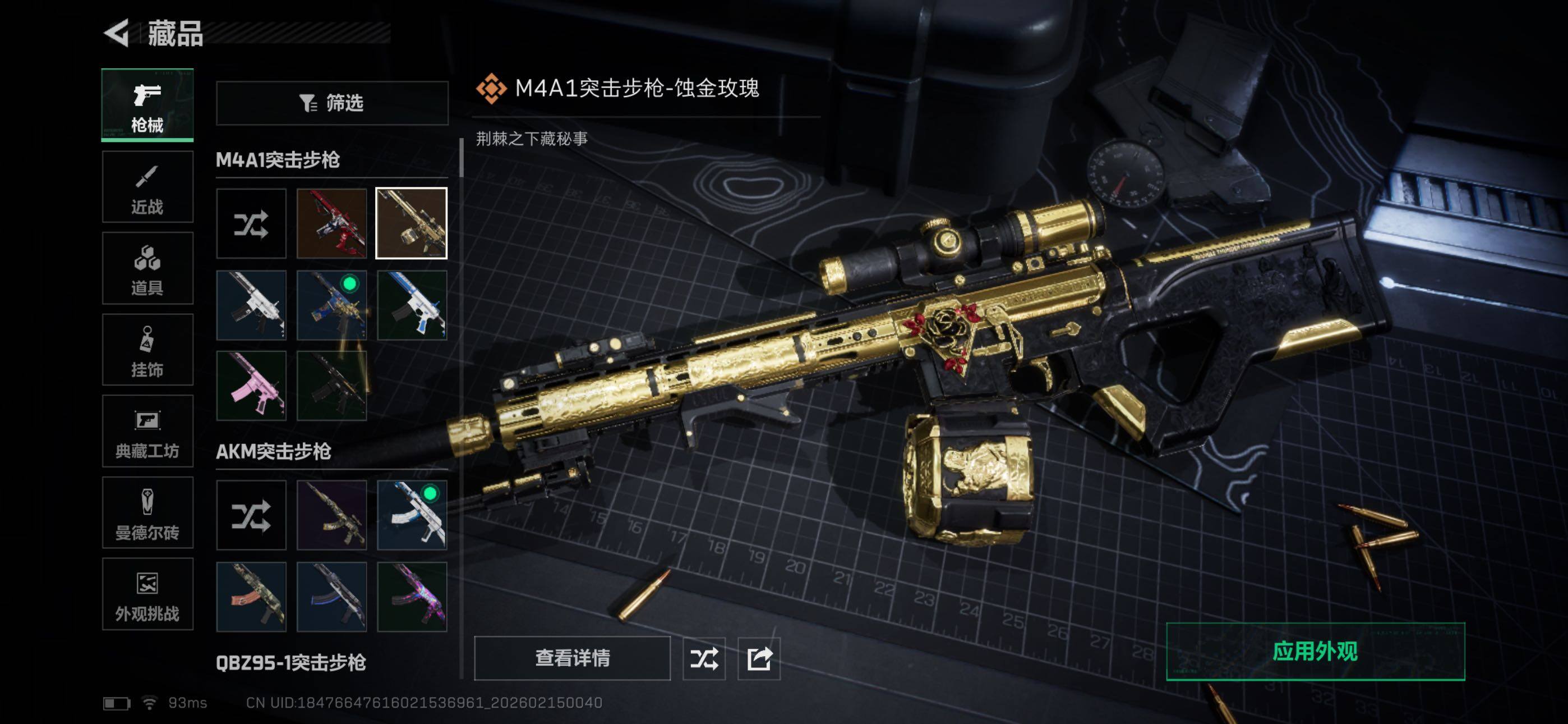 【传说外观】:M4A1突击步枪-蚀金玫瑰,M4A1突击步枪-阿米娅,SG552突击步枪-运动员,AK-12突击步枪-夜鹰,AK-12突击步枪-特斯拉线圈,SCAR-H战斗步枪-启航,G3战斗步枪-骑士,CAR-15突击步枪-阿米娅,腾龙突击步枪-捞点薯条,K437突击步枪-北极星,KC17突击步枪-电锯惊魂,UZI冲锋枪-特斯拉线圈,SR-3M紧凑突击步枪-特斯拉线圈,勇士冲锋枪-能天使-午夜邮差,QCQ171冲锋枪-北极星,725双管霰弹枪-送葬人-无题密令,M250通用机枪-骑士之心,M14射手步枪-蛮荒,SKS射手步枪-骑士,AWM狙击步枪-捞点薯条,93R-捞点薯条,复合弓-黑·天际线