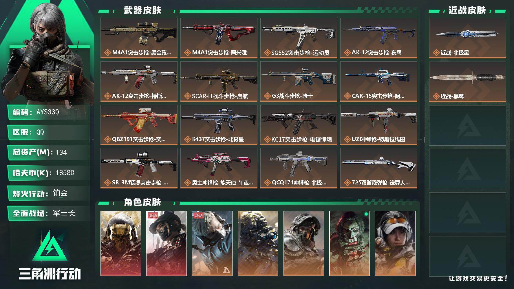 [16911054]有手册 134m总资产-18580k哈伏币-60烽火等级-铂金-50战场等级-军士长 【干员外观】:红狼-蚀金玫瑰,露娜-黑·天际线,蜂医-送葬人·无题密令,无名-夜鹰,深蓝-不破誓约,红狼-电锯惊魂,露娜-金牌射手 【近战皮肤】:近战-北极星,近战-黑鹰 【传说外观】:M4A1突击步枪-蚀金玫瑰,M4A1突击步枪-阿米娅,SG552突击步枪-运动员,AK-12突击步枪-夜鹰,AK-12突击步枪-特斯拉线圈,SCAR-H战斗步枪-启航,G3战斗步枪-骑士,CAR-15突击步枪-阿米娅,腾龙突击步枪-捞点薯条,K437突击步枪-北极星,KC17突击步枪-电锯惊魂,UZI冲锋枪-特斯拉线圈,SR-3M紧凑突击步枪-特斯拉线圈,勇士冲锋枪-能天使-午夜邮差,QCQ171冲锋枪-北极星,725双管霰弹枪-送葬人-无题密令,M250通用机枪-骑士之心,M14射手步枪-蛮荒,SKS射手步枪-骑士,AWM狙击步枪-捞点薯条,93R-捞点薯条,复合弓-黑·天际线 【史诗外观】:AKM突击步枪-林中猎手,QBZ95-1突击步枪-曙光,ASh-12战斗步枪-守夜人,ASh-12战斗步枪-无极限,K416突击步枪-冬日风情,M16A4突击步枪-竞赛选手,AUG突击步枪-蝮蛇,M7战斗步枪-百步穿杨,SG552突击步枪-尖端治疗,SG552突击步枪-深海恐惧,SCAR-H战斗步枪-囚徒,G3战斗步枪-流沙送葬,AS Val突击步枪-尖端治疗,AS Val突击步枪-典狱官,AS Val突击步枪-百步穿杨,腾龙突击步枪-无垢,K437突击步枪-守护者,MP5冲锋枪-深海恐惧,MP5冲锋枪-战术竞备,MP5冲锋枪-竞技风,P90冲锋枪-暗影猎手,P90冲锋枪-莫斯提马,Vector冲锋枪-猎鳄行动,Vector冲锋枪-百步穿杨,Vector冲锋枪-异域战争,SR-3M紧凑突击步枪-荒野求生,SR-3M紧凑突击步枪-战术竞备,勇士冲锋枪-深海恐惧,勇士冲锋枪-工业狂潮,MP7冲锋枪-无垢,MP7冲锋枪-守护者,M1014霰弹枪-林中猎手,S12K霰弹枪-曙光,PKM通用机枪-蝮蛇,PKM通用机枪-守夜人,PKM通用机枪-荒野求生,M249轻机枪-丛影谍踪,M250通用机枪-囚徒,Mini-14射手步枪-守护者,SVD狙击步枪-阿萨拉工艺,SVD狙击步枪-荒野求生, M14射手步枪-航天庆典,SR