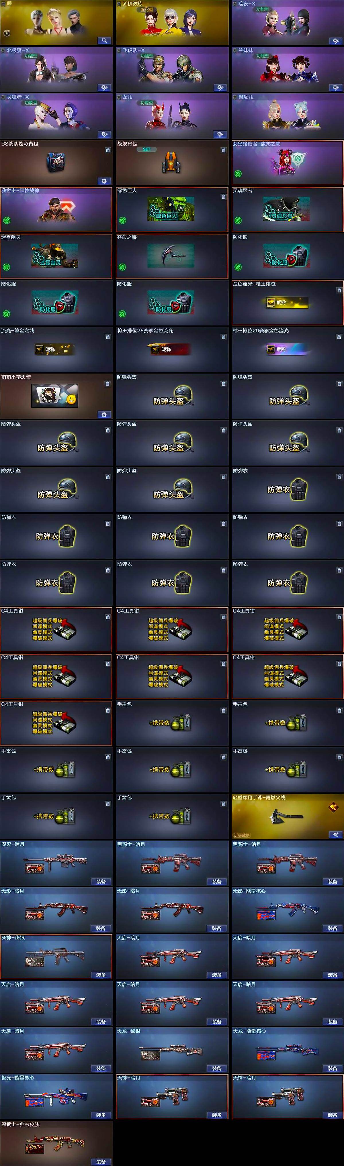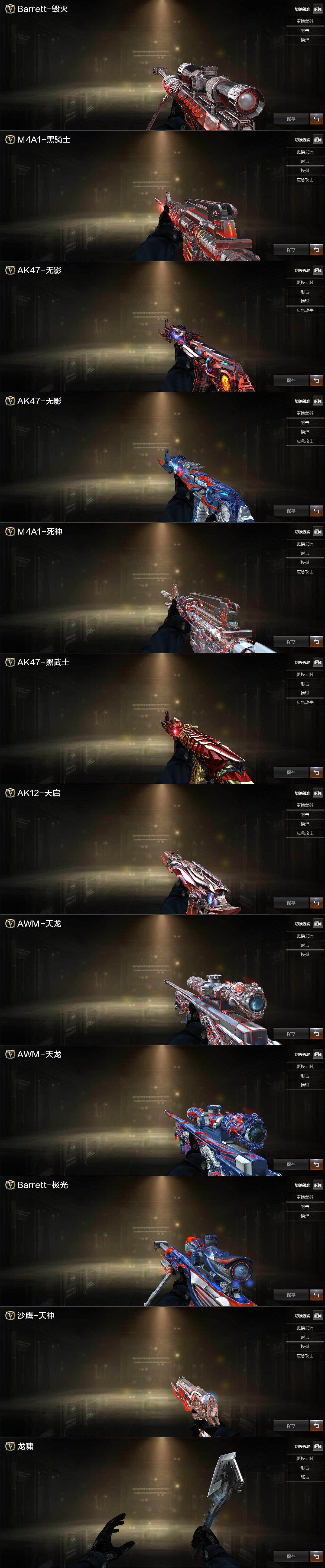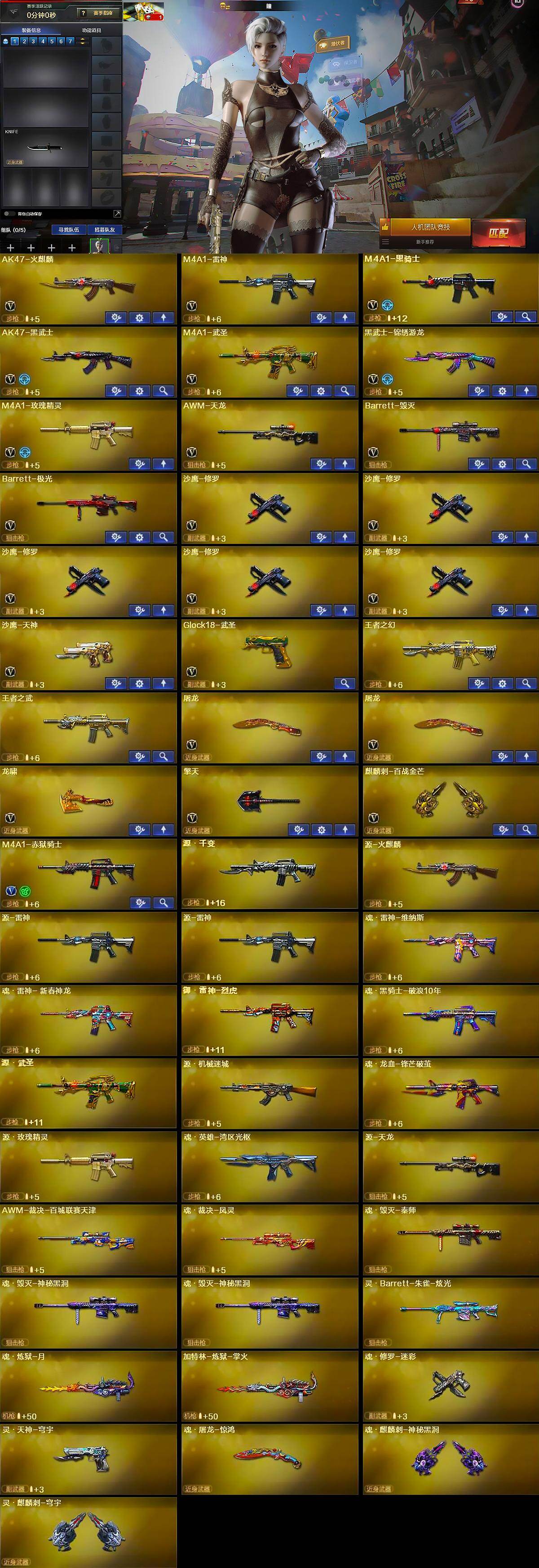 【英雄级武器】:AK47-火麒麟,M4A1-雷神,M4A1-黑骑士,AK47-黑武士,M4A1-武圣,黑武士-锦绣游龙,M4A1-玫瑰精灵,AWM-天龙,Barrett-毁灭,Barrett-极光,沙鹰-修罗*5,沙鹰-天神,Glock18-武圣,屠龙*2,龙啸,擎天,麒麟刺-百战金芒,M4A1-赤狱骑士