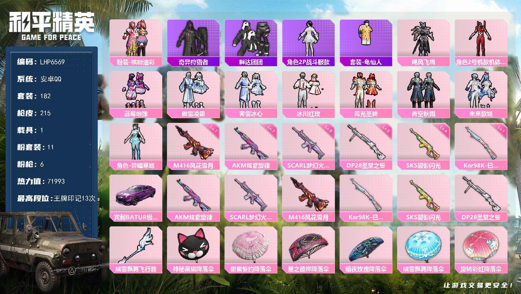 [16911640]可二次【店主推荐捡漏号!可直接换绑】/素材身法号 安卓 手Q-11粉装-6特效枪-1载具-1粉色飞行器-7.1w热力值-13王牌印记-182套装-215枪皮【热门品类】:粉装-缤纷油彩,套装-奇异狩猎者,套装-胖达团团,角色-2P战斗服款,套装-龟仙人【粉色载具】:宾利BATUR(极速紫)【粉色套装】:粉装-缤纷油彩,粉装-飓风飞鹰,角色-2号机款机体服,粉装-蓝莓炮弹,粉装-傲雪凌霜,粉装-霁雪冰心,粉装-冰川红玫,粉装-霞光圣骑,粉装-青空秋雨,粉装-未来歌姬,角色-异瞳寒姬【粉色枪皮等级】:AKM-炫紫旋律(七级),SCAR-L-梦幻火箭(六级),M416-风花雪月(七级),Kar98K-巳巳如意(一级),SKS-碧影闪光(四级),DP-28-圣堂之誓(五级)【粉色飞行器】:绒雪飘舞飞行器