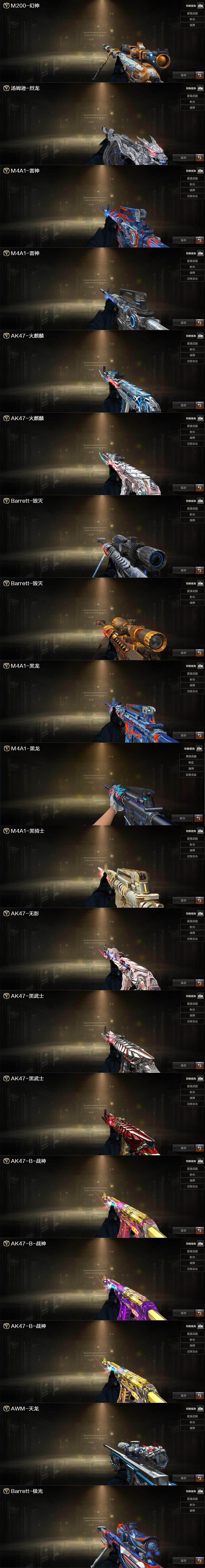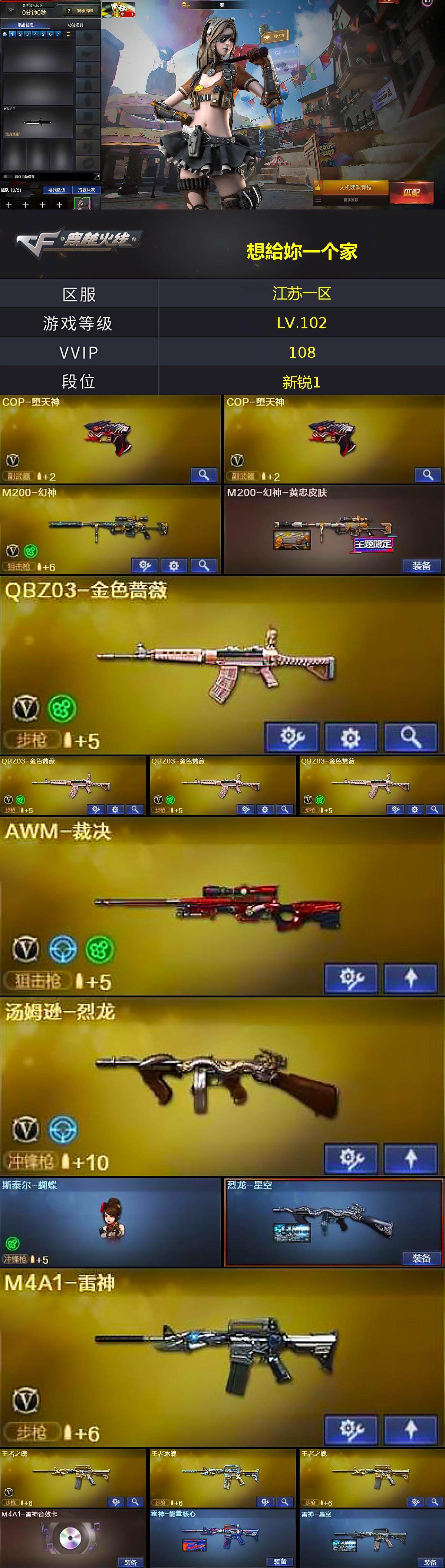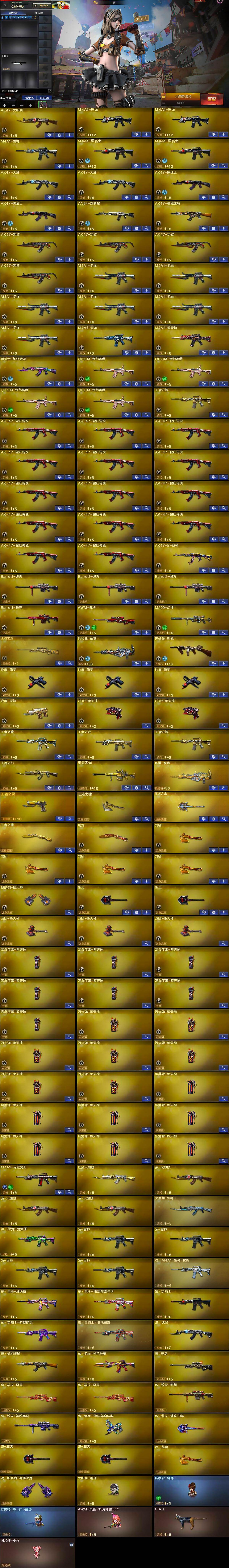 【英雄级武器】:AK47-火麒麟,M4A1-黑龙*2,M4A1-雷神,M4A1-黑骑士*2,AK47-无影*2,AK47-黑武士*2,AN94-超新星,AK47-机械迷城,AK47-黑鲨*4,M4A1-龙血*6,M4A1-青龙,M4A1-堕天神,黑武士-锦绣游龙,QBZ03-金色蔷薇*4,王者之魄-觉醒版,AK-47-猩红传说*14,AK47-B-战神,Barrett-毁灭*3,Barrett-极光,AWM-裁决,M200-幻神,王者之力-觉醒版,加特林-炼狱,汤姆逊-烈龙,沙鹰-修罗*3,沙鹰-天神,COP-堕天神*2,屠龙,龙啸*4,麒麟刺-堕天神,擎天*2,龙啸-堕天神*3,高爆手雷-堕天神*7,闪光弹-堕天神*7,烟雾弹-堕天神*7,M4A1-赤狱骑士