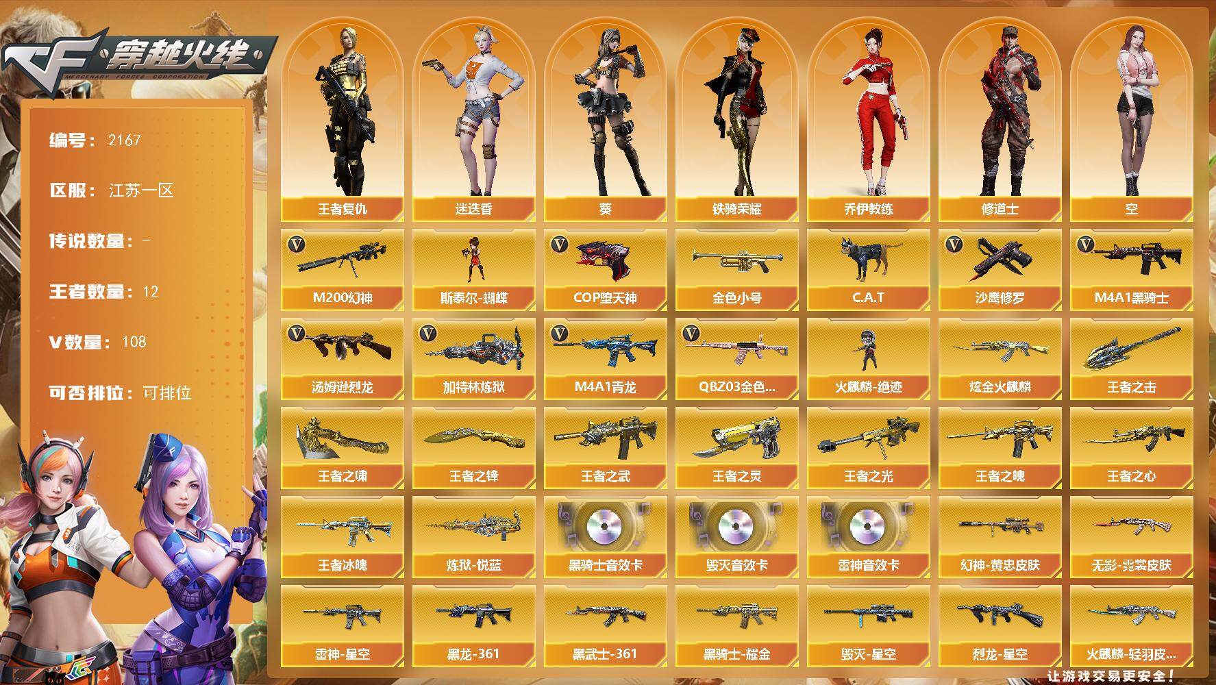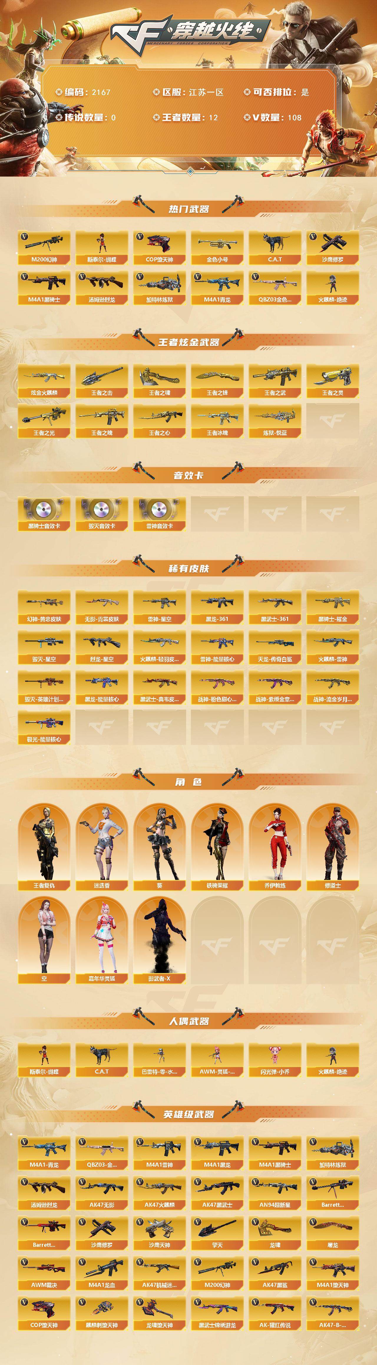 [16912441]江苏一区-110V-12王者武器数-1炫金武器数 【热门武器】:QBZ03-金色蔷薇*4,M4A1-青龙,M200-幻神,金色小号,C.A.T,M4A1-黑骑士*2,汤姆逊-烈龙,加特林-炼狱,斯泰尔-蝴蝶,火麒麟-绝迹,COP-堕天神*2,沙鹰-修罗*3 【王者炫金武器】:王者冰魄,王者之武,王者之魄,王者之心,王者之光,炼狱-悦蓝,王者之灵,王者之啸,王者之击,王者之锋,炫金火麒麟 【音效卡】:M4A1-雷神音效卡,M4A1-黑骑士音效卡,Barrett-毁灭音效卡 【皮肤】:M200-幻神-黄忠皮肤,烈龙-星空,雷神-能量核心,雷神-星空,火麒麟-雷神,火麒麟-轻羽皮肤,毁灭-星空,毁灭-英雄计划 皮肤,黑龙-能量核心,M4A1-黑龙-361,黑骑士耀金皮肤,无影-霓裳皮肤,AK47-黑武士-361,黑武士-典韦皮肤,战神-粉色甜心皮肤*5,战神-紫绶金章皮肤*8,战神-流金岁月皮肤*10,AWM-天龙-传奇白鲨,极光-能量核心 【角色】:葵,迷迭香,王者复仇,乔伊教练,修道士,空,嘉年华灵狐,铁骑荣耀,影武者-X 【人偶武器】:火麒麟-绝迹,斯泰尔-蝴蝶,巴雷特-零-水下丽影,AWM-灵狐-15周年嘉年华,C.A.T,闪光弹-小乔 【英雄级武器】:AK47-火麒麟,M4A1-黑龙*2,M4A1-雷神,M4A1-黑骑士*2,AK47-无影*2,AK47-黑武士*2,AN94-超新星,AK47-机械迷城,AK47-黑鲨*4,M4A1-龙血*6,M4A1-青龙,M4A1-堕天神,黑武士-锦绣游龙,QBZ03-金色蔷薇*4,王者之魄-觉醒版,AK-47-猩红传说*14,AK47-B-战神,Barrett-毁灭*3,Barrett-极光,AWM-裁决,M200-幻神,王者之力-觉醒版,加特林-炼狱,汤姆逊-烈龙,沙鹰-修罗*3,沙鹰-天神,COP-堕天神*2,屠龙,龙啸*4,麒麟刺-堕天神,擎天*2,龙啸-堕天神*3,高爆手雷-堕天神*7,闪光弹-堕天神*7,烟雾弹-堕天神*7,M4A1-赤狱骑士 【道具】:炫彩背包,超级背包,女皇终结者-魔龙之吻,救世主-黑桃战神,绿色巨人,灵魂忍者,夺命之镰,防化服,枪王排位28赛季金色流光,动感闪耀表情,防弹头盔*3,防弹衣*3,C4工具钳,手雷包*2 【特殊枪械】:蝴蝶斯泰尔+1烈龙,2黑骑士,1烈龙,1炼狱,1蝴蝶斯泰尔