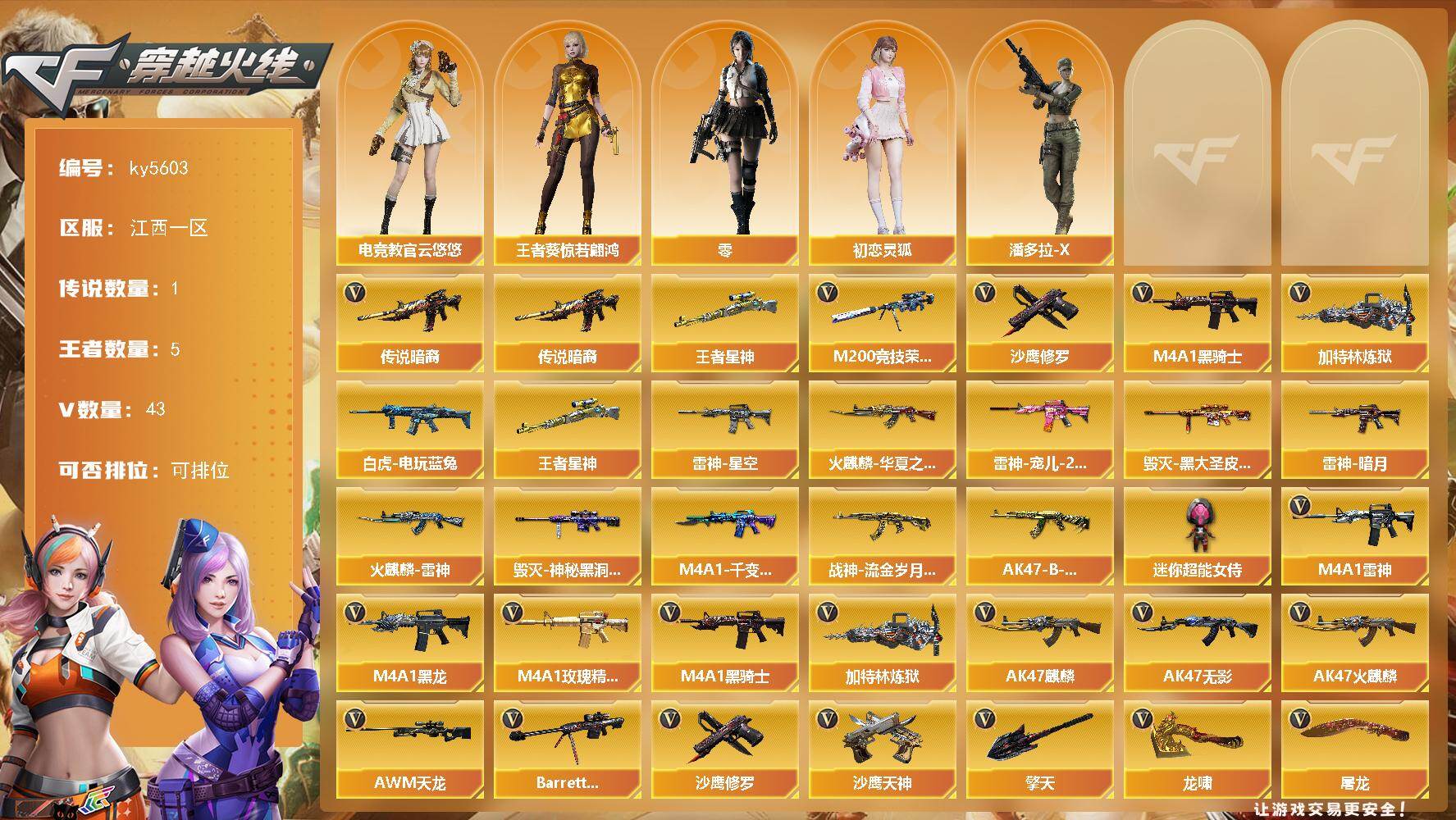 - [13711049]重庆一区-21V-1王者-0炫金 【热门武器】:王者星神,QBZ03-金色蔷薇,M200-竞技荣光,USP-雷暴 【王者炫金武器】:王者星神 【皮肤】:火麒麟-平天大圣,黑骑士-暗月 【角色】:电竞教官-云悠悠,初恋灵狐,芳心审判者,虎妞,灵狐者-黄金海岸,龙儿-小淘气,潘多拉-甜心教官,青霞仙子 【人偶武器】:迷你深渊冰龙,迷你艾比 【挑战大师】:冰龙粉碎者-白马银枪,激光毁灭者III-白马银枪 【英雄级武器】:QBZ03-金色蔷薇,M200-竞技荣光,USP-雷暴,柯尔特-竞技荣光,擎天-竞技荣光,高爆手雷-竞技荣光*4,闪光弹-竞技荣光*4,烟雾弹-竞技荣光*4,M4A1-赤狱骑士 【道具】:女皇终结者-魔龙之吻,绿色巨人,灵魂忍者,迷雾幽灵,夺命之镰,防化服*3,流光-鎏金之域,枪王排位29赛季金色流光,EP战队名片,防弹头盔*4,防弹衣*4,C4工具钳*4,手雷包*4 【特殊枪械】: