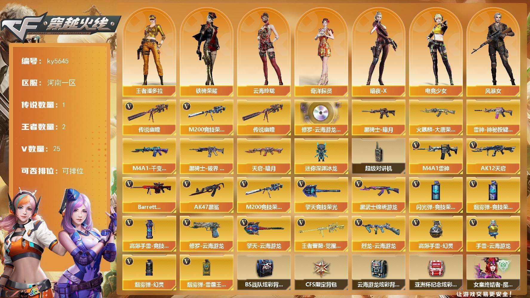 [16914694]河南一区-27V-2王者武器数-0炫金武器数 【传说武器】:传说幽瞳 【热门武器】:传说幽瞳,M200-竞技荣光 【音效卡】:修罗-云海游龙音效卡 【皮肤】:雷神-神秘按键 皮肤,火麒麟-大唐荣光,M4A1-千变-孔明皮肤,黑骑士-暗月,黑骑士-破界 皮肤,天启-暗月 【角色】:王者潘多拉,奇洋探员,云海玲珑,暗夜-X,电竞少女,风暴女,嘉年华灵狐,娟娟,灵狐者-X,麻雀,曼陀罗-X,曼陀罗-礼服,潘多拉-甜心教官,铁骑荣耀,兔囡囡,雪莉杨,游珑儿 【人偶武器】:迷你深渊冰龙 【暴走生化】:超级对讲机 【英雄级武器】:M4A1-雷神*3,AK12-天启,AK47-黑鲨,黑武士-锦绣游龙,Barrett-极光,M200-竞技荣光,王者蔷薇-觉醒版,烈龙-云海游龙,修罗-云海游龙,擎天-竞技荣光,擎天-云海游龙,高爆手雷-幻灵*2,高爆手雷-竞技荣光,手雷-云海游龙,闪光弹-竞技荣光,烟雾弹-幻灵,烟雾弹-竞技荣光,烟雾弹-雷霆王者-觉醒版 【道具】:BS战队炫彩背包,CFS限定背包,云海游龙炫彩背包,亚洲杯纪念炫彩背包,女皇终结者-魔龙之吻,绿色巨人,灵魂忍者,迷雾幽灵,夺命之镰*2,防化服*3,金色流光-枪王排位*2,星辰流光-枪王排位,枪王排位28赛季金色流光,枪王排位29赛季金色流光,云海游龙表情,EP战队名片,EP战队喷图,防弹头盔*6,防弹衣*6,C4工具钳*6,手雷包*6 【特殊枪械】: