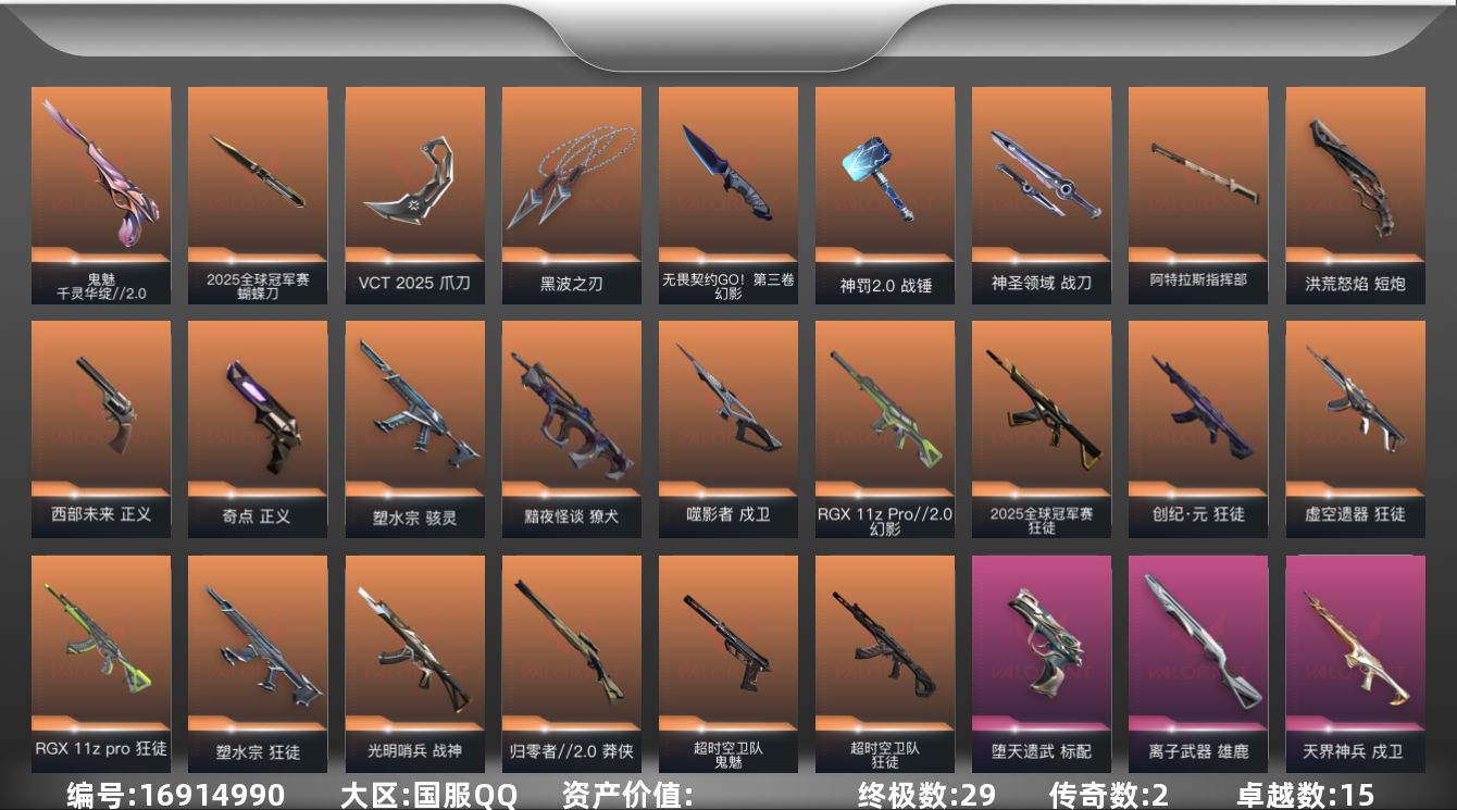 [16914990]【套装】:2025全球冠军赛套装,无畏契约季前邀请赛套装,回火礼包// V25套装,VCT 2025 赛季套装,掠影//3.0套装,回火礼包:掠影套装 【英雄】:幻棱,炼狱,维斯,暮蝶,壹决,铁臂,捷风,幽影,不死鸟,贤者,猎枭,蝰蛇,零,芮娜,奇乐,尚勃勒,霓虹,斯凯,夜露,星礈,K/O,海神,盖可,黑梦,钢锁 【近战武器】:近战武器-2025全球冠军赛 蝴蝶刀,近战武器-影蝶,近战武器-无畏契约季前邀请赛 悲悯之刃,近战武器-无畏契约GO!第三卷 匕首,近战武器-VCT 2025 爪刀,近战武器-黑波之刃,近战武器-神罚//2.0 战锤,近战武器-神圣领域 战刀,近战武器-阿特拉斯指挥部 甩棍 【狂徒】:狂徒-超时空卫队,狂徒-2025全球冠军赛,狂徒-塑水宗,狂徒-创·纪元,狂徒-虚空遗器,狂徒-RGX 11z Pro,狂徒-掠影,狂徒-赤焰铁骥,狂徒-诡秘蛇影 【幻影】:幻影-RGX 11z Pro//2.0,幻影-盖亚的复仇//2.0,幻影-天界神兵//2.0,幻影-异鳞魔蛇,幻影-神中神罚,幻影-掠影//2.0,幻影-神圣领域,幻影-末日之翼 【戍卫】:戍卫-噬影者,戍卫-掠影,戍卫-天界神兵,戍卫-月球哨兵,戍卫-折光棱晶 【獠犬】:獠犬-黯夜怪谈,獠犬-神圣领域 【冥驹】:冥驹-堕天遗武,冥驹-掠影,冥驹-星云暗涌 【飞将】:飞将-末日之翼 【莽侠】:莽侠-归零者//2.0,莽侠-诡秘蛇影,莽侠-月球哨兵 【战神】:战神-光明哨兵,战神-神圣领域 【奥丁】:奥丁-掠影//2.0,奥丁-末日之翼 【判官】:判官-诡秘蛇影 【雄鹿】:雄鹿-离子武器,雄鹿-月球哨兵 【骇灵】:骇灵-塑水宗,骇灵-无限竞技,骇灵-星云暗涌 【蜂刺】:蜂刺-星云暗涌,蜂刺-折光棱晶 【追猎】:追猎-掠影//3.0 【标配】:标配-堕天遗武,标配-折光棱晶 【正义】:正义-奇点,正义-西部未来,正义-月球哨兵 【鬼魅】:鬼魅-超时空卫队,鬼魅-千灵华绽//2.0,鬼魅-星云暗涌 【狂怒】:狂怒-神圣领域 【短炮】:短炮-洪荒怒焰,短炮-末日之翼 【卡面】:南瓜盛典 卡面,树懒大作战 卡面,Clutch 卡面,无畏契约GO!第一卷:芮娜 卡面,无畏契约GO!第一卷:零 卡面,无垠星环 卡面,《双城之战》金克丝 卡面,无畏契约GO!第一卷:贤者 卡面,代号红色 卡面,新兵报到 卡