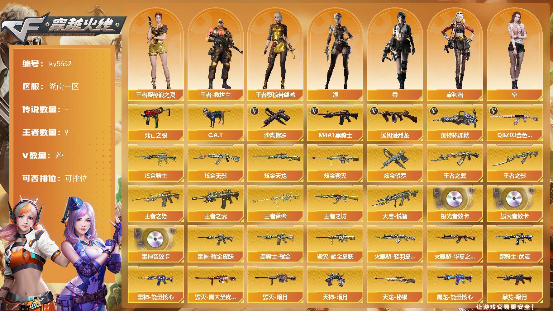 [16915398]湖南一区-92V-9王者武器数-8炫金武器数 【热门武器】:QBZ03-金色蔷薇*2,死亡之眼*2,C.A.T,M4A1-黑骑士*6,汤姆逊-烈龙*6,加特林-炼狱*2,沙鹰-修罗*2 【王者炫金武器】:王者之城,天启-悦智,王者之翼,王者之势,王者之武,王者之影,王者蔷薇,炫金骑士,炫金无影*3,炫金毁灭*2,炫金天龙,炫金修罗 【音效卡】:M4A1-雷神音效卡,Barrett-毁灭音效卡,Barrett-极光音效卡 【皮肤】:雷神-能量核心,雷神-耀金皮肤,火麒麟-华夏之心*2,火麒麟-轻羽皮肤,毁灭-暗月*4,毁灭耀金皮肤*2,毁灭-黑大圣皮肤,黑龙-能量核心,黑龙-暗月*3,黑骑士耀金皮肤,黑骑士-伏羲,无影-暗月*3,死神-秘银*7,天启-暗月*3,战神-紫绶金章皮肤,战神-流金岁月皮肤,天龙-秘银*3,极光-能量核心*2,修罗-能量核心*2,天神-暗月,擎天-秘银 【角色】:零,瞳,审判者,王者樱-热浪之夏,王者葵-惊若翩鸿,王者-救世主,空,飞虎队-X,嘉年华灵狐,灵狐者-X,灵狐者-黄金海岸,潘多拉-X,潜龙队-X,影武者-X,游珑儿 【人偶武器】:天龙-曼陀罗,火麒麟-灵狐,M4A1-雷神-精英刀锋,AWM-灵狐-15周年嘉年华,海滩汪汪-巴雷特,C.A.T,迷你牛魔王,迷你波特博士,沙鹰-蓝水晶-曼陀罗 【暴走生化】:死亡之眼*2,超级对讲机 【挑战大师】:暴君乱世-超越Max,激光毁灭者III*2,神圣爆裂者-末日III 【英雄级武器】:M4A1-千变,AK47-火麒麟*2,M4A1-黑龙*4,M4A1-雷神*3,M4A1-黑骑士*6,AK47-无影,M4A1-死神,AK47-黑武士*2,AK12-天启,AN94-超新星*2,M4A1-武圣*2,AK47-机械迷城,AK47-黑鲨,M4A1-龙血,无影-神兵利器,M4A1-玫瑰精灵*2,QBZ03-金色蔷薇*2,王者之心-觉醒版,AK-47-猩红传说,AK47-B-战神,AWM-天龙*2,Barrett-毁灭*7,Barrett-极光*4,Barrett-金色蔷薇*2,王者之光-觉醒版,加特林-炼狱*2,汤姆逊-烈龙*6,AA-12-雷霆*2,沙鹰-修罗*2,沙鹰-天神*2,屠龙*2,龙啸*3,擎天*2,麒麟刺*4,擎天-竞技荣光,高爆手雷-竞技荣光*2,闪光弹-竞技荣光*3,烟雾弹-竞技荣光
