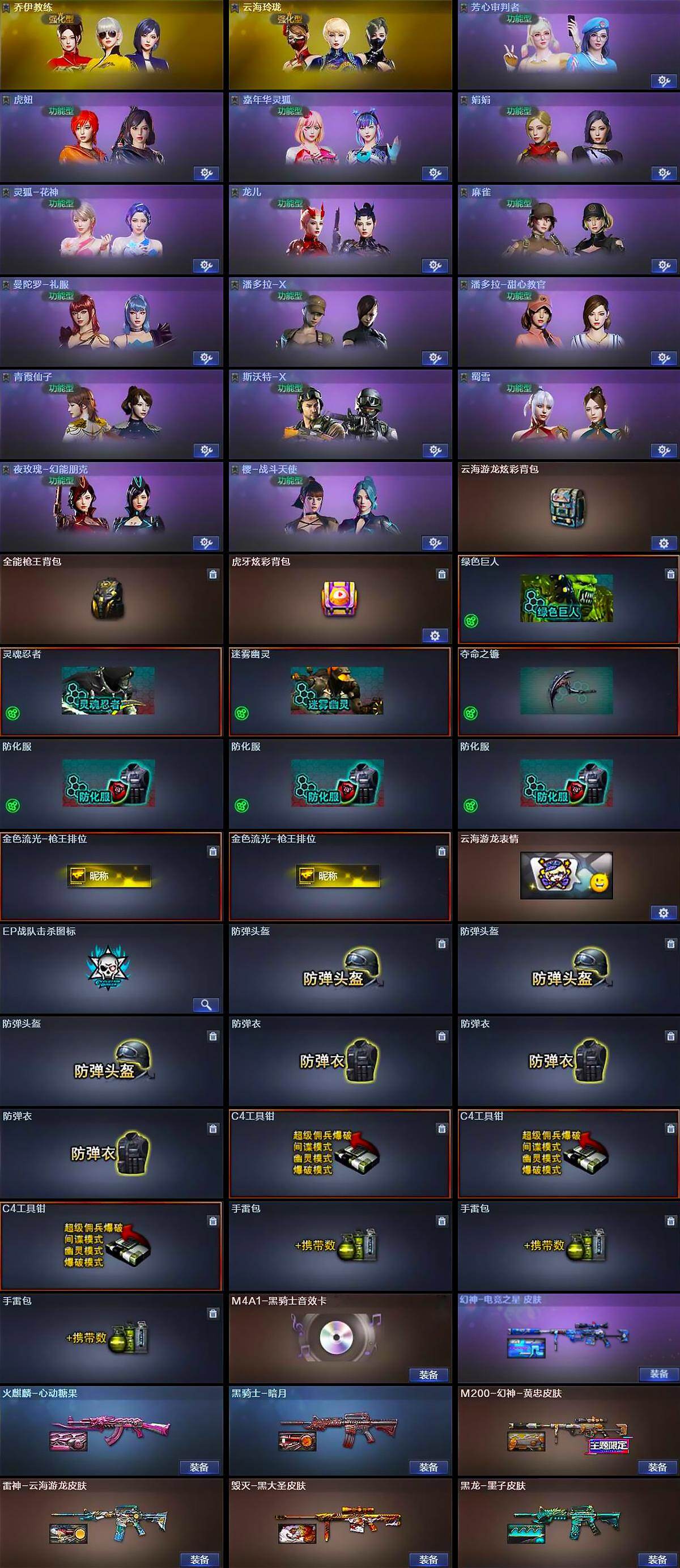【道具】:云海游龙炫彩背包,全能枪王背包,虎牙炫彩背包,绿色巨人,灵魂忍者,迷雾幽灵,夺命之镰,防化服*3,金色流光-枪王排位*2,云海游龙表情,EP战队击杀图标,防弹头盔*3,防弹衣*3,C4工具钳*3,手雷包*3