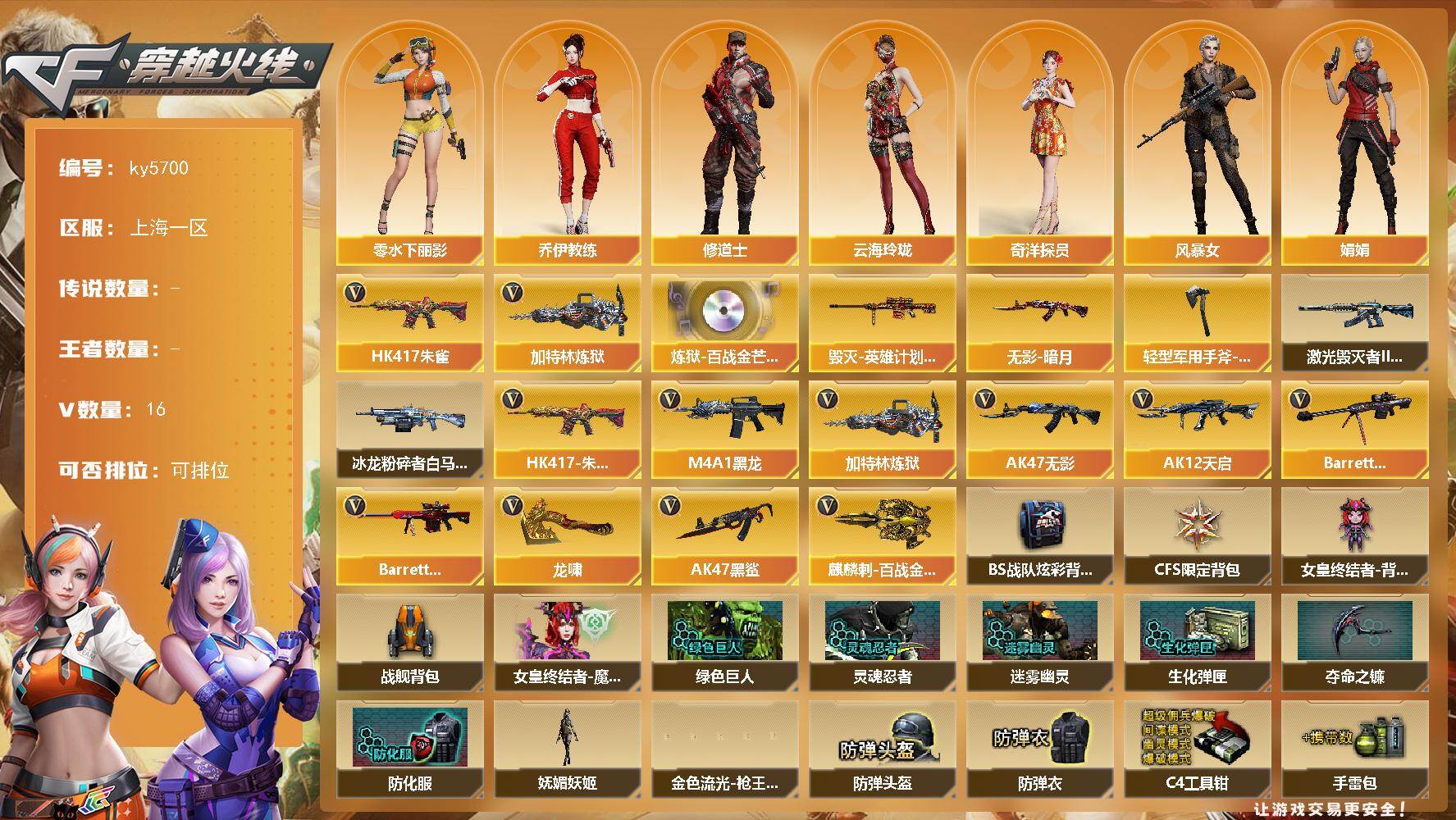 [16915861]上海一区-20V-0王者武器数-0炫金武器数 【热门武器】:HK417-朱雀,加特林-炼狱 【音效卡】:炼狱-百战金芒-庆典舞曲音效卡 【皮肤】:毁灭-英雄计划 皮肤,无影-暗月,轻型军用手斧-再燃火线 【角色】:奇洋探员,乔伊教练,修道士,云海玲珑,风暴女,娟娟,零-水下丽影,潘多拉-甜心教官,雪莉杨,影武者-X,游珑儿 【挑战大师】:冰龙粉碎者-白马银枪,激光毁灭者III-白马银枪*2 【英雄级武器】:M4A1-黑龙,AK47-无影,AK12-天启,AK47-黑鲨,HK417-朱雀,Barrett-毁灭*2,Barrett-极光,加特林-炼狱,龙啸,麒麟刺-百战金芒 【道具】:BS战队炫彩背包,CFS限定背包,女皇终结者-背包,战舰背包,女皇终结者-魔龙之吻,妩媚妖姬,绿色巨人,灵魂忍者,迷雾幽灵,生化弹匣,夺命之镰,防化服*3,金色流光-枪王排位,星辰流光-枪王排位,防弹头盔*7,防弹衣*7,C4工具钳*6,手雷包*6 【特殊枪械】:1炼狱