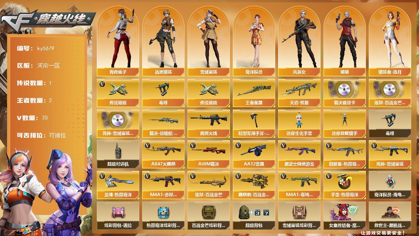 [16916283]河南一区-17V-2王者武器数-0炫金武器数 【传说武器】:传说破晓 【传说角色】:传说影煞 【热门武器】:传说破晓,毒蜂 【王者炫金武器】:天启-悦智,王者星霆 【音效卡】:AWM-裁决音效卡,炼狱-百战金芒-庆典舞曲音效卡,死神-雪域霜狐-怀旧音效卡 【皮肤】:裁决-运输船 皮肤,M4A1-再燃火线,轻型军用手斧-再燃火线 【角色】:战地猎狐,雪域霜狐,奇洋探员,风暴女,娟娟,猎狐者-追月,麻雀,曼陀罗-X,青霞仙子,兔囡囡,游珑儿 【人偶武器】:迷你救赎猎手,迷你生化手雷 【暴走生化】:毒蜂,超级对讲机 【英雄级武器】:AK47-火麒麟,黑武士-锦绣游龙,超新星-热带奇洋,死神-雪域霜狐,AWM-裁决,炼狱-百战金芒,AA-12-雷霆,龙啸-热带奇洋,麒麟刺-百战金芒,手雷-热带奇洋,M4A1-赤狱骑士,M4A1-苍鸣雷神 【道具】:奇洋探员-海龟背包,炫彩背包-诺拉,热带奇洋炫彩背包,百战金芒炫彩背包,超级背包,雪域霜狐炫彩背包,地狱终结者-妲己,女皇终结者-魔龙之吻,救世主-黑桃战神,黄金生化钩,绿色巨人,灵魂忍者*2,变异宝贝,迷雾幽灵,生化弹匣,夺命之镰,防化服*3,星辰流光-枪王排位,枪王排位28赛季金色流光,枪王排位29赛季金色流光,语音特效-盛典烟火,语音特效-怀旧,语音特效-热带奇洋,雪域霜狐表情,萌萌小葵表情,热带奇洋表情,防弹头盔*3,防弹衣*3,C4工具钳*3,手雷包*3 【特殊枪械】: