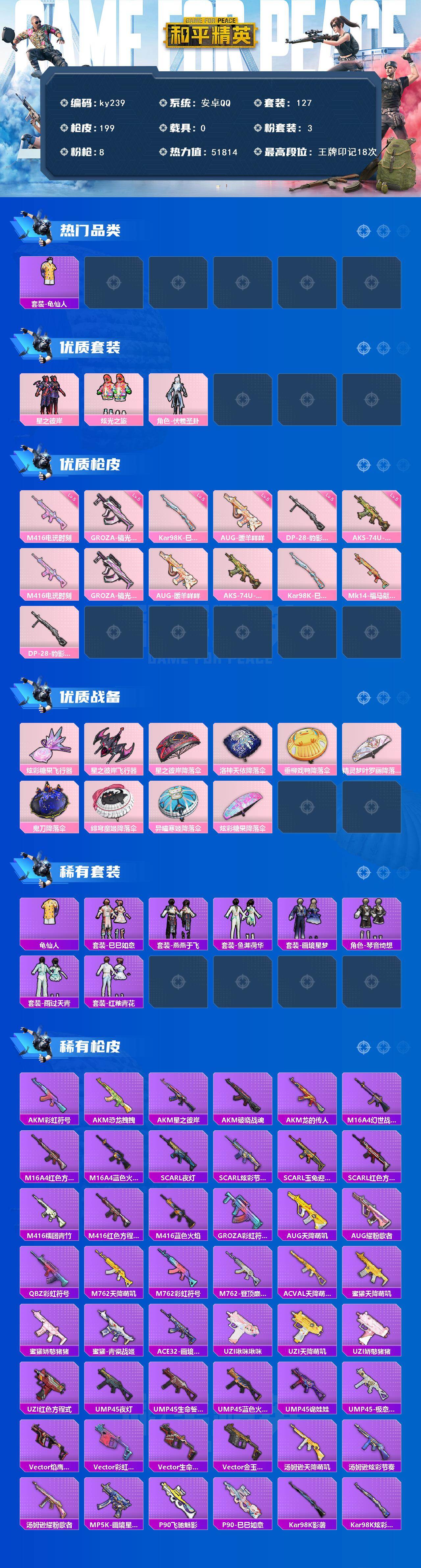[16916392]安卓 手Q-3粉装-8特效枪-0载具-2粉色飞行器-51814热力值-18王牌印记-127套装-199枪皮 【热门品类】:套装-龟仙人 【粉色套装】:粉装-星之彼岸,粉装-炫光之旅,角色-伏羲圣卦 【粉色枪皮等级】:M416-电玩时刻(五级),GROZA-镜光银凌(五级),AUG-暖羊咩咩(五级),AKS-74U-森灵之息(五级),Kar98K-巳巳如意(五级),DP-28-豹影疾电(五级) 【粉色枪皮】:M416-电玩时刻,GROZA-镜光银凌,AUG-暖羊咩咩,AKS-74U-森灵之息,Kar98K-巳巳如意,Mk14-福马献瑞,DP-28-豹影疾电 【粉色飞行器】:炫彩糖果飞行器,星之彼岸飞行器 【粉色降落伞】:星之彼岸降落伞,洛神天依降落伞,垂柳戏鸭降落伞,精灵梦叶罗丽降落伞,鬼刀降落伞,绯穹魔姬降落伞,异瞳寒姬降落伞,炫彩糖果降落伞 【稀有套装】:套装-龟仙人,套装-巳巳如意,套装-炫彩糖果,套装-燕燕于飞,套装-鱼渊荷华,套装-画境星梦,套装-琴音绮想,套装-雨过天青,套装-红釉青花 【稀有枪皮】:AUG-冰晶雪宝,AKM-彩虹符号,AKM-恐龙拽拽,AKM-星之彼岸,AKM-破晓战魂,AKM-龙的传人,M16A4-幻世战舞者,M16A4-红色方程式,M16A4-蓝色火焰,SCAR-L-夜灯,SCAR-L-炫彩节奏,SCAR-L-玉兔迎春,SCAR-L-红色方程式,M416-糯团青竹,M416-红色方程式,M416-蓝色火焰,GROZA-彩虹符号,AUG-天降萌叽,AUG-耀粉歌者,QBZ-彩虹符号,M762-天降萌叽,M762-彩虹符号,M762-登顶巅峰,AC-VAL-天降萌叽,蜜獾-天降萌叽,蜜獾-娇憨猪猪,蜜獾-青瓷战姬,ACE32-画境星梦,UZI-啾咪啾咪,UZI-天降萌叽,UZI-娇憨猪猪,UZI-红色方程式,UMP45-夜灯,UMP45-生命誓言,UMP45-蓝色火焰,UMP45-诡娃娃,UMP45-极意拳锋,Vector-焰鹰斗篷,Vector-彩虹符号,Vector-生命誓言,Vector-金玉无双,汤姆逊-天降萌叽,汤姆逊-炫彩节奏,汤姆逊-耀粉歌者,MP5K-画境星梦,P90-飞驰魅影,P90-巳巳如意,Kar98K-影袭,Kar98K-炫彩节奏,Kar98K-红色方程式,M24-炫彩节奏,AWM-焰鹰斗篷,SKS-炫彩节奏,S
