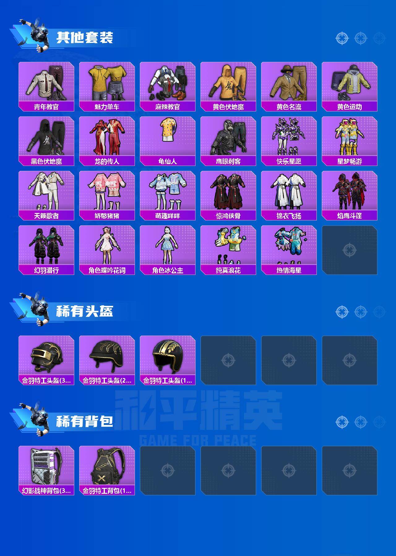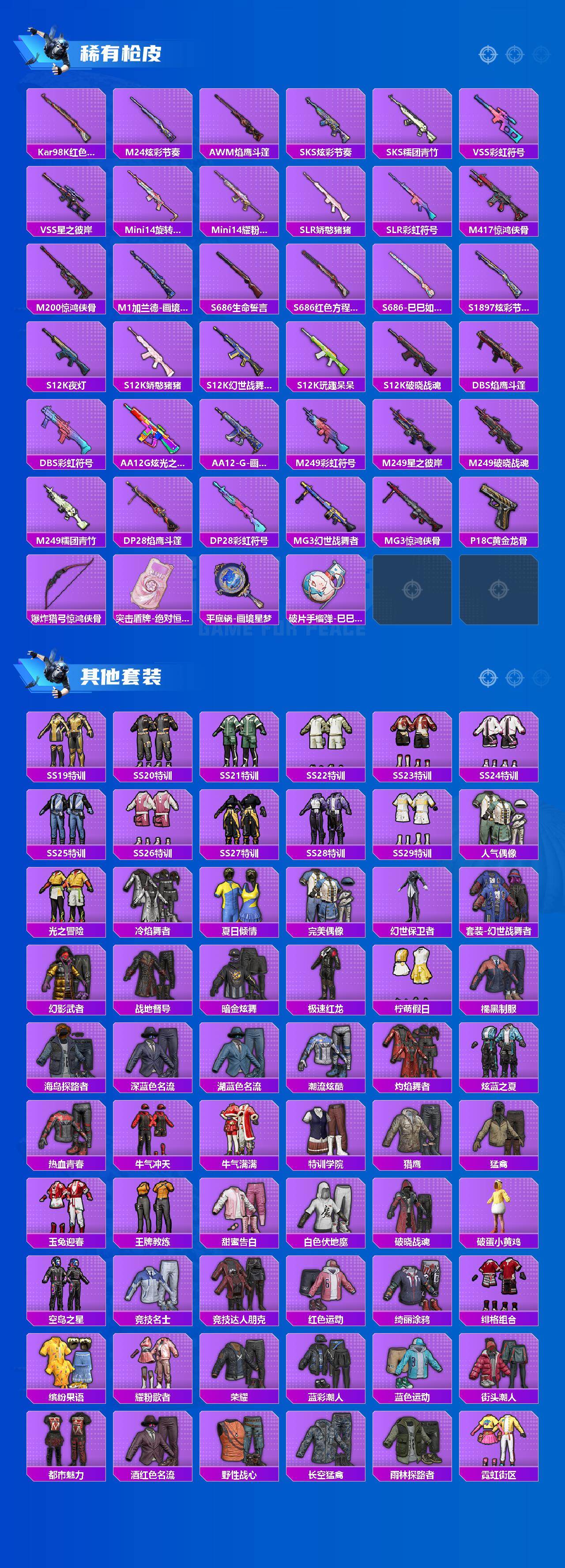 【稀有枪皮】:AUG-冰晶雪宝,AKM-彩虹符号,AKM-恐龙拽拽,AKM-星之彼岸,AKM-破晓战魂,AKM-龙的传人,M16A4-幻世战舞者,M16A4-红色方程式,M16A4-蓝色火焰,SCAR-L-夜灯,SCAR-L-炫彩节奏,SCAR-L-玉兔迎春,SCAR-L-红色方程式,M416-糯团青竹,M416-红色方程式,M416-蓝色火焰,GROZA-彩虹符号,AUG-天降萌叽,AUG-耀粉歌者,QBZ-彩虹符号,M762-天降萌叽,M762-彩虹符号,M762-登顶巅峰,AC-VAL-天降萌叽,蜜獾-天降萌叽,蜜獾-娇憨猪猪,蜜獾-青瓷战姬,ACE32-画境星梦,UZI-啾咪啾咪,UZI-天降萌叽,UZI-娇憨猪猪,UZI-红色方程式,UMP45-夜灯,UMP45-生命誓言,UMP45-蓝色火焰,UMP45-诡娃娃,UMP45-极意拳锋,Vector-焰鹰斗篷,Vector-彩虹符号,Vector-生命誓言,Vector-金玉无双,汤姆逊-天降萌叽,汤姆逊-炫彩节奏,汤姆逊-耀粉歌者,MP5K-画境星梦,P90-飞驰魅影,P90-巳巳如意,Kar98K-影袭,Kar98K-炫彩节奏,Kar98K-红色方程式,M24-炫彩节奏,AWM-焰鹰斗篷,SKS-炫彩节奏,S