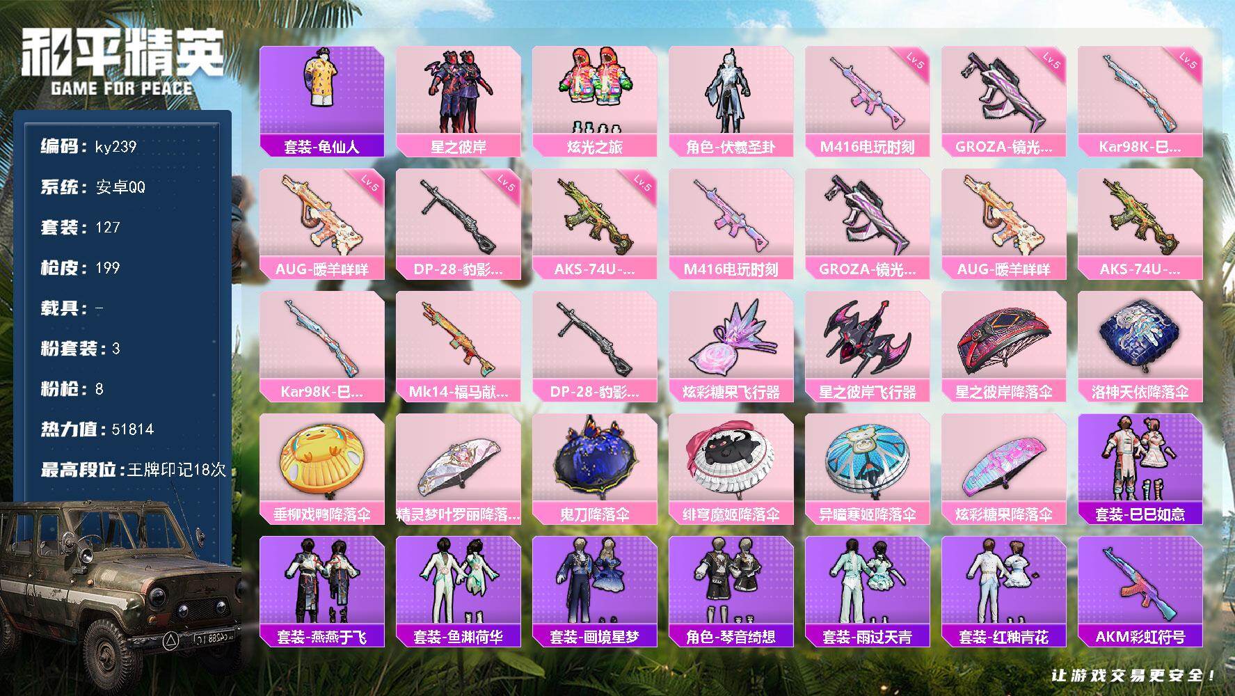 [16916392]安卓 手Q-3粉装-8特效枪-0载具-2粉色飞行器-51814热力值-18王牌印记-127套装-199枪皮