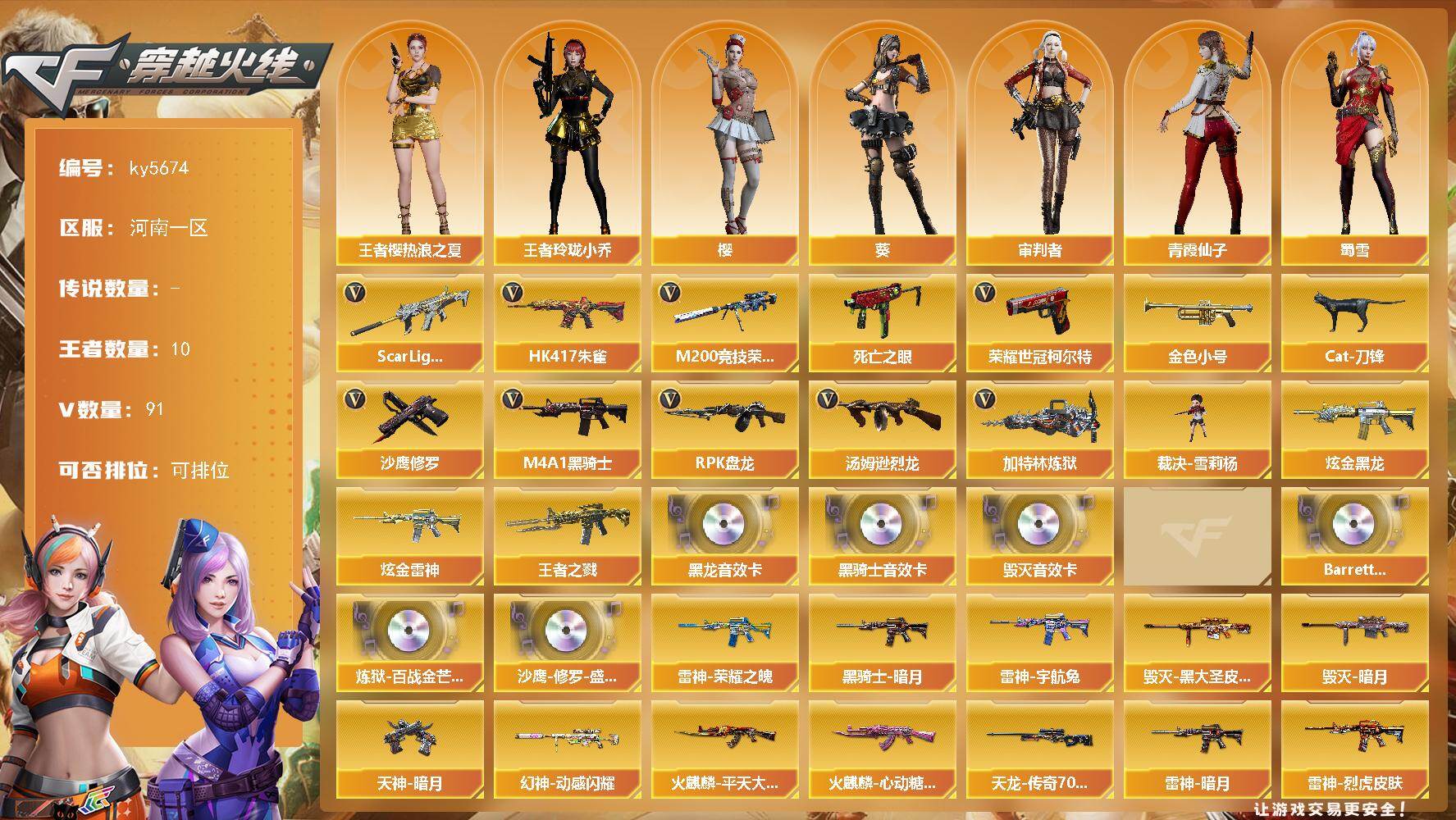 - [16636309]北京一区-41V-9王者武器数-1炫金武器数 【热门武器】:QBZ03-金色蔷薇,M200-幻神,金色蔷薇-古蛇迷踪,修罗-古蛇迷踪,Kar98K-星神,金色小号,M4A1-黑骑士,玄武-枪娘火莲,沙鹰-修罗*2,金刚伞 【王者炫金武器】:王者之城,炫金无影,王者之魄高爆手雷,王者之魄闪光弹 【音效卡】:金色蔷薇-古蛇迷踪音效卡,枪娘语音包-阿敏,死神-雪域霜狐-怀旧音效卡 【皮肤】:幻神-星耀 皮肤,幻神-Heartshot 皮肤,星神-枪娘默 皮肤,雷神-暗月,雷神-宇航兔皮肤,雷神-源计划2.0专属 皮肤,火麒麟-轻羽皮肤,火麒麟-平天大圣*2,火麒麟-心动糖果,火麒麟-傲竹金蛇 皮肤,毁灭-直播专属,毁灭-秦师 皮肤,毁灭-英雄计划 皮肤,黑龙-墨子皮肤,黑骑士-冠军之势,黑武士-典韦皮肤,麒麟刺-甜蜜糖果 皮肤 【角色】:零,雪域霜狐,蛇隐宗,奇洋探员,乔伊教练,云海玲珑,暗夜-X,电竞少女,芳心审判者,飞虎队-X,风暴女,嘉年华灵狐,娟娟,葵-赛博朋克,猎狐者-追月,灵狐-花神,灵狐者-X,曼陀罗-X,曼陀罗-礼服,潘多拉-X,蛇姬,斯沃特-X,蜀雪,兔囡囡,樱-战斗天使,游珑儿 【人偶武器】:玄武-枪娘火莲,加特林-机械猎手,AWM-灵狐-15周年嘉年华,海滩汪汪-巴雷特,夺魂*2,迷你牛牛,生化手雷-机甲核心*2,M37-奇洋探员,QBZ03-斯沃特 【挑战大师】:冰龙粉碎者-白马银枪,激光毁灭者III-白马银枪,神圣爆裂者-末日III 【英雄级武器】:M4A1-千变,AK47-火麒麟,M4A1-黑龙,M4A1-雷神*2,M4A1-黑骑士,AK12-天启,无影-神兵利器,黑武士-锦绣游龙,超新星-热带奇洋,金色蔷薇-古蛇迷踪,死神-雪域霜狐,QBZ03-金色蔷薇,烈火-动感闪耀,王者之心-觉醒版,王者之魄-觉醒版,黑骑士-海王,QBZ-03-王者蔷薇-觉醒版,Barrett-毁灭,Barrett-极光,M200-幻神,Kar98K-星神,AA-12-雷霆,沙鹰-修罗*2,沙鹰-天神,天神-动感闪耀,修罗-古蛇迷踪,擎天,麒麟刺,屠龙-动感闪耀,王者之刺-觉醒版,手雷-动感闪耀,手雷-热带奇洋,高爆手雷-古蛇迷踪,闪光弹-云龙,闪光弹-雷霆王者-觉醒版,烟雾弹-云龙,烟雾弹-古蛇迷踪,M4A1-赤狱骑士 【道具】:CFS限定背包,亚洲杯纪念炫彩背包,