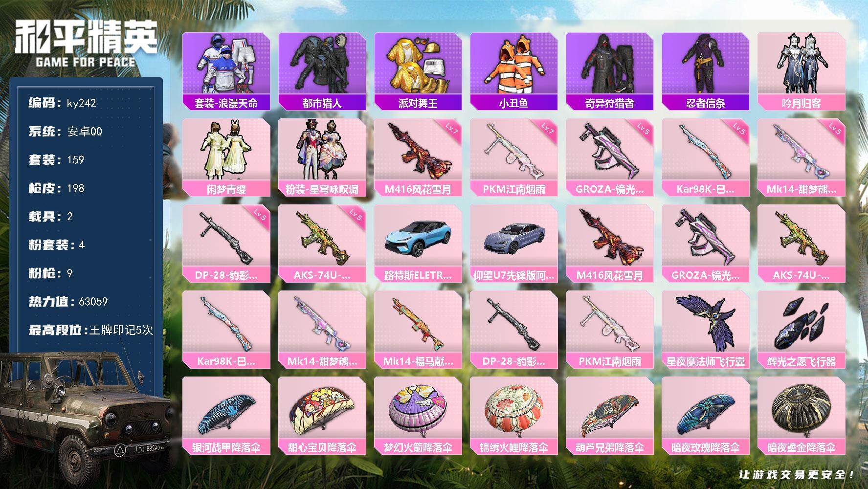 [16917030]安卓 手Q-4粉装-9特效枪-2载具-2粉色飞行器-63059热力值-5王牌印记-159套装-198枪皮 【热门品类】:套装-浪漫天命,套装-都市猎人,套装-派对舞王,套装-小丑鱼,套装-奇异狩猎者,套装-忍者信条 【粉色套装】:粉装-吟月归客,粉装-闲梦青缨,粉装-星穹咏叹调 【粉色枪皮等级】:M416-风花雪月(七级),GROZA-镜光银凌(五级),AKS-74U-森灵之息(五级),Kar98K-巳巳如意(五级),Mk14-甜梦熊击(五级),DP-28-豹影疾电(五级),PKM-江南烟雨(七级) 【粉色载具】:路特斯ELETRE(冰川蓝),仰望U7(阿盖尔紫) 【粉色枪皮】:M416-风花雪月,GROZA-镜光银凌,AKS-74U-森灵之息,Kar98K-巳巳如意,Mk14-甜梦熊击,Mk14-福马献瑞,DP-28-豹影疾电,PKM-江南烟雨 【粉色飞行器】:星夜魔法师飞行翼,辉光之愿飞行器 【粉色降落伞】:银河战甲降落伞,甜心宝贝降落伞,梦幻火箭降落伞,锦绣火鲤降落伞,葫芦兄弟降落伞,暗夜玫瑰降落伞,暗夜鎏金降落伞,精灵梦叶罗丽降落伞,创世·救赎降落伞,临安公主降落伞,鬼刀降落伞,赛博古神降落伞,彩虹独角兽降落伞,智耀战神降落伞,幻彩电音降落伞,时光之吻降落伞,绯穹魔姬降落伞 【稀有套装】:套装-巳巳如意,套装-糖糖葫芦,套装-青团波波,角色-都市丽猫,套装-燕燕于飞,套装-鱼渊荷华,套装-樱梦幻音,套装-粉恋花,套装-紫幽梦,套装-蓝冰羽,套装-星渊小夜曲,套装-雨过天青,套装-红釉青花 【稀有枪皮】:AKM-夜灯,AKM-彩虹符号,AKM-影袭,AKM-江南烟雨,AKM-缤纷海域,AKM-萌趣颜团子,AKM-虎虎生威,M16A4-幻世战舞者,SCAR-L-夜灯,SCAR-L-炫彩节奏,SCAR-L-玉兔迎春,SCAR-L-红色方程式,M416-糯团青竹,M416-红色方程式,GROZA-彩虹符号,GROZA-影袭,AUG-2P战斗服款,AUG-天降萌叽,AUG-甜蜜菠萝,AUG-耀粉歌者,QBZ-彩虹符号,QBZ-电玩视界,M762-天降萌叽,M762-彩虹符号,M762-牛气冲天,M762-瑞龙福将,G36C-时空追击者,G36C-暗夜玫瑰,G36C-星穹咏叹调,AC-VAL-天降萌叽,蜜獾-天降萌叽,蜜獾-娇憨猪猪,Famas-墨龙九天,UZI-天降
