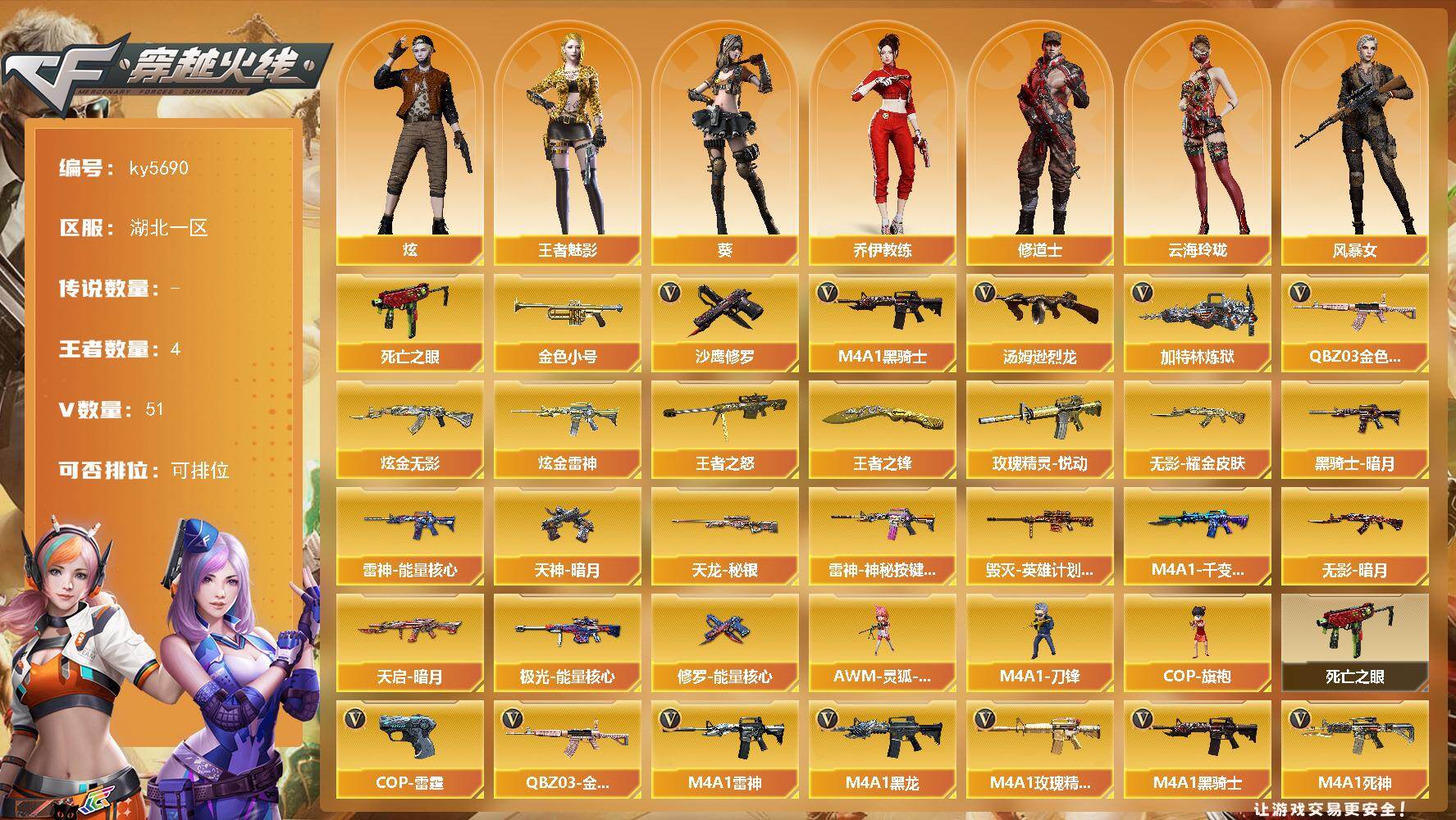 [16917058]湖北一区-54V-4王者武器数-2炫金武器数 【热门武器】:QBZ03-金色蔷薇,死亡之眼,金色小号,M4A1-黑骑士,汤姆逊-烈龙,加特林-炼狱*2,沙鹰-修罗*2 【王者炫金武器】:玫瑰精灵-悦动,王者之怒,王者之锋,炫金无影,炫金雷神 【皮肤】:雷神-能量核心*2,雷神-神秘按键 皮肤,毁灭-英雄计划 皮肤,M4A1-千变-孔明皮肤,黑骑士-暗月*2,无影-暗月,无影耀金皮肤,天启-暗月*2,天龙-秘银,极光-能量核心*2,修罗-能量核心*2,天神-暗月 【角色】:葵,炫,王者-魅影,乔伊教练,修道士,云海玲珑,风暴女,嘉年华灵狐,潘多拉-甜心教官 【人偶武器】:AWM-灵狐-15周年嘉年华,COP-旗袍,M4A1-刀锋 【暴走生化】:死亡之眼 【英雄级武器】:AK47-火麒麟,M4A1-黑龙,M4A1-雷神*3,M4A1-黑骑士,AK47-无影*2,M4A1-死神,AK12-天启,M4A1-武圣,AK47-机械迷城,黑武士-锦绣游龙,M4A1-玫瑰精灵,QBZ03-金色蔷薇,王者之武-觉醒版,AK-47-猩红传说,AWM-天龙*2,Barrett-毁灭*2,Barrett-极光*2,加特林-炼狱*2,汤姆逊-烈龙,沙鹰-修罗*2,沙鹰-天神,COP-雷霆*2,Glock18-武圣,屠龙*3,龙啸,擎天*3,麒麟刺,高爆手雷-雷霆,高爆手雷-竞技荣光,闪光弹-雷霆,闪光弹-竞技荣光,烟雾弹-雷霆,烟雾弹-竞技荣光 【道具】:战舰背包,炫彩背包,超级背包,女皇终结者-魔龙之吻,绿色巨人,灵魂忍者,迷雾幽灵,夺命之镰,防化服*2,金色流光-枪王排位*2,星辰流光-枪王排位,枪王排位28赛季金色流光,枪王排位29赛季金色流光,防弹头盔*2,防弹衣*2,C4工具钳*2,手雷包*2 【特殊枪械】:1黑骑士,1烈龙,2炼狱
