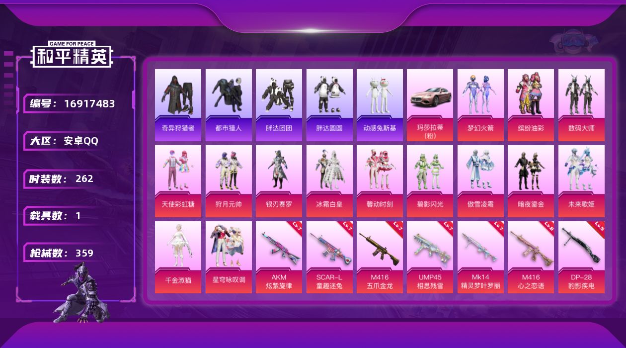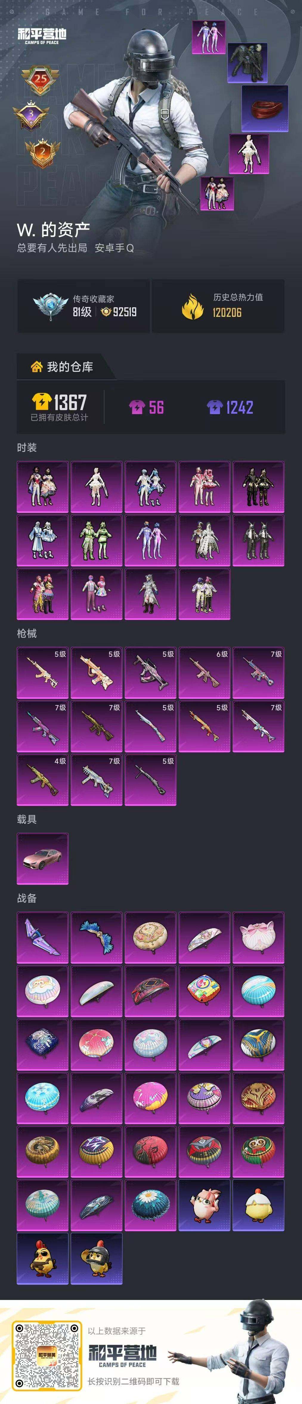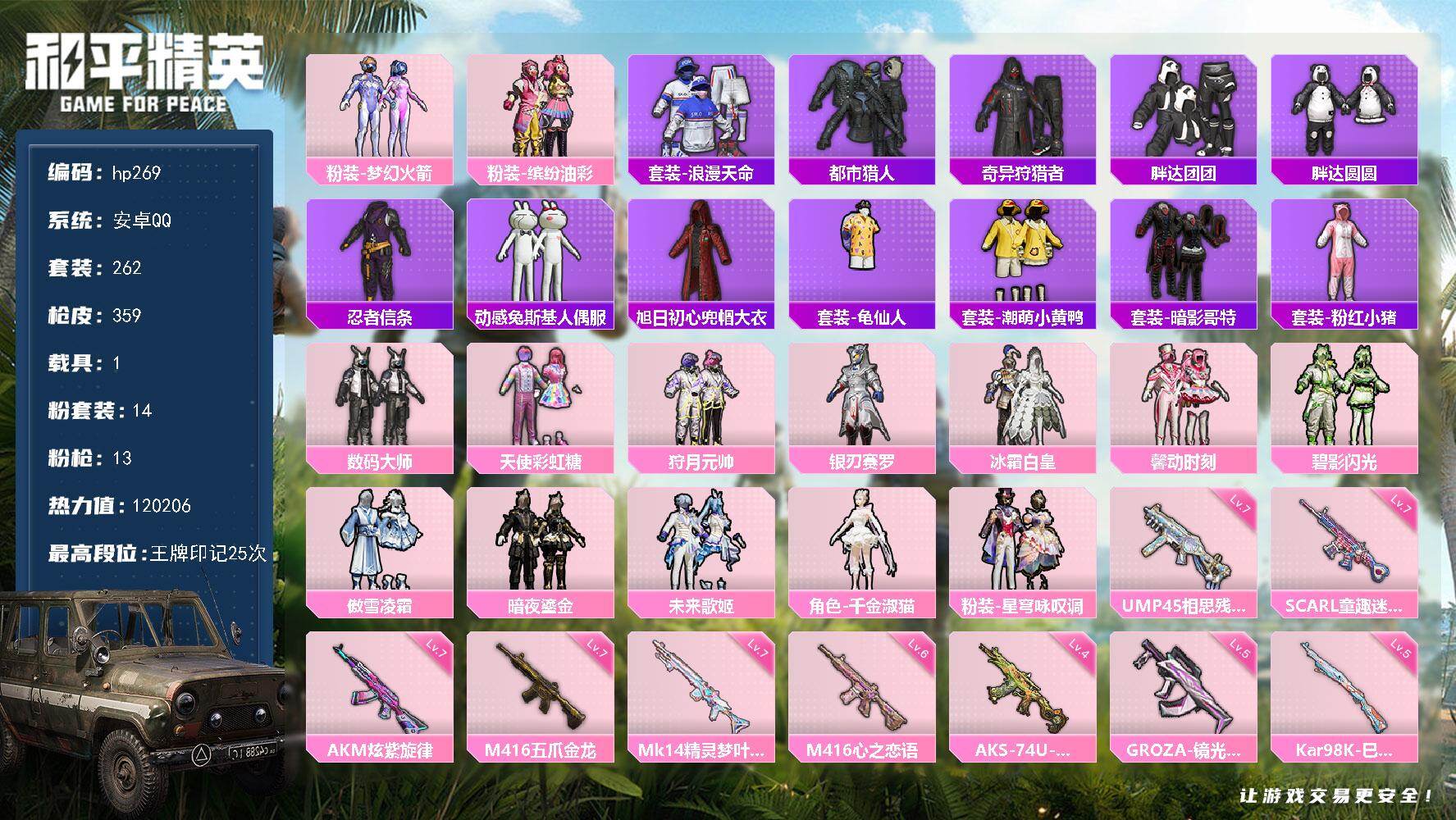 [16917483]安卓 手Q-14粉装-13特效枪-1载具-2粉色飞行器-120206热力值-25王牌印记-262套装-359枪皮