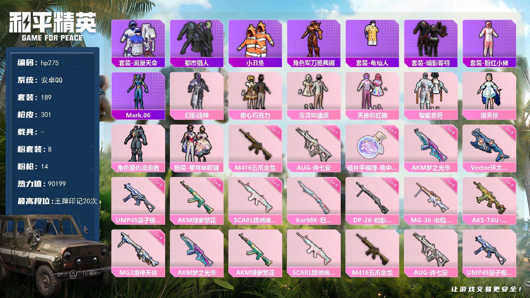 [16919165]安卓 手Q-8粉装-14特效枪-0载具-3粉色飞行器-90199热力值-20王牌印记-189套装-301枪皮