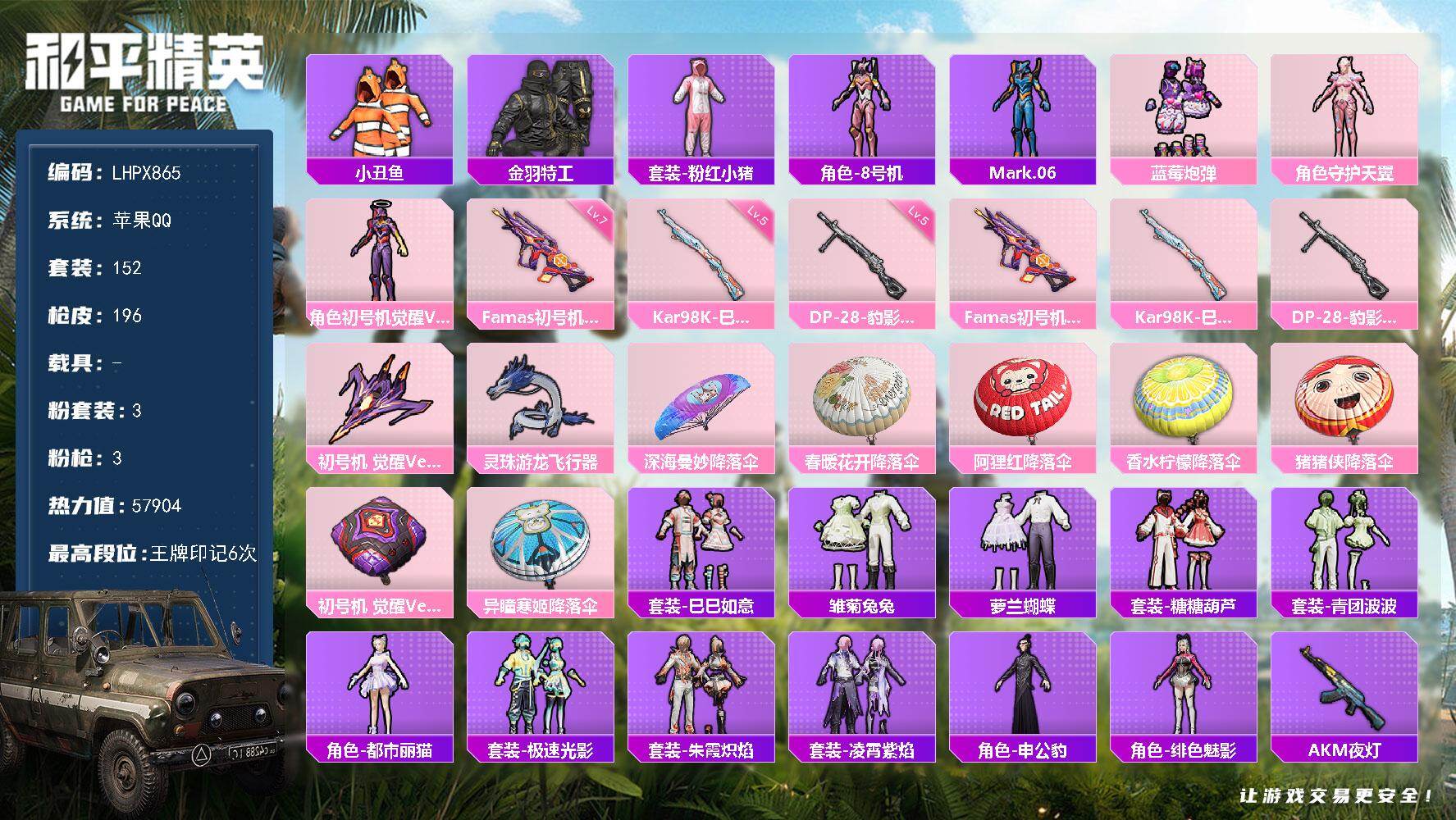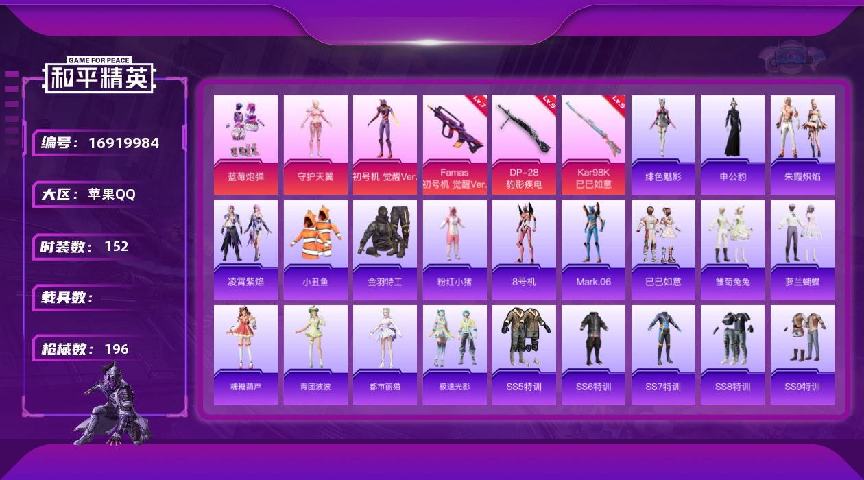 [16919984]苹果 手Q-3粉装-3特效枪-0载具-3粉色飞行器-57904热力值-6王牌印记-152套装-196枪皮 【热门品类】:套装-小丑鱼,套装-金羽特工,套装-粉红小猪,角色-8号机,角色-Mark.06 【粉色套装】:粉装-蓝莓炮弹,角色-守护天翼,角色-初号机 觉醒Ver. 【粉色枪皮等级】:Famas-初号机 觉醒Ver.(七级),Kar98K-巳巳如意(五级),DP-28-豹影疾电(五级) 【粉色枪皮】:Famas-初号机 觉醒Ver.,Kar98K-巳巳如意,DP-28-豹影疾电 【粉色飞行器】:初号机 觉醒Ver.飞行器,灵珠游龙飞行器 【粉色降落伞】:深海曼妙降落伞,春暖花开降落伞,阿狸红降落伞,香水柠檬降落伞,猪猪侠降落伞,初号机 觉醒Ver.降落伞,异瞳寒姬降落伞 【稀有套装】:套装-巳巳如意,套装-雏菊兔兔,套装-萝兰蝴蝶,套装-糖糖葫芦,套装-青团波波,角色-都市丽猫,套装-极速光影,套装-朱霞炽焰,套装-凌霄紫焰,角色-申公豹,角色-绯色魅影 【稀有枪皮】:AKM-夜灯,AKM-奇异狩猎者,AKM-生命誓言,AKM-破晓战魂,AKM-缤纷海域,AKM-萌趣颜团子,AKM-虎虎生威,AKM-锦绣火鲤,AKM-霓虹街区,M16A4-幻世战舞者,M16A4-红色方程式,M16A4-蓝色火焰,SCAR-L-炫彩节奏,SCAR-L-玉兔迎春,SCAR-L-红色方程式,M416-夜灯,M416-红色方程式,M416-蓝色火焰,GROZA-影袭,GROZA-治愈之星,GROZA-黑色刀锋,AUG-天降萌叽,AUG-耀粉歌者,QBZ-彩虹符号,M762-天降萌叽,M762-拳皇97,M762-牛气冲天,M762-瑞龙福将,M762-镭射皇者,AC-VAL-天降萌叽,AC-VAL-快闪甜心,蜜獾-天降萌叽,ARX-凌霄紫焰,UZI-众神之王,UZI-生命誓言,UZI-红色方程式,UMP45-猪猪侠,UMP45-蓝色火焰,UMP45-极意拳锋,Vector-焰鹰斗篷,Vector-PEL轰鸣竞梦者,Vector-彩虹符号,Vector-治愈之星,Vector-生命誓言,Vector-香水柠檬,Vector-黑色刀锋,汤姆逊-勇闯险境,汤姆逊-天降萌叽,汤姆逊-耀粉歌者,MP5K-众神之王,JS9-凌霄紫焰,P90-快闪甜心,Kar98K-勇闯险境,Kar98K-彩