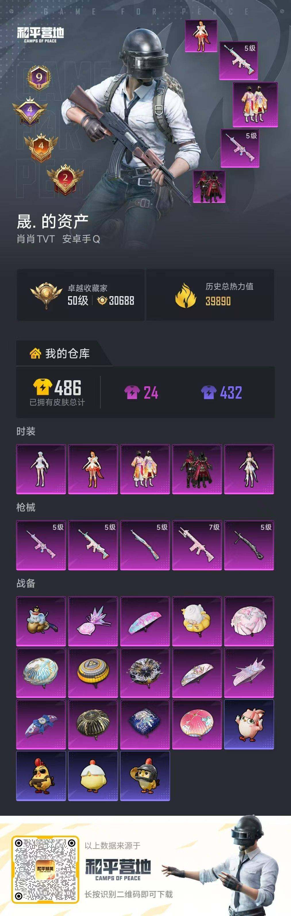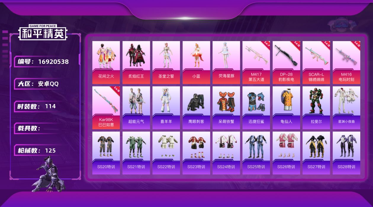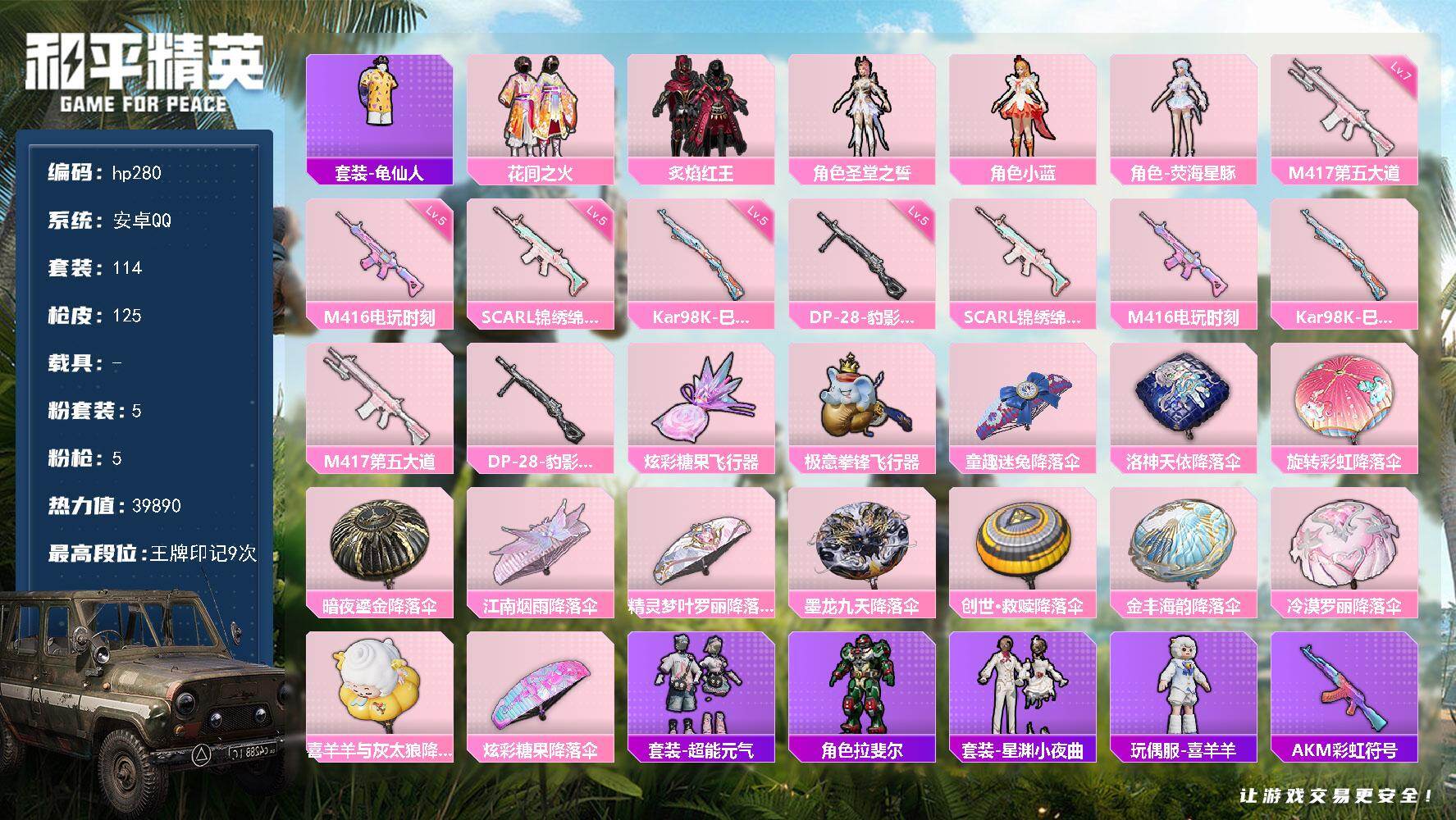 [16920538]安卓 手Q-5粉装-5特效枪-0载具-2粉色飞行器-39890热力值-9王牌印记-114套装-125枪皮