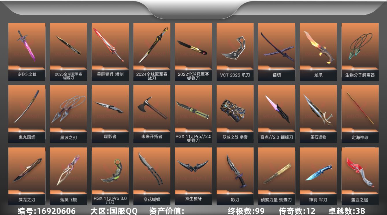[16920606]【极品素材号/店主推荐捡漏号】}【套装】:2025全球冠军赛套装,2024全球冠军赛套装,2022全球冠军赛套装,上古龙炎套装,多弥尔的复仇套装,噬影者套装,VCT 2025 赛季套装,西部未来套装,创·纪元套装,RGX 11z Pro//3.0套装,《双城之战》收藏套装,奇点//2.0套装,回火礼包:奇点套装,般若假面//2.0套装,异鳞魔蛇套装,掠影套装,黑市套装,英雄之选套装,手工达人套装,琉璃幻梦套装【英雄】:幻棱,炼狱,维斯,暮蝶,钛狐,壹决,铁臂,捷风,雷兹,幽影,不死鸟,贤者,猎枭,蝰蛇,零,芮娜,奇乐,尚勃勒,霓虹,斯凯,夜露,星礈,K/O,海神,盖可,黑梦,钢锁【近战武器】:近战武器-2025全球冠军赛 蝴蝶刀,近战武器-2024全球冠军赛 战刀,近战武器-2022全球冠军赛 蝴蝶刀,近战武器-多弥尔之裁,近战武器-穿花蝴蝶,近战武器-RGX 11z Pro//2.0 蝴蝶刀,近战武器-侦察力量 蝴蝶刀,近战武器-奇点//2.0 蝴蝶刀,近战武器-VCT 2025 爪刀,近战武器-紫金爪刀,近战武器-RGX 11z Pro//3.0 爪刀,近战武器-黑波之刃,近战武器-落英飞旋,近战武器-噬影者 簇刃,近战武器-镭切,近战武器-威龙之刃,近战武器-澄湖潋滟,近战武器-夜之蝴蝶,近战武器-鬼丸国纲,近战武器-双生獠牙,近战武器-双城之战 拳套,近战武器-未来开拓者,近战武器-巨神铁甲 短剑,近战武器-龙爪,近战武器-般若长牙,近战武器-彩虹魔力大棒槌,近战武器-超限闪存 匕首,近战武器-超越极限 球棒,近战武器-定海神珍,近战武器-堕天遗武 仪式匕首,近战武器-盖亚之愠,近战武器-硅晶刻刀,近战武器-金角扇,近战武器-琉璃锻梦剑,近战武器-魄月玄刃,近战武器-神罚 军刀,近战武器-生物分子解离器,近战武器-圣石遗物,近战武器-视界洞穿,近战武器-手工达人 战斧,近战武器-天玄刀,近战武器-影刃,近战武器-诡秘蛇影 军刀,近战武器-日耀风暴 遗器,近战武器-星际猎兵 短剑【狂徒】:狂徒-艾沃莉的梦之翼,狂徒-上古龙炎,狂徒-2025全球冠军赛,狂徒-光明哨兵,狂徒-归零者,狂徒-洪荒怒焰,狂徒-混沌序曲,狂徒-机动狂飙,狂徒-奇点//2.0,狂徒-双城之战,狂徒-塑水宗,狂徒-创·纪元,狂徒-噬影者,狂徒-多弥尔的复仇,狂徒-ORA x 颗秒,狂徒-