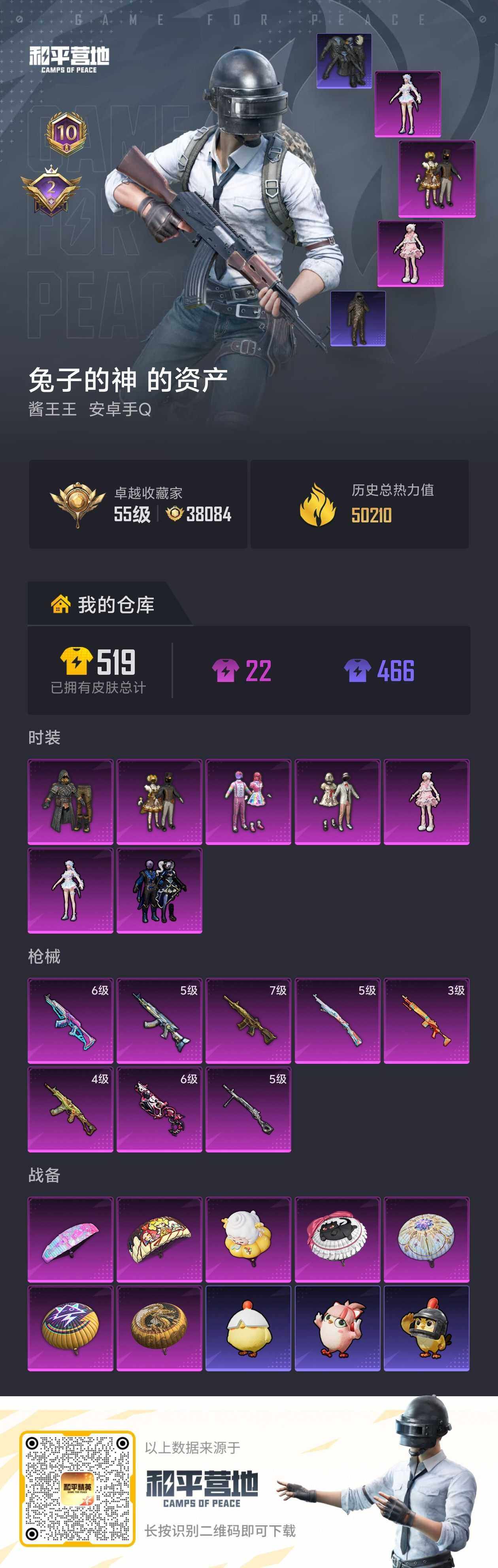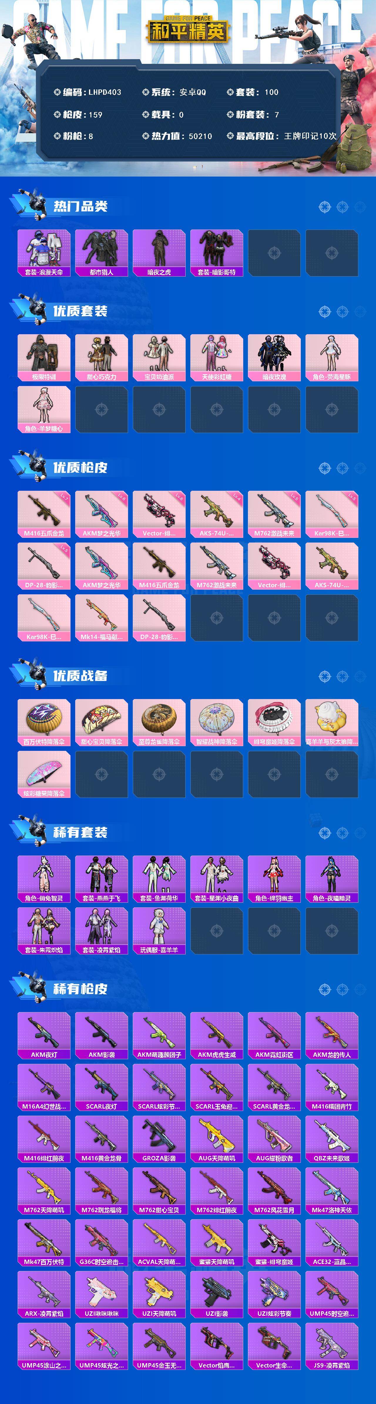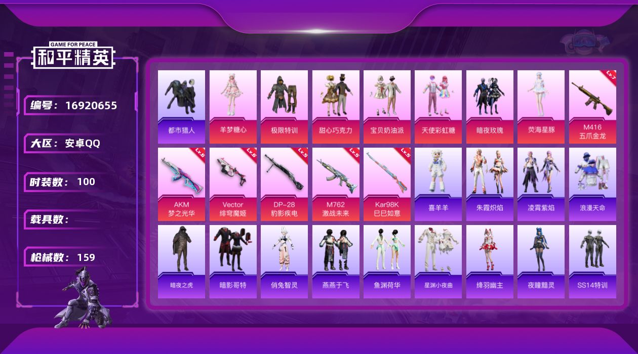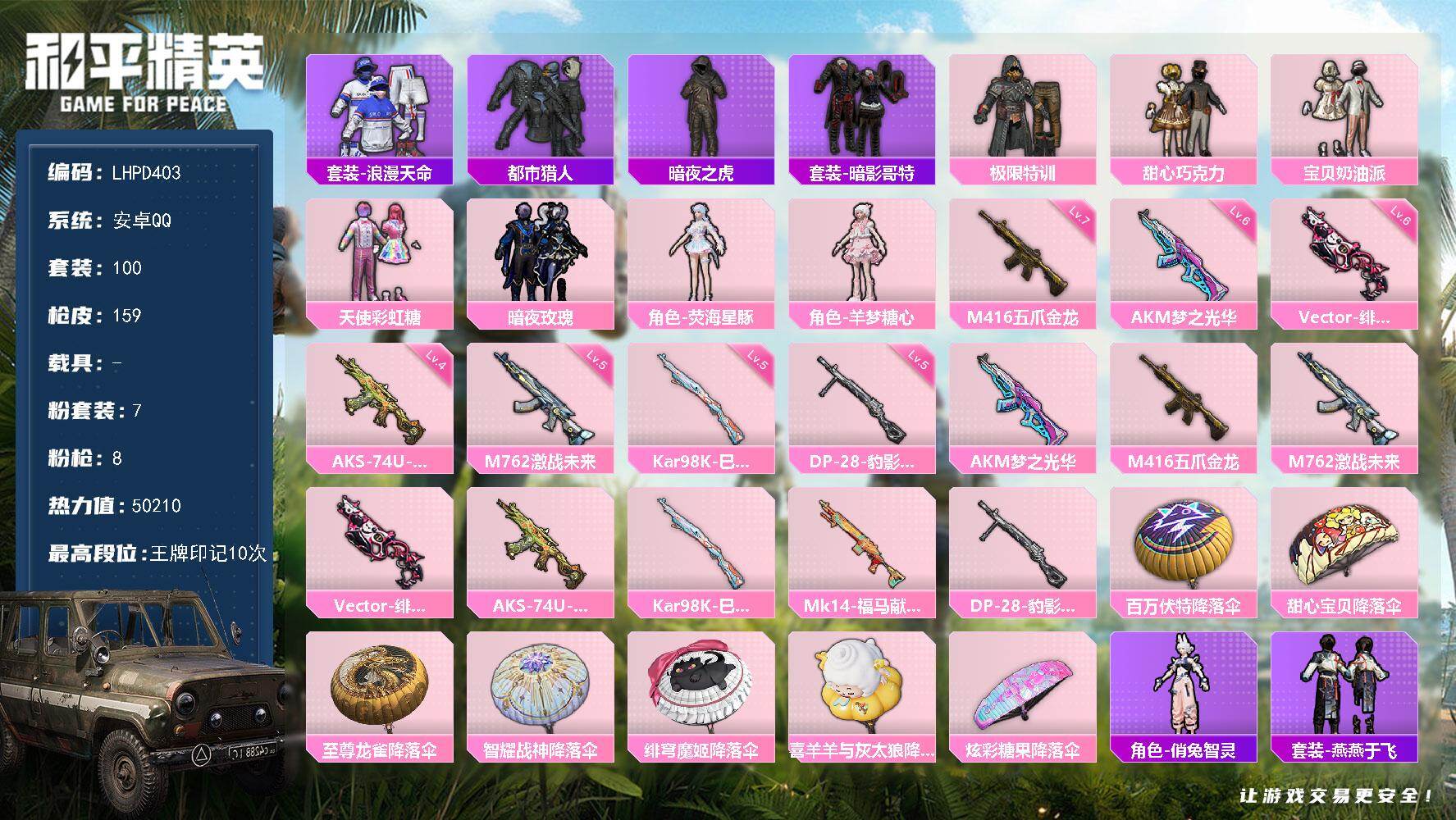 [16920655]【店主推荐捡漏号!可直接换绑】安卓 手Q-7粉装-8特效枪-0载具-0粉色飞行器-50210热力值-10王牌印记-100套装-159枪皮【热门品类】:套装-浪漫天命,套装-都市猎人,套装-暗夜之虎,套装-暗影哥特【粉色套装】:粉装-极限特训,粉装-甜心巧克力,粉装-宝贝奶油派,粉装-天使彩虹糖,粉装-暗夜玫瑰,角色-荧海星豚,角色-羊梦糖心【粉色枪皮等级】:AKM-梦之光华(六级),M416-五爪金龙(七级),M762-激战未来(五级),Vector-绯穹魔姬(六级),AKS-74U-森灵之息(四级),Kar98K-巳巳如意(五级),DP-28-豹影疾电(五级)【粉色枪皮】:AKM-梦之光华,M416-五爪金龙,M762-激战未来,Vector-绯穹魔姬,AKS-74U-森灵之息,Kar98K-巳巳如意,Mk14-福马献瑞,DP-28-豹影疾电