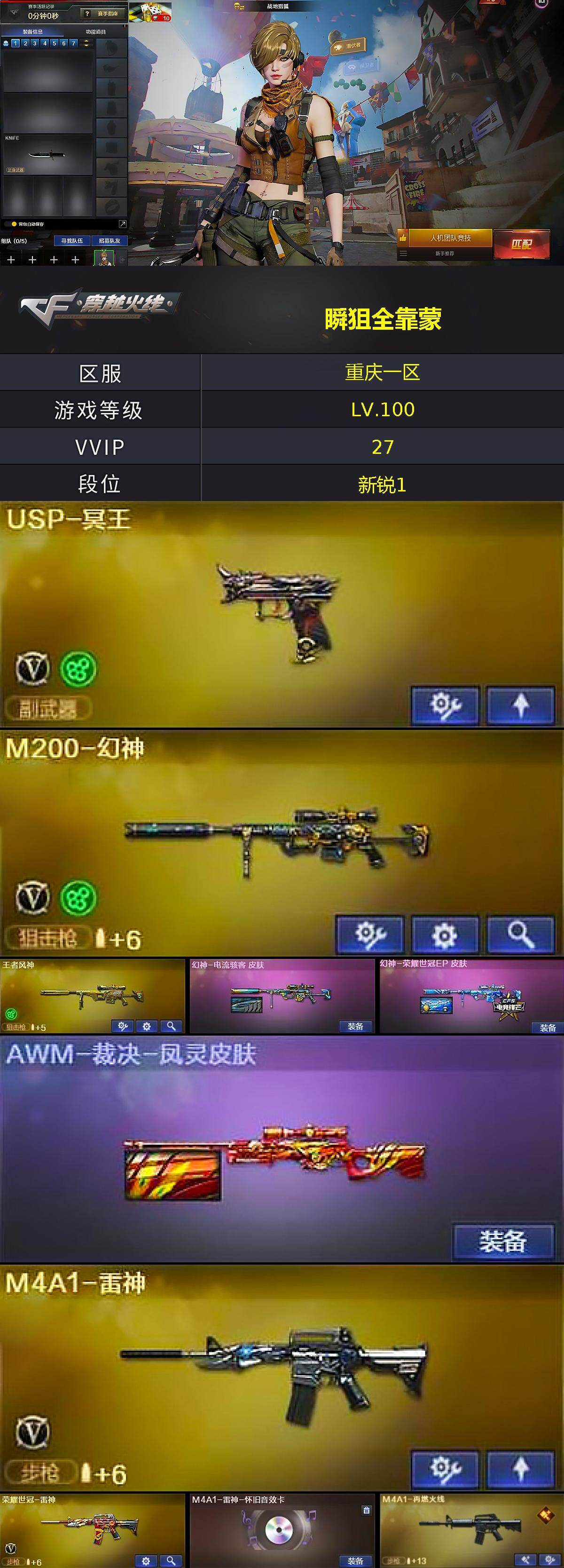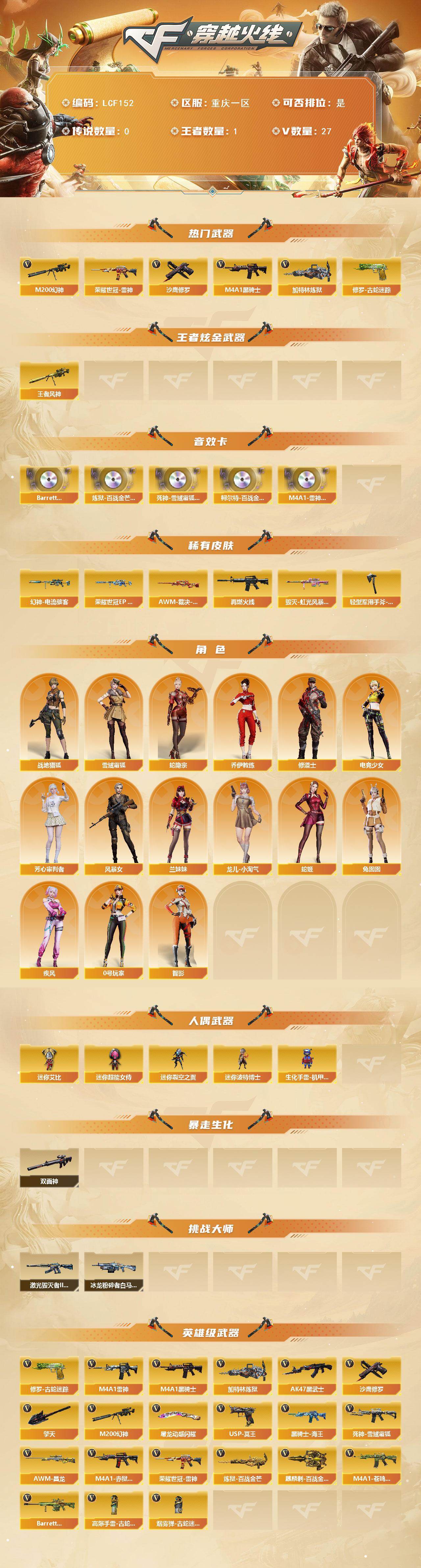 [16920639]重庆一区-24V-1王者武器数-0炫金武器数 【热门武器】:M200-幻神,修罗-古蛇迷踪,荣耀世冠-雷神,M4A1-黑骑士,加特林-炼狱,沙鹰-修罗*2 【王者炫金武器】:王者风神 【音效卡】:Barrett-碧霄极光音效卡*2,炼狱-百战金芒-庆典舞曲音效卡,死神-雪域霜狐-怀旧音效卡,柯尔特-百战金芒-庆典舞曲音效卡,M4A1-雷神-怀旧音效卡 【皮肤】:幻神-电流骇客 皮肤,幻神-荣耀世冠EP 皮肤,AWM-裁决-凤灵皮肤,M4A1-再燃火线,毁灭-虹光风暴 皮肤,轻型军用手斧-再燃火线 【角色】:战地猎狐,雪域霜狐,蛇隐宗,乔伊教练,修道士,电竞少女,芳心审判者,风暴女,疾风,兰妹妹,0号玩家,龙儿-小淘气,蛇姬,兔囡囡,智影 【人偶武器】:迷你裂空之翼,迷你波特博士,生化手雷-机甲核心*4,迷你艾比,迷你超能女侍 【暴走生化】:双面神 【挑战大师】:冰龙粉碎者-白马银枪,激光毁灭者III-白马银枪 【英雄级武器】:M4A1-雷神,M4A1-黑骑士,AK47-黑武士,死神-雪域霜狐,黑骑士-海王,荣耀世冠-雷神,M200-幻神,加特林-炼狱,炼狱-百战金芒,沙鹰-修罗*2,USP-冥王,修罗-古蛇迷踪,擎天,屠龙-动感闪耀,麒麟刺-百战金芒,高爆手雷-古蛇迷踪,烟雾弹-古蛇迷踪,M4A1-赤狱骑士,M4A1-苍鸣雷神,AWM-昌龙,Barrett-碧霄极光 【道具】:BS战队炫彩背包,CFS限定背包,云山科技背包,亚洲杯纪念炫彩背包,古蛇迷踪炫彩背包,女皇终结者-背包,牛魔王背包-至尊黄金,百战金芒炫彩背包,超级背包,雪域霜狐炫彩背包,黄金曼提柯尔的背包,圣拳猎手-炽雪,女皇终结者-魔龙之吻,救世主-黑桃战神,绿色巨人,灵魂忍者*2,迷雾幽灵*2,夺命之镰,防化服*3,流光-再燃火线,枪王排位28赛季金色流光,枪王排位29赛季金色流光,语音特效-盛典烟火,语音特效-怀旧,古蛇迷踪打击特效,雪域霜狐表情,蛇隐宗表情,萌萌小葵表情,EP战队名片,EP战队喷图,EP战队击杀图标*2,防弹头盔*3,防弹衣*3,C4工具钳*3,手雷包*3 【特殊枪械】:1黑骑士,1炼狱