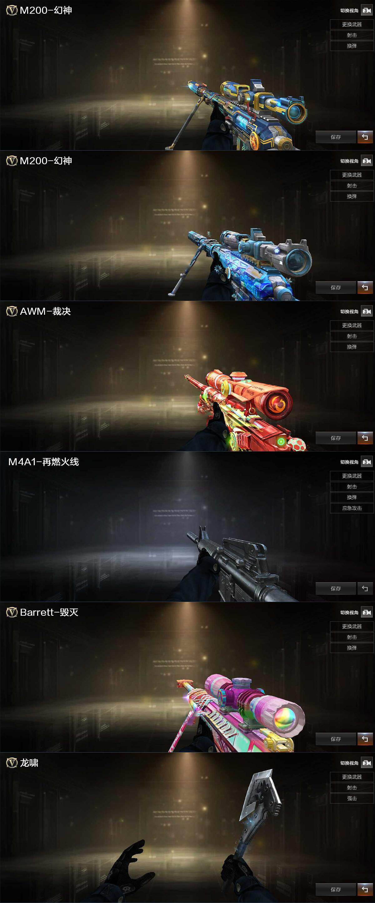 【英雄级武器】:M4A1-雷神,M4A1-黑骑士,AK47-黑武士,死神-雪域霜狐,黑骑士-海王,荣耀世冠-雷神,M200-幻神,加特林-炼狱,炼狱-百战金芒,沙鹰-修罗*2,USP-冥王,修罗-古蛇迷踪,擎天,屠龙-动感闪耀,麒麟刺-百战金芒,高爆手雷-古蛇迷踪,烟雾弹-古蛇迷踪,M4A1-赤狱骑士,M4A1-苍鸣雷神,AWM-昌龙,Barrett-碧霄极光