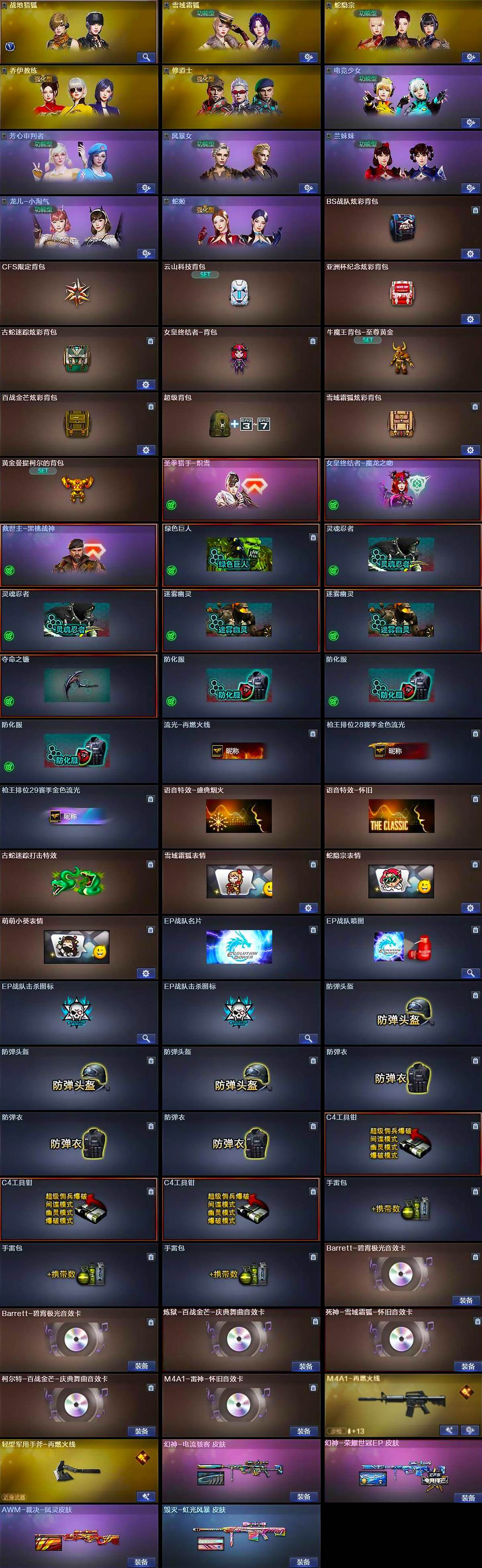 【道具】:BS战队炫彩背包,CFS限定背包,云山科技背包,亚洲杯纪念炫彩背包,古蛇迷踪炫彩背包,女皇终结者-背包,牛魔王背包-至尊黄金,百战金芒炫彩背包,超级背包,雪域霜狐炫彩背包,黄金曼提柯尔的背包,圣拳猎手-炽雪,女皇终结者-魔龙之吻,救世主-黑桃战神,绿色巨人,灵魂忍者*2,迷雾幽灵*2,夺命之镰,防化服*3,流光-再燃火线,枪王排位28赛季金色流光,枪王排位29赛季金色流光,语音特效-盛典烟火,语音特效-怀旧,古蛇迷踪打击特效,雪域霜狐表情,蛇隐宗表情,萌萌小葵表情,EP战队名片,EP战队喷图,EP战队击杀图标*2,防弹头盔*3,防弹衣*3,C4工具钳*3,手雷包*3