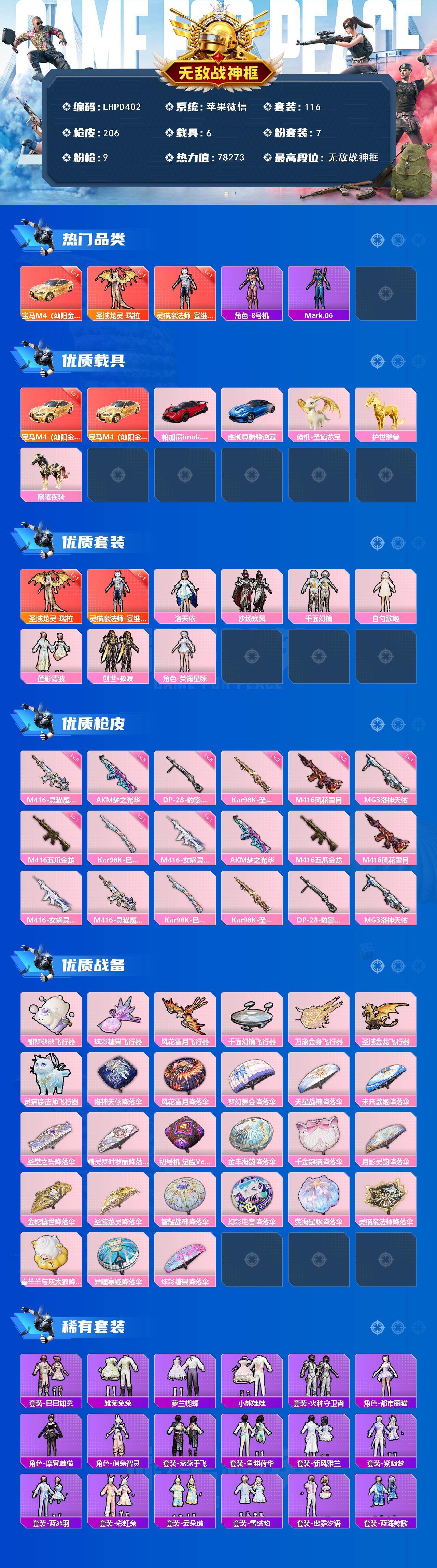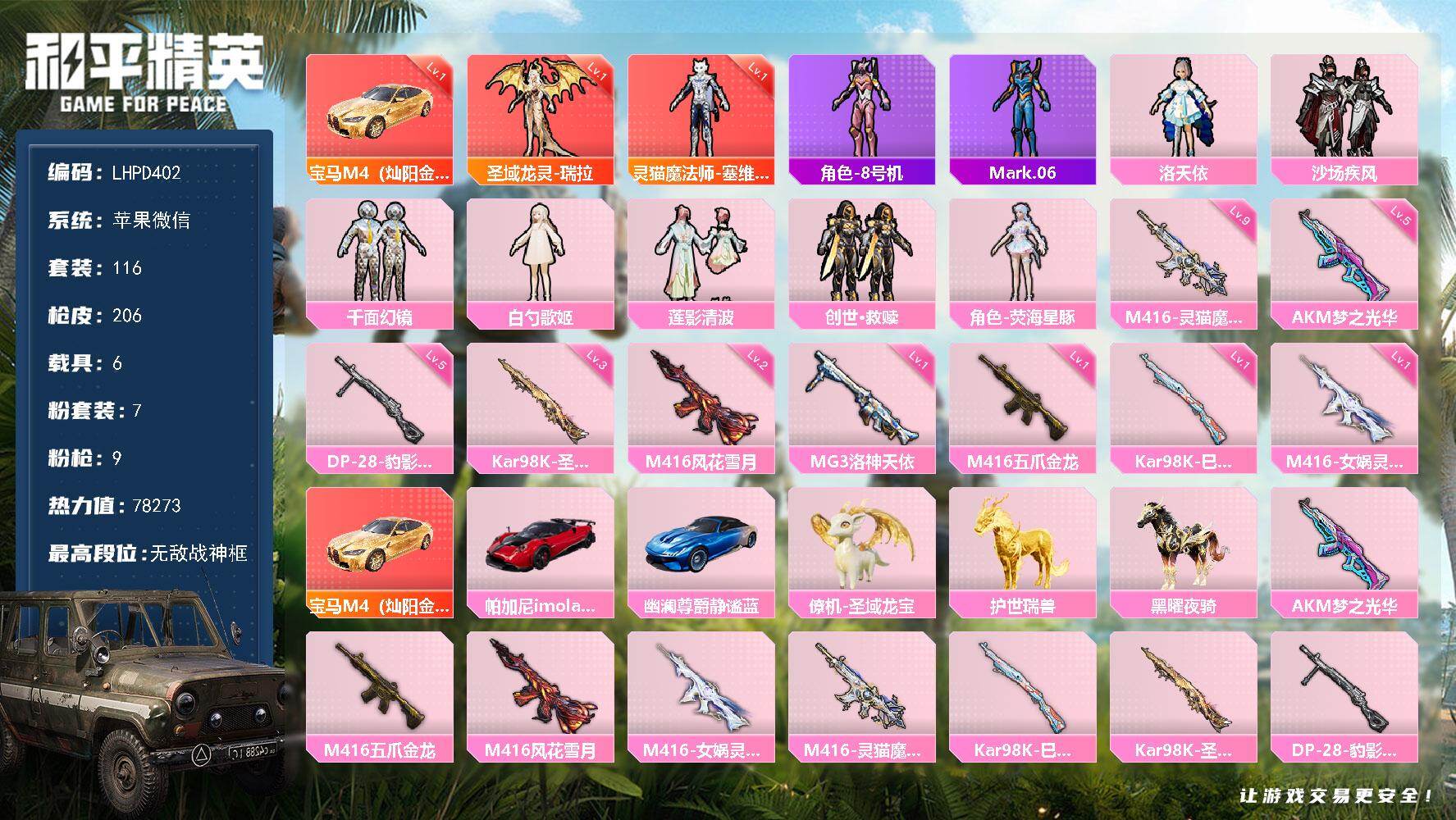 [16920680]【店主推荐捡漏号!可直接换绑】苹果 微信-无敌战神框-3神装-7粉装-9特效枪-6载具-8粉色飞行器-78273热力值-13王牌印记-116套装-206枪皮【红色载具】:宝马M4(灿阳金)(一级)【红色神装等级】:灵驹仙姬-云歌(四级),灵猫魔法师-塞维尔(一级),圣域龙灵-瑞拉(一级)【红色角色神装】:灵驹仙姬-云歌,灵猫魔法师-塞维尔,圣域龙灵-瑞拉【热门品类】:角色-8号机,角色-Mark.06【粉色套装】:角色-洛天依,粉装-沙场疾风,粉装-千面幻镜,角色-白勺歌姬,粉装-莲影清波,套装-创世·救赎,角色-荧海星豚【粉色枪皮等级】:AKM-梦之光华(五级),M416-五爪金龙(一级),M416-风花雪月(二级),M416-女娲灵识(一级),M416-灵猫魔法师(九级),Kar98K-巳巳如意(一级),Kar98K-圣域龙灵(三级),DP-28-豹影疾电(五级),MG3-洛神天依(一级)【粉色载具】:宝马M4(灿阳金),帕加尼imola(光影红),幽澜尊爵(静谧蓝),僚机-圣域龙宝,护世瑞兽,黑曜夜骑,九霄玄鹿【粉色枪皮】:AKM-梦之光华,M416-五爪金龙,M416-风花雪月,M416-女娲灵识,M416-灵猫魔法师,Kar98K-巳巳如意,Kar98K-圣域龙灵,DP-28-豹影疾电,MG3-洛神天依【粉色飞行器】:酣梦熊熊飞行器,炫彩糖果飞行器,风花雪月飞行器,千面幻镜飞行器,万象金身飞行器,圣域金龙飞行器,灵猫魔法师飞行器,云梦轻舟飞行器