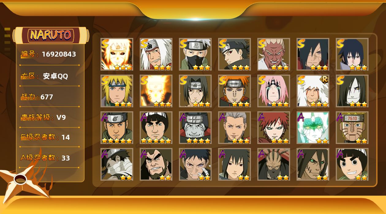 [16920843]14S级忍者数-33A级忍者数 【S级忍者】:宇智波斑「秽土转生·解」(3星),春野樱「忍界大战」(3星),艾「忍界大战」(3星),宇智波鼬「须佐能乎」(3星),宇智波止水「须佐能乎」(3星),旗木卡卡西「须佐能乎」(3星),自来也「舞之豪杰」(3星),大蛇丸(3星),自来也「传说中的三忍」(3星),波风水门(3星),漩涡鸣人「九喇嘛连结」(3星),佩恩「天道」(3星),宇智波佐助「永恒万花筒」(3星),波风水门「九喇嘛连结」(3星) 【A级忍者】:艾「青年」(2星),长门「青年」(2星),波风水门「青年」(2星),迪达拉(2星),迪达拉「秽土转生」(2星),飞段(3星),飞段「死司凭血」(2星),干柿鬼鲛(4星),漩涡博人「桃式显现」(2星),机械鸣人「初始形态」(2星),迈特凯(5星),桃地再不斩「秽土转生」(2星),我爱罗「疾风传」(3星),蝎(2星),蝎「绯流琥」(2星),角都「秽土转生」(2星),猿飞阿斯玛(5星),宇智波鼬(2星),宇智波佐助「须佐能乎」(2星),宇智波佐助「万花筒写轮眼」(2星),照美冥「五代目水影」(2星),日向宁次「忍界大战」(2星),日向雏田「最终章」(2星),宇智波带土「漂泊浪客」(2星),长十郎「六代目水影」(2星),佩恩·六道「漂泊浪客」(2星),李洛克「忍界大战」(2星),秋道丁次「忍界大战」(2星),千代「近松十人卫」(2星),神农「羁绊」(2星),不缘(2星),宇智波泉奈(2星),巳月「仙人模式」(2星)