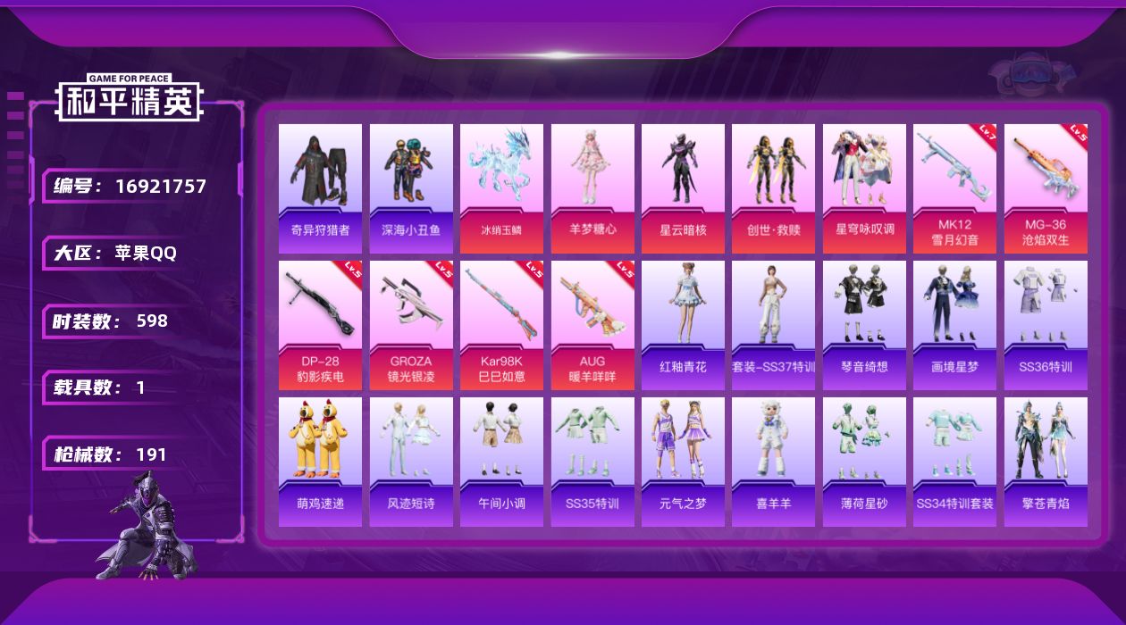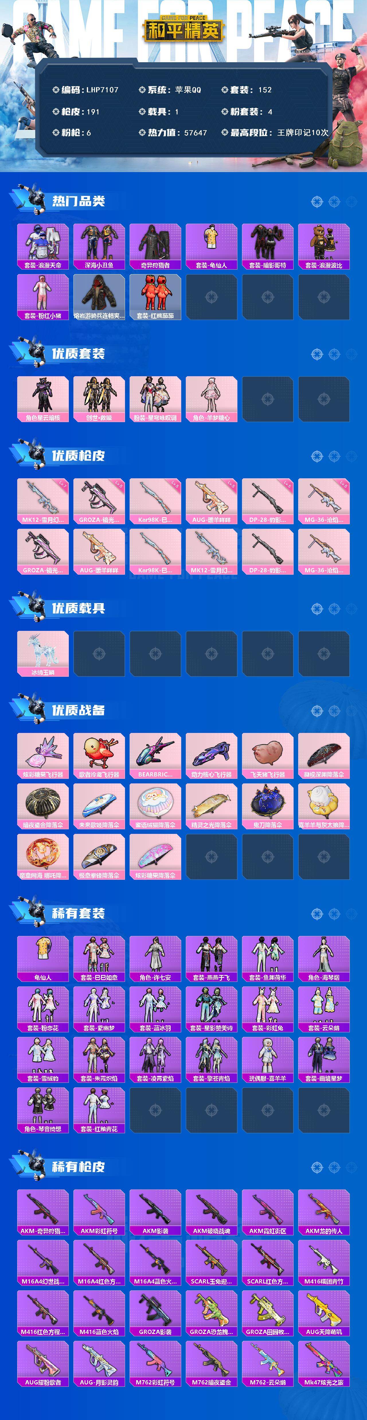 [16921757]"苹果 手Q-4粉装-6特效枪-1载具-5粉色飞行器-57647热力值-10王牌印记-152套装-191枪皮