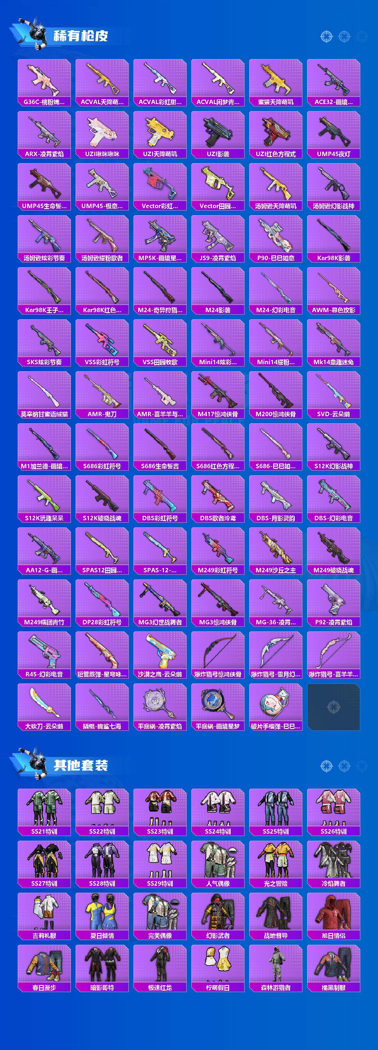 【稀有枪皮】:AKM-奇异狩猎者,AKM-彩虹符号,AKM-影袭,AKM-破晓战魂,AKM-霓虹街区,AKM-龙的传人,M16A4-幻世战舞者,M16A4-红色方程式,M16A4-蓝色火焰,SCAR-L-玉兔迎春,SCAR-L-红色方程式,M416-糯团青竹,M416-红色方程式,M416-蓝色火焰,GROZA-影袭,GROZA-恐龙拽拽,GROZA-田园牧歌,AUG-天降萌叽,AUG-耀粉歌者,AUG-月影灵韵,M762-彩虹符号,M762-暗夜鎏金,M762-云朵鹅,Mk47-炫光之旅,G36C-桃粉嫣然,AC-VAL-天降萌叽,AC-VAL-彩虹甜喵,AC-VAL-闲梦青缨,蜜獾-天降萌叽,ACE32-画境星梦,ARX-凌霄紫焰,UZI-啾咪啾咪,UZI-天降萌叽,UZI-影袭,UZI-红色方程式,UMP45-夜灯,UMP45-生命誓言,UMP45-极意拳锋,Vector-彩虹符号,Vector-田园牧歌,汤姆逊-天降萌叽,汤姆逊-幻影战神,汤姆逊-炫彩节奏,汤姆逊-耀粉歌者,MP5K-画境星梦,JS9-凌霄紫焰,P90-巳巳如意,Kar98K-影袭,Kar98K-王子的夏天,Kar98K-红色方程式,M24-影袭,M24-奇异狩猎者,M24-幻彩电音,AWM-暮色玫影,SKS-炫彩节奏,VSS-彩虹符号,VSS-田园牧歌,Mini14-炫彩节奏,Mini14-耀粉歌者,Mk14-童趣迷兔,莫辛纳甘-蜜语绒猫,AMR-喜羊羊与灰太狼,AMR-鬼刀,M417-惊鸿侠骨,M200-惊鸿侠骨,SVD-云朵鹅,M1加兰德-画境星梦