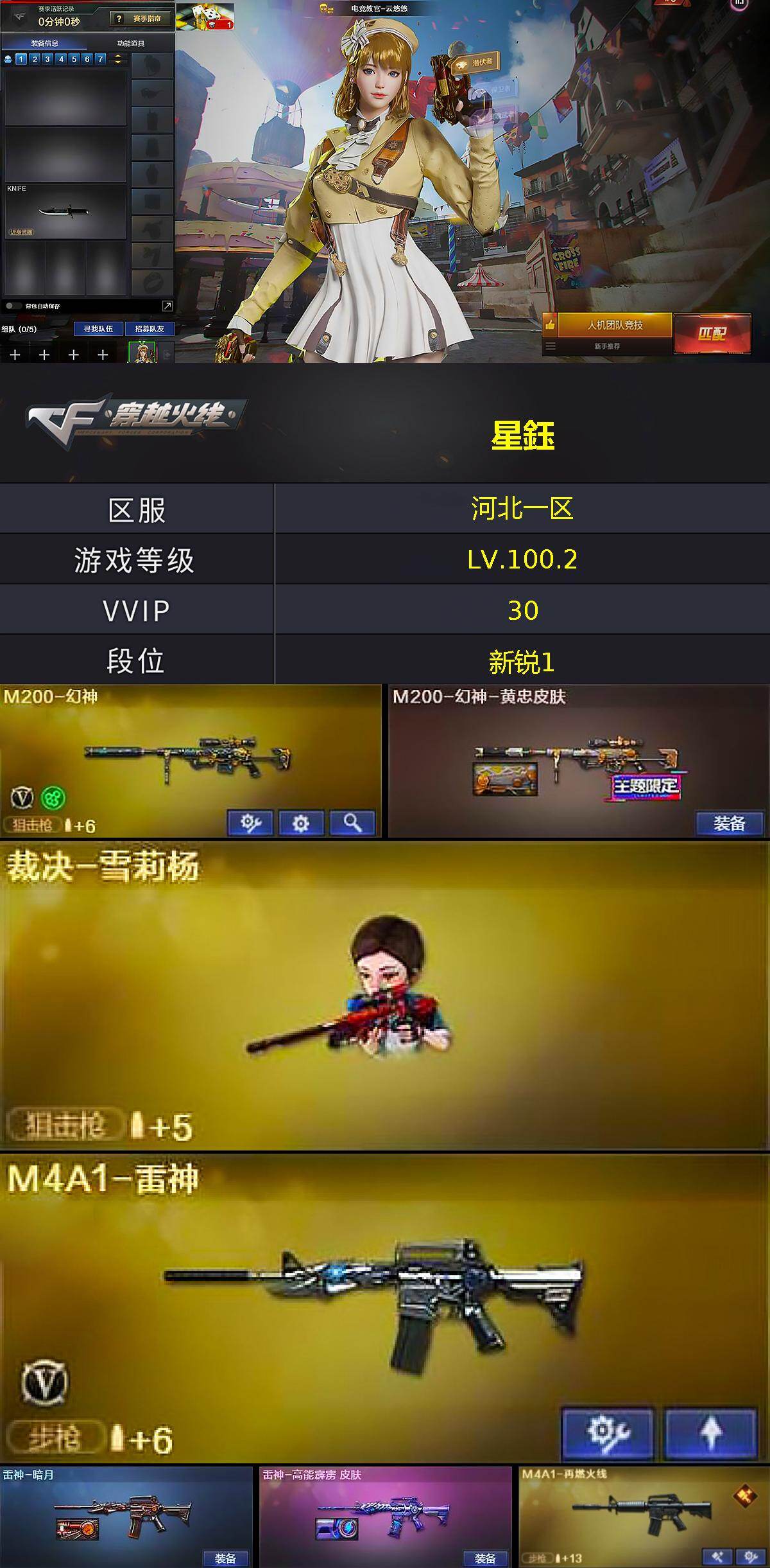 [16922122]河北一区-31V-1王者武器数-1炫金武器数 【热门武器】:M200-幻神,裁决-雪莉杨,沙鹰-修罗 【王者炫金武器】:炫金毁灭 【音效卡】:沙鹰-修罗-盛典舞曲音效卡*2,炼狱-百战金芒-庆典舞曲音效卡 【皮肤】:M200-幻神-黄忠皮肤,雷神-暗月,雷神-高能霹雳 皮肤,M4A1-再燃火线,毁灭-战神张飞,毁灭-虹光风暴 皮肤,毁灭-英雄计划 皮肤,轻型军用手斧-再燃火线 【角色】:电竞教官-云悠悠,王者葵-惊若翩鸿,奇洋探员,乔伊教练,云海玲珑,暗夜-X,电竞少女,风暴女,虎妞,灵狐者-X,灵狐者-黄金海岸,流浪蔷薇,麻雀,潘多拉-甜心教官,潜龙队-X,斯沃特-X,兔囡囡,新娜塔莎,雪莉杨-摸金校尉,游珑儿 【人偶武器】:裁决-雪莉杨,天龙-乔伊教练,巴雷特-零-水下丽影,AWM-灵狐-15周年嘉年华,迷你牛牛,生化手雷-机甲核心,M37-奇洋探员,灵狐娃娃手雷 【暴走生化】:超级对讲机 【挑战大师】:冰龙粉碎者-白马银枪,激光毁灭者III-白马银枪,激光毁灭者III 【英雄级武器】:M4A1-雷神,黑武士-锦绣游龙,王者之势-觉醒版,Barrett-毁灭,M200-幻神,炼狱-百战金芒,沙鹰-修罗,沙鹰-天神*2,龙啸-热带奇洋,麒麟刺-百战金芒,高爆手雷-竞技荣光,高爆手雷-云龙*3,手雷-热带奇洋,闪光弹-竞技荣光*2,闪光弹-云龙*2,烟雾弹-竞技荣光,烟雾弹-云龙*2,M4A1-赤狱骑士 【道具】:CFS限定背包,亚洲杯纪念炫彩背包,奇洋探员-海龟背包,次元之矛-背包,百战金芒炫彩背包,超级背包,女皇终结者-魔龙之吻,救世主-黑桃战神,绿色巨人,灵魂忍者*2,变异宝贝,迷雾幽灵*2,生化弹匣,夺命之镰,防化服*2,金色流光-枪王排位*2,星辰流光-枪王排位,流光-鎏金之域,流光-再燃火线,枪王排位28赛季金色流光,枪王排位29赛季金色流光,语音特效-盛典烟火,萌萌小葵表情,EP战队名片,EP战队喷图,防弹头盔*5,防弹衣*5,C4工具钳*5,手雷包*5
