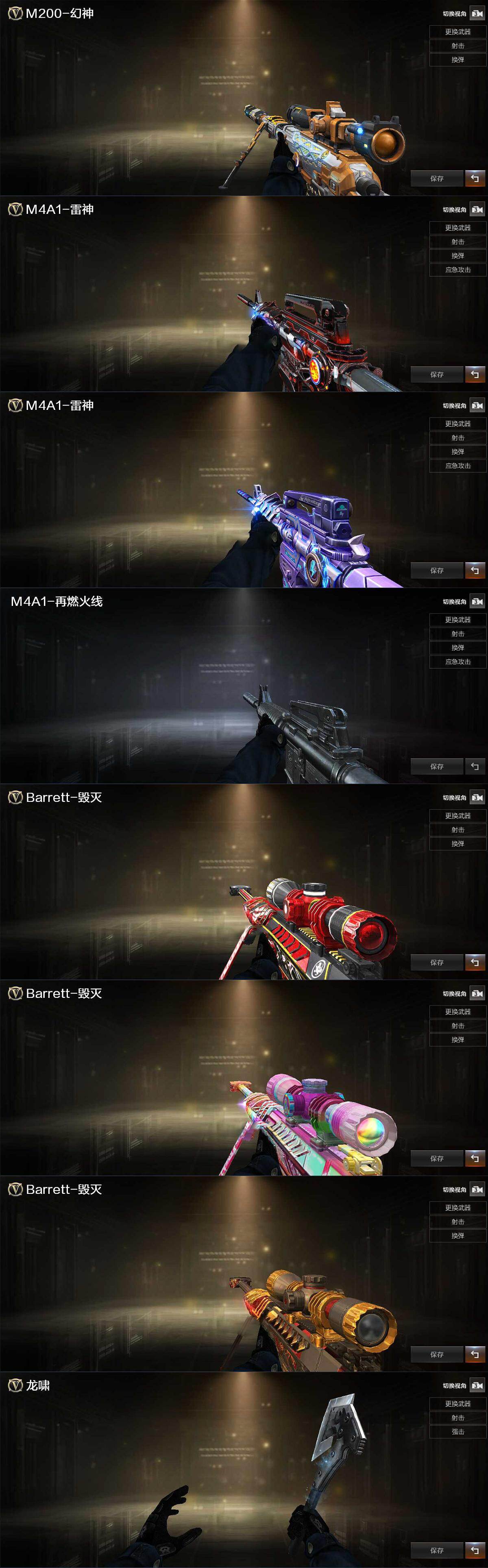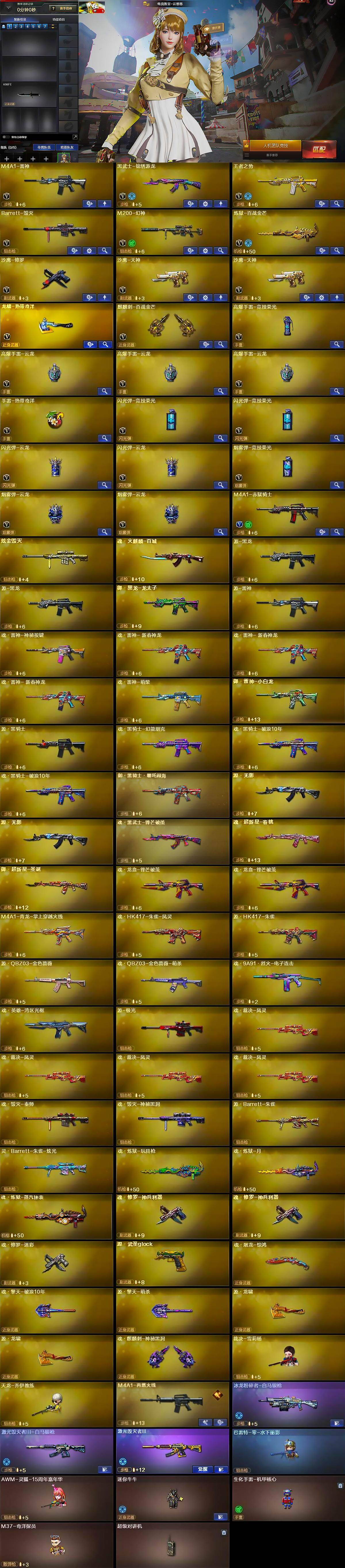 【英雄级武器】:M4A1-雷神,黑武士-锦绣游龙,王者之势-觉醒版,Barrett-毁灭,M200-幻神,炼狱-百战金芒,沙鹰-修罗,沙鹰-天神*2,龙啸-热带奇洋,麒麟刺-百战金芒,高爆手雷-竞技荣光,高爆手雷-云龙*3,手雷-热带奇洋,闪光弹-竞技荣光*2,闪光弹-云龙*2,烟雾弹-竞技荣光,烟雾弹-云龙*2,M4A1-赤狱骑士