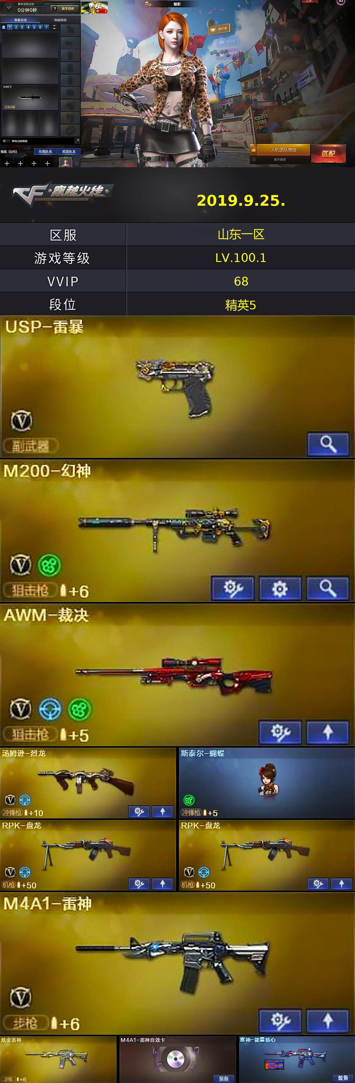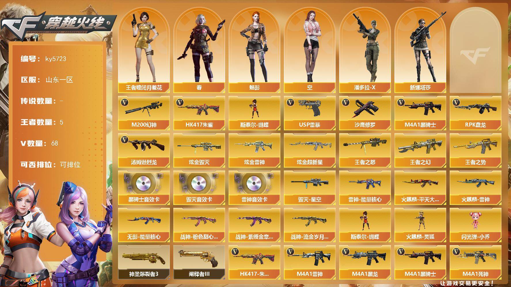 [16870555]山东一区-70V-5王者武器数-3炫金武器数 【热门武器】:HK417-朱雀,M200-幻神,M4A1-黑骑士,汤姆逊-烈龙,RPK-盘龙*2,斯泰尔-蝴蝶,USP-雷暴,沙鹰-修罗*2 【王者炫金武器】:王者之幻,王者之势,王者之怒,炫金雷神,炫金超新星,炫金毁灭 【音效卡】:M4A1-雷神音效卡,M4A1-黑骑士音效卡,Barrett-毁灭音效卡 【皮肤】:雷神-能量核心,火麒麟-雷神,火麒麟-平天大圣,毁灭-星空,无影-能量核心*2,战神-粉色甜心皮肤,战神-紫绶金章皮肤*5,战神-流金岁月皮肤*4 【角色】:魅影,春,王者-瞳-闭月羞花,空,潘多拉-X,新娜塔莎 【人偶武器】:火麒麟-灵狐*2,斯泰尔-蝴蝶,闪光弹-小乔 【挑战大师】:神圣爆裂者III,阐释者III 【英雄级武器】:AK47-火麒麟,M4A1-黑龙,M4A1-雷神,M4A1-黑骑士,AK47-无影,M4A1-死神*2,AK47-黑武士,AK12-天启,M4A1-武圣,AK47-黑鲨,M4A1-龙血,AK47-雷暴,HK417-朱雀,AK-47-猩红传说*6,AK47-B-战神,Barrett-毁灭*3,Barrett-极光,AWM-裁决,M200-幻神,RPK-盘龙*2,汤姆逊-烈龙,AA-12-雷霆,沙鹰-修罗*2,沙鹰-天神,USP-雷暴,屠龙*2,擎天*2,麒麟刺*4,斩神刀-雷暴,王者之锋-觉醒版*2,高爆手雷-雷暴*7,闪光弹-雷暴*7,烟雾弹-雷暴*7 【道具】:炫彩背包,超级背包,变异宝贝,夺命之镰,防化服,流光-鎏金之域,防弹头盔,防弹衣*2,C4工具钳,手雷包 【特殊枪械】:蝴蝶斯泰尔+1烈龙,1黑骑士,1烈龙,2盘龙,1蝴蝶斯泰尔